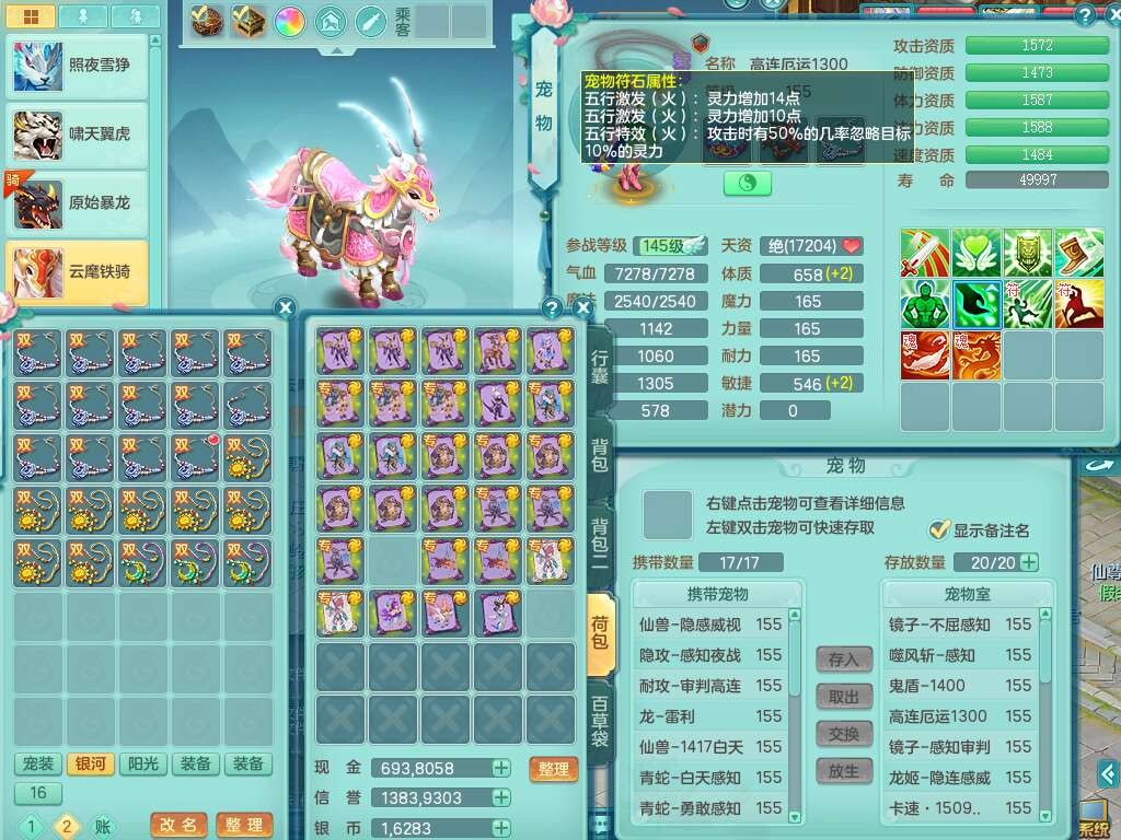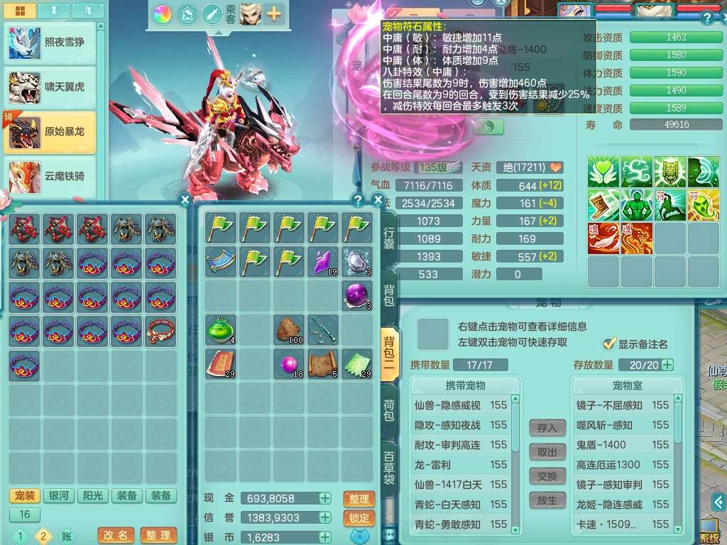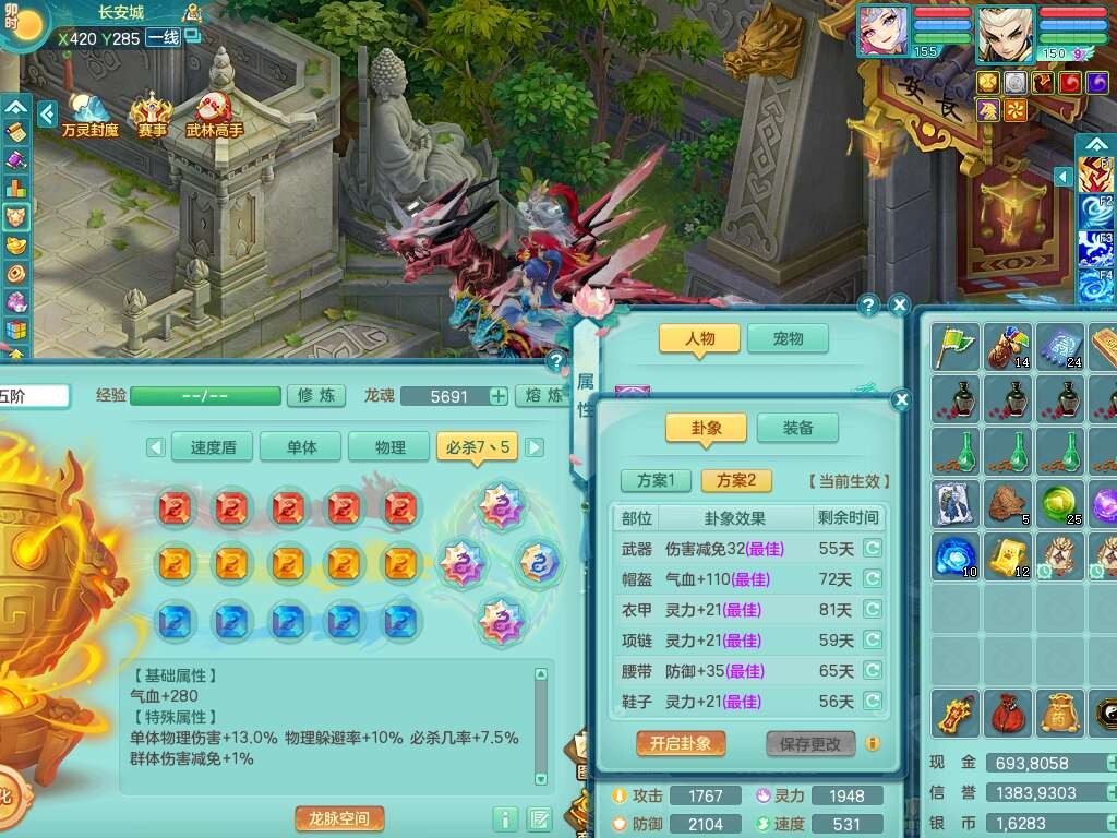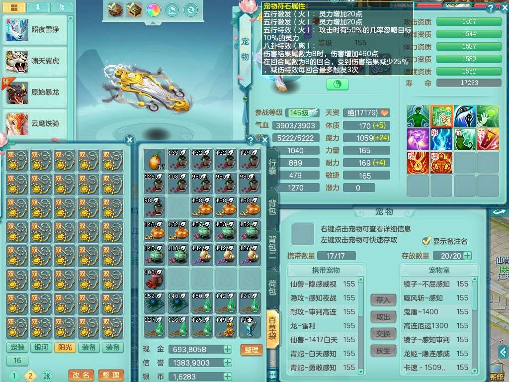 a22327天下无双159男龙宫,精灵舞,5龙1龙皮,3内胆神(2蛇1马),1破镜,【17觉醒,已潜龙】,4位靓号不含4,5宠皮,4特殊(怒破,舍身,禁锢,噬风),5只六技能镜花灵,1只六技能龙姬,伤害四溅五雷单加武器,易成长单加51衣服,272易成长净心术单加54链子,易成长单加57腰带,有法缭鞋子,法爆单加武器,5.5基础鼎+280血,15个永久格子,20个纯六字,1个五字,28只满果子,宠排在榜,7只坐骑,暴龙泰坦+神驹马上发财,冰晶庭院,带82天月卡。