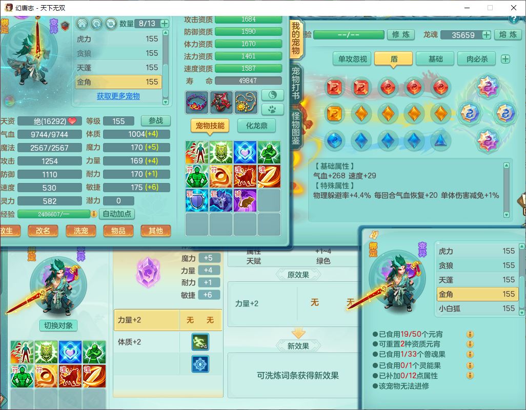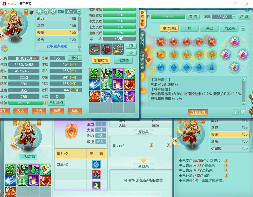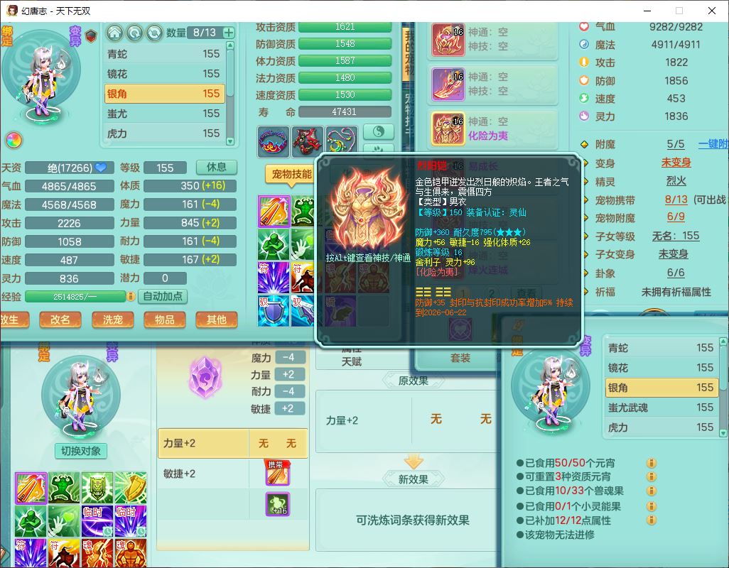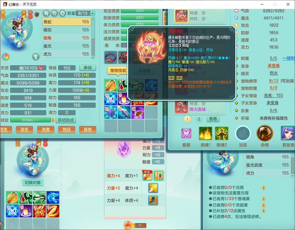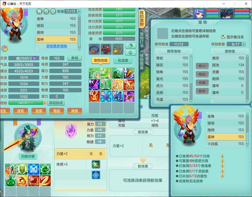 tx10429天下无双159男魔王1小精灵,1青蛇(无内)14只成品满高书宝宝,1孩子(无名),装备齐全,260多w神武币,1页多还童丹,有秘方药,1飞行坐骑