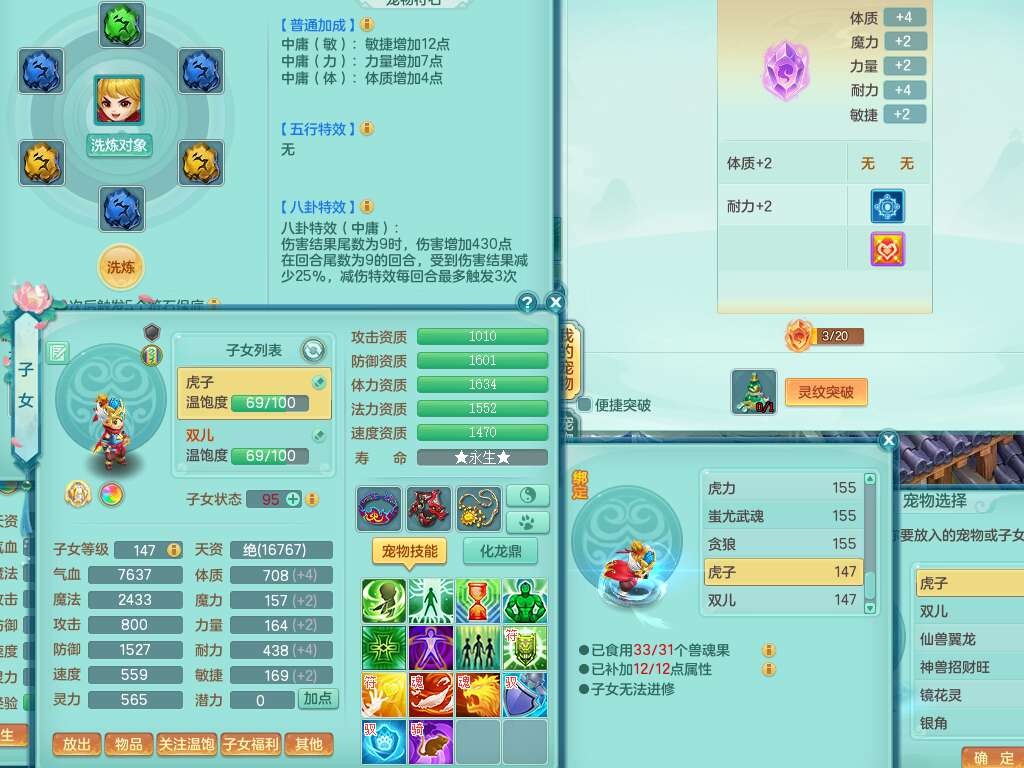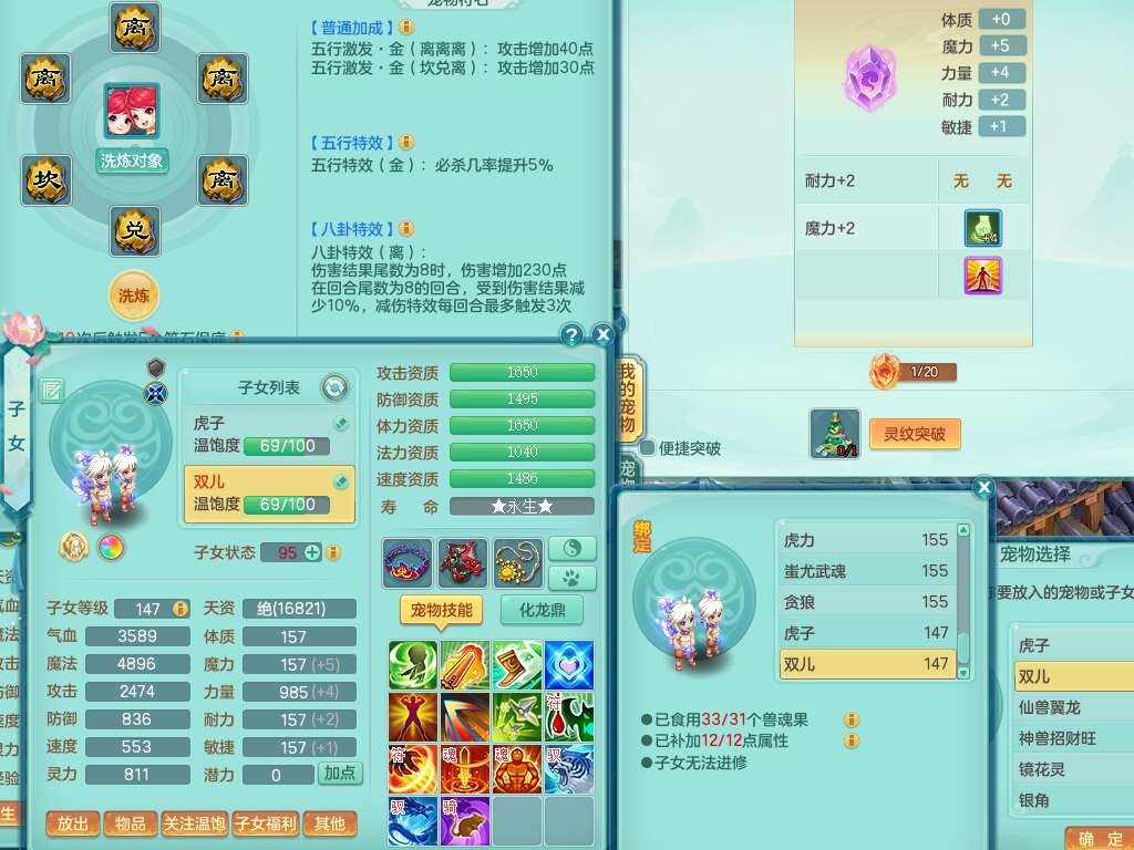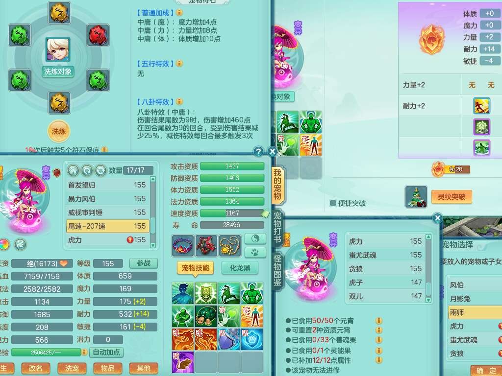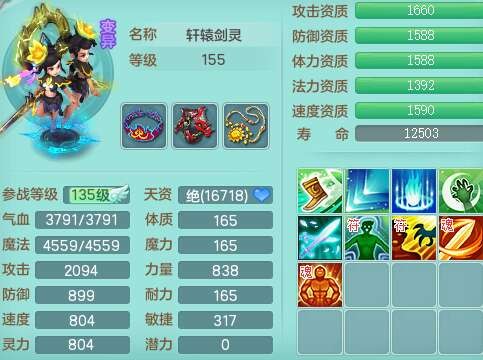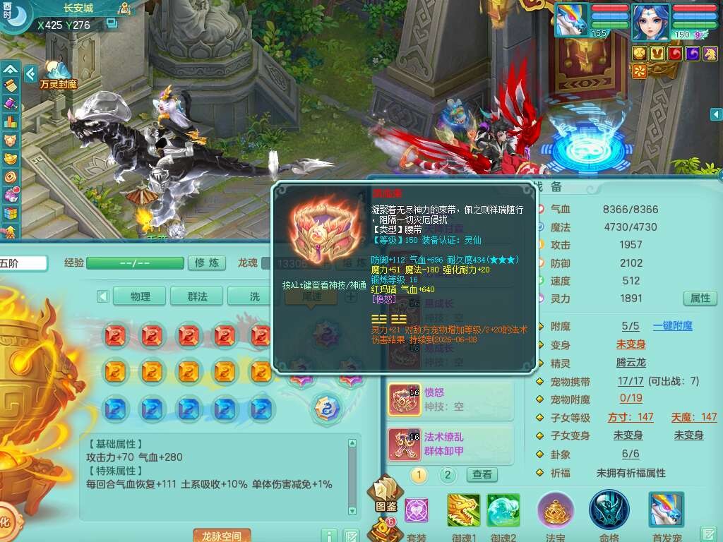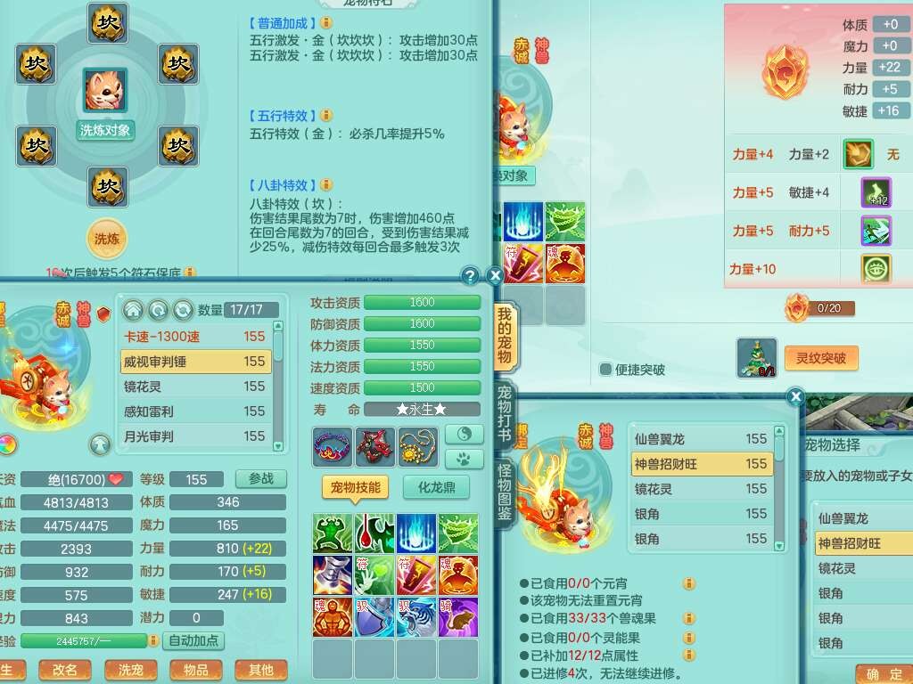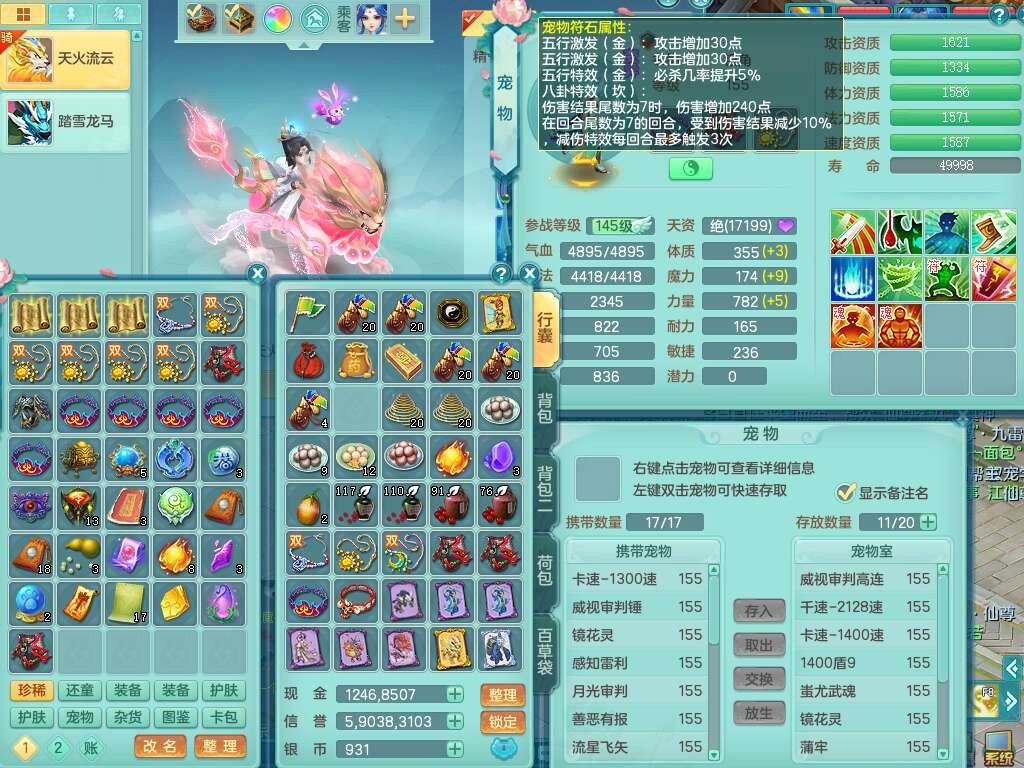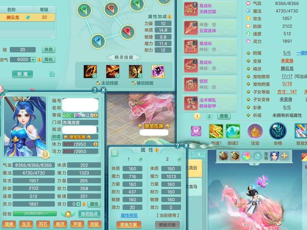 s22348战无不胜159女龙宫,精灵舞,1龙无内,1内胆神,【10觉醒,已潜龙】,6特殊(雷厉*2,月光,善恶,流星,飞花),1只六技能镜花灵,易成长四海单加头,五雷武器,易成长单加50衣服,276易成长链子,愤怒单加51腰带,法缭群体卸甲鞋子,5.5基础鼎+70攻+280血,躲避10%,15个永久格子,8个纯六字,18只满果子,宠排在榜,经验在榜,双人坐骑。