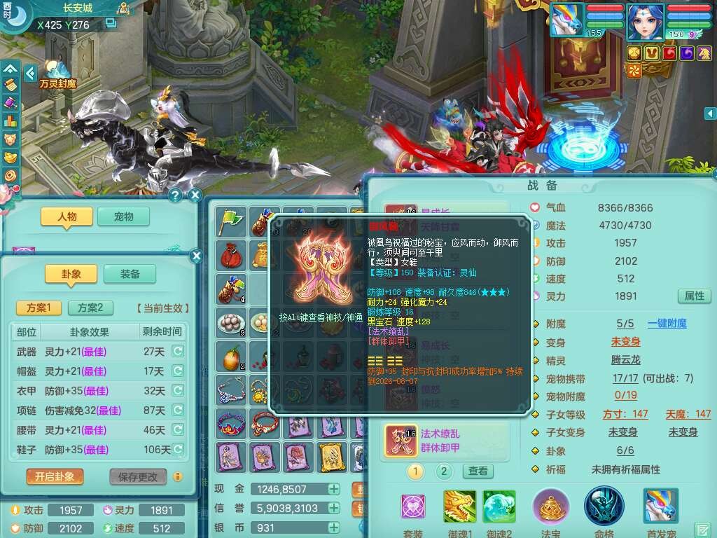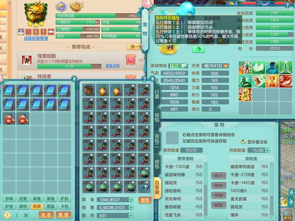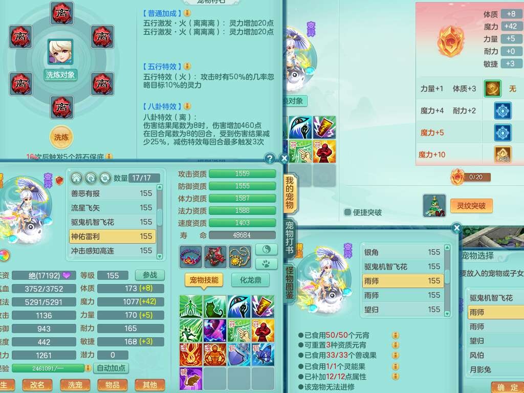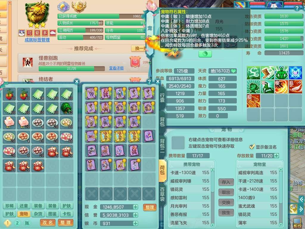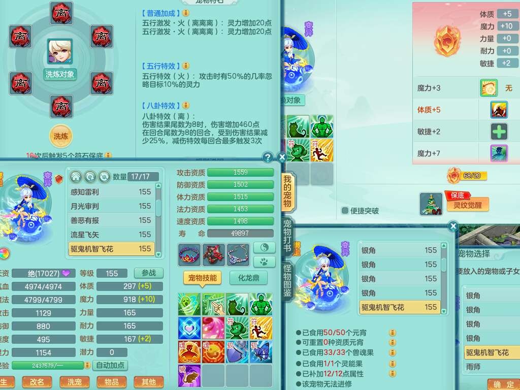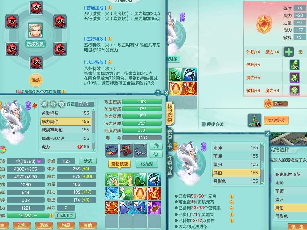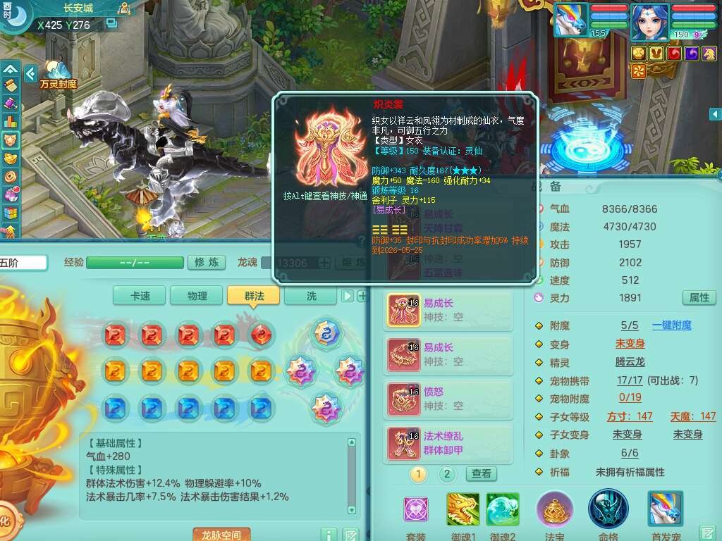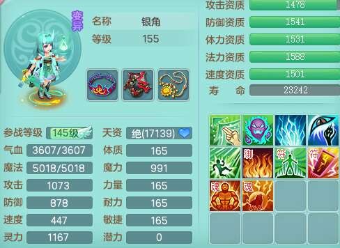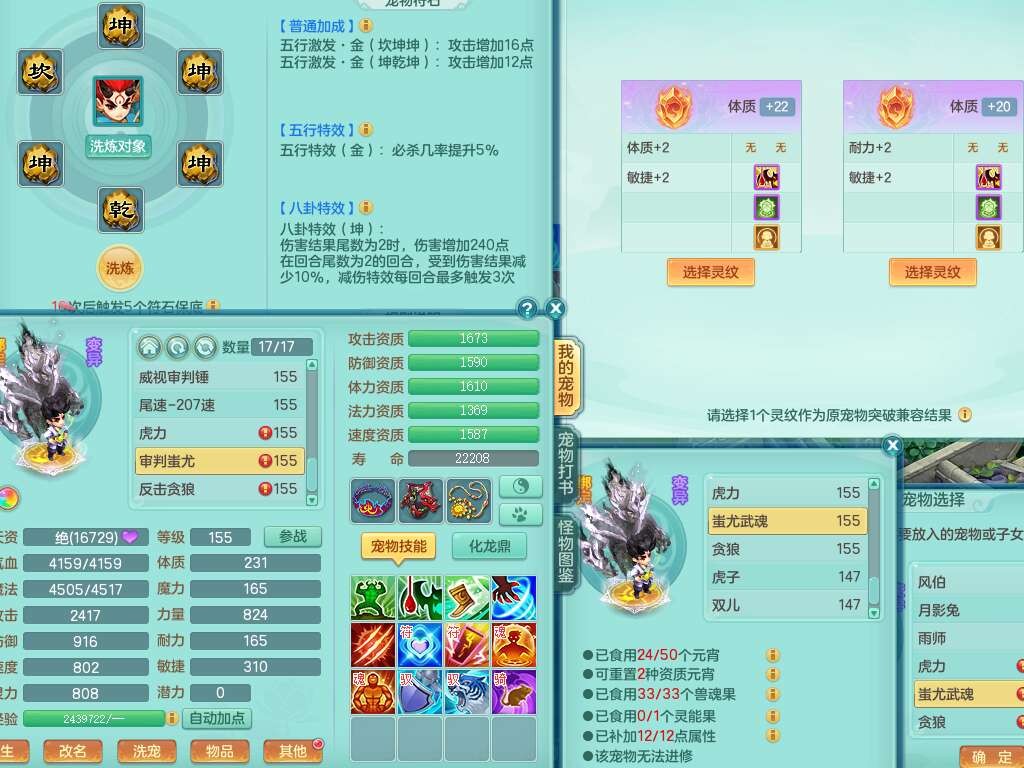 s22348战无不胜159女龙宫,精灵舞,1龙无内,1内胆神,【10觉醒,已潜龙】,6特殊(雷厉*2,月光,善恶,流星,飞花),1只六技能镜花灵,易成长四海单加头,五雷武器,易成长单加50衣服,276易成长链子,愤怒单加51腰带,法缭群体卸甲鞋子,5.5基础鼎+70攻+280血,躲避10%,15个永久格子,8个纯六字,18只满果子,宠排在榜,经验在榜,双人坐骑。