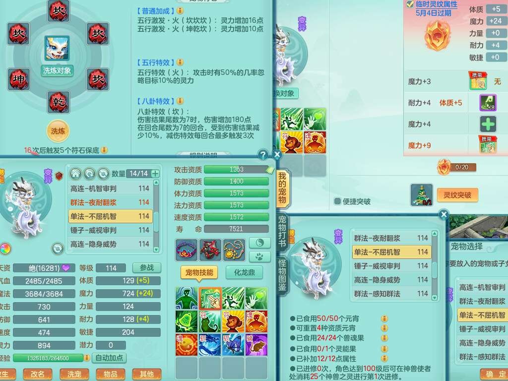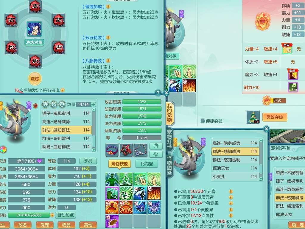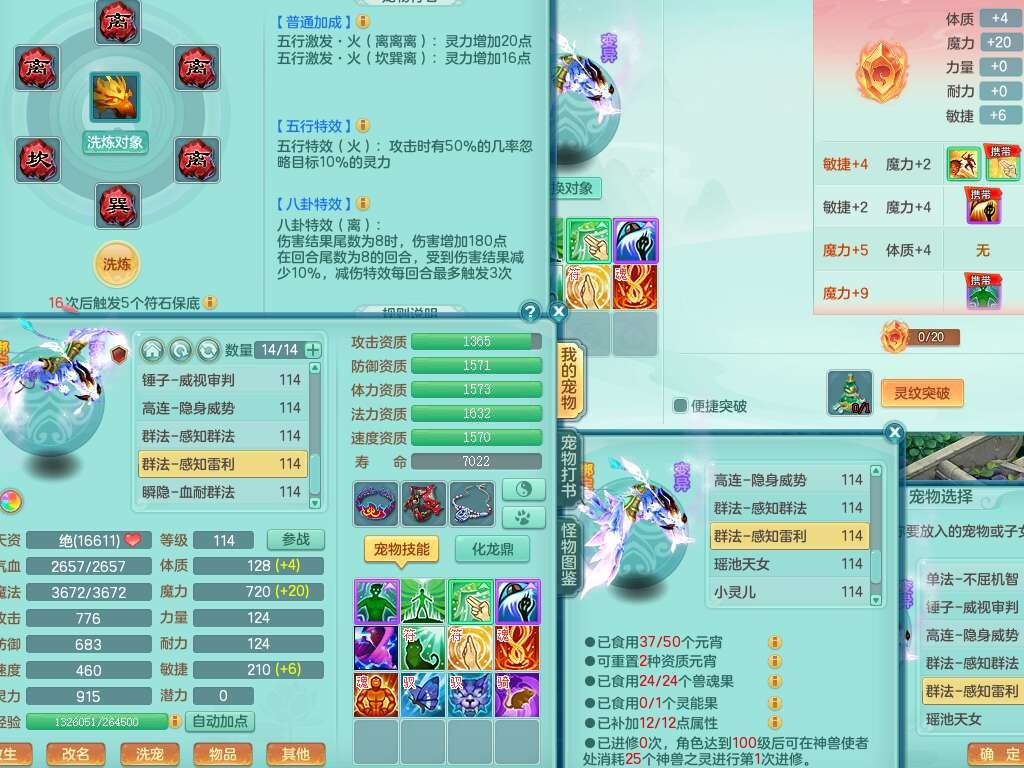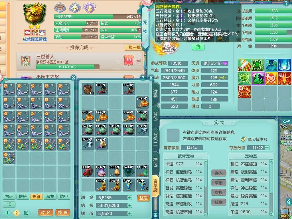 p22346超凡入圣109男魔王,精灵舞,1龙无内,2内胆神(马),7觉醒(潜龙条件化龙鼎满足,宝宝满足1只,符石差3个附加属性),3宠皮,五雷单加38头,法爆驭兽决单加34武器,易成长单加35衣服,166易成长卸甲单加38链子,愤怒静心术单加30腰带,法缭单加30鞋子,物理有破甲群体守护头,603必杀野兽武器,608狂暴卸甲单加武器,神佑单加37链子,愤怒崩山腰带,易成长笑里单加36鞋子,3.0基础鼎+42攻+168血,3个纯六字,2个五字,16只满果子,宠排在榜,4只坐骑,神驹马到成功+火焰之力武器,有24个神兽内丹碎片,141天月卡。