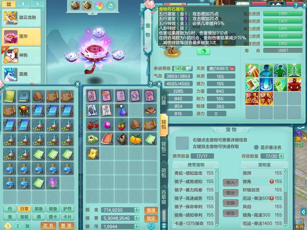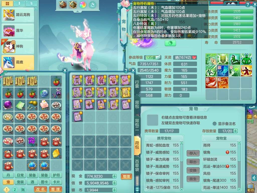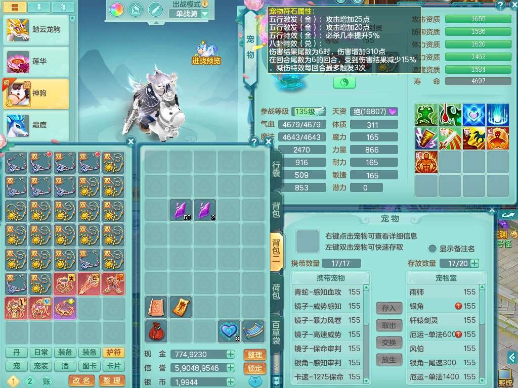 J22343醉生梦死159男万兽,精灵歌+舞,1龙没内,1内丹蛇,【7觉醒,已潜龙】,1特殊(风卷),4只六技能镜花灵,1只六技能龙姬,易成长破魔斩单加57头,911狂暴易成长单加武器,崩山单加55衣服,神佑群体守备单加52链子,易成长慈航单加56腰带,破甲鞋子,5.5基础鼎+70攻+280血,15个永久格子,7个纯六字,5个五字,14只满果子,仓库还有55个果子,宠排在榜,经验在榜,双人坐骑,神驹马上发财+火焰之力武器,有52个神兽内丹碎片,162天月卡。➕159男无量,1神兽,3觉醒,1特殊(剑气),3只六技能镜花灵,易成长野兽衣服,愤怒移魂大法腰带,六特。➕159女盘丝,2只六技能镜花灵,易成长明镜非台单加52头,易成长野兽单加55武器,愤怒迟滞腰带,六特。➕159男魔王。
