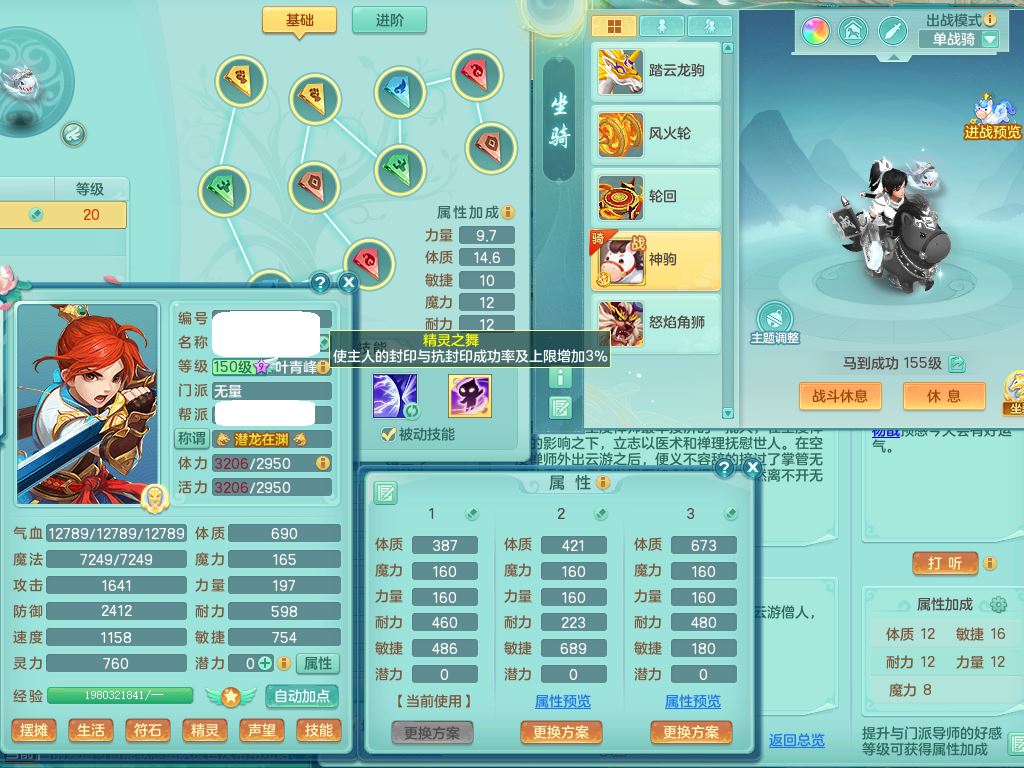 jt10433九天揽月159男佛门【潜龙号+神驹马到成功+西瓜冰】精灵舞,1龙(无内)1内丹青蛇12皮(1幻灵果),5特殊(羽袭/守护/怒破/剑胆/善恶)3镜花1龙姬,21只满果子16觉醒9个纯6字,8红愤怒6特,回春群体守备武器,愤怒卸甲腰带,鼎6.0+70+280,2套符石,158天月卡,庭院148房屋153,精灵皮肤,28内丹碎片,宠排在榜,2坐骑(1只双人)带2个150奶粉