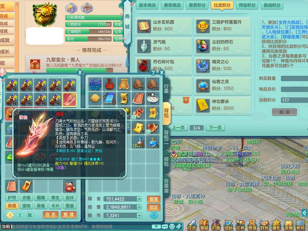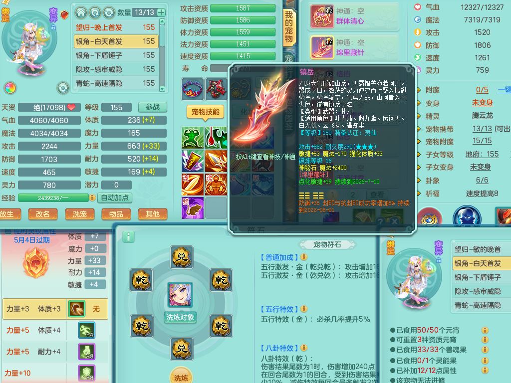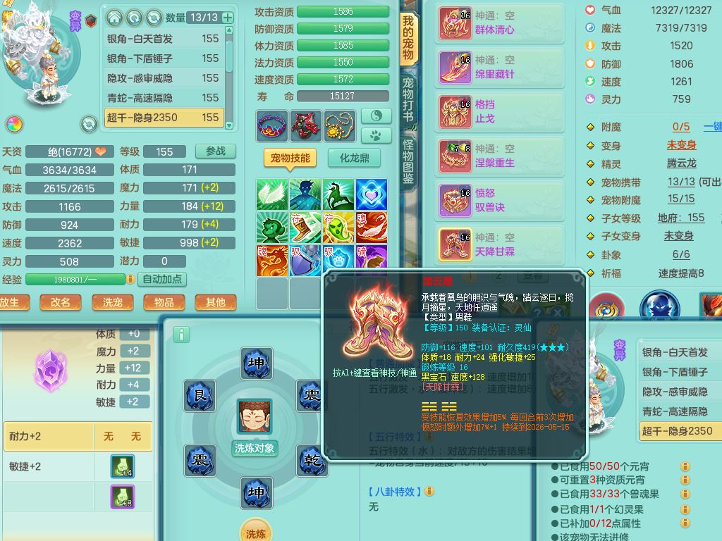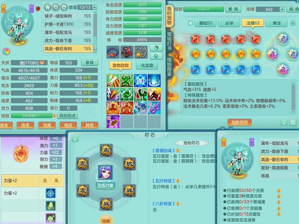 cf10434超凡入圣159男方寸精灵舞,满级共鸣,1内丹青蛇3皮4特殊(冲锋/破碎/墨守/虎虎兽决)8只满果子3觉醒6个4字3个5字(1洗练珠),8红愤怒6特,格挡止戈衣服,愤怒驭兽腰带,封锁水清武器,仓库回春武器,鼎5.5,永久头饰,69仙兽灵,飞行双人坐骑