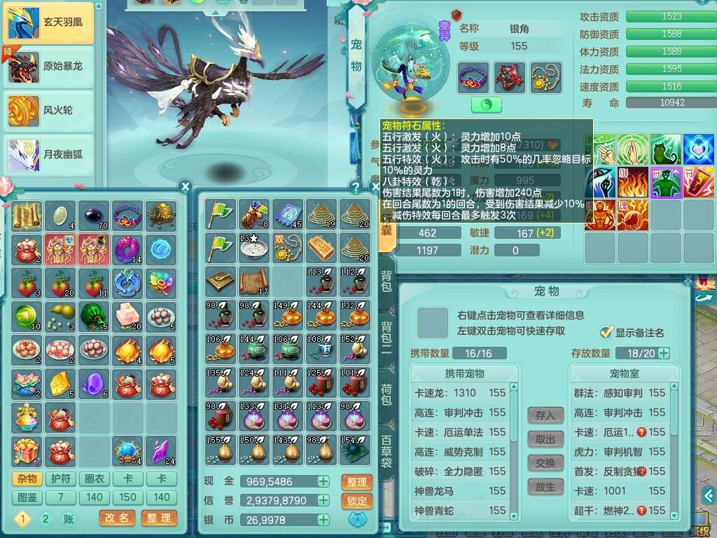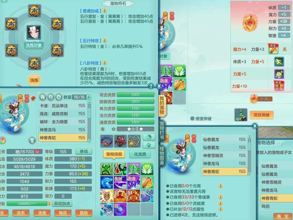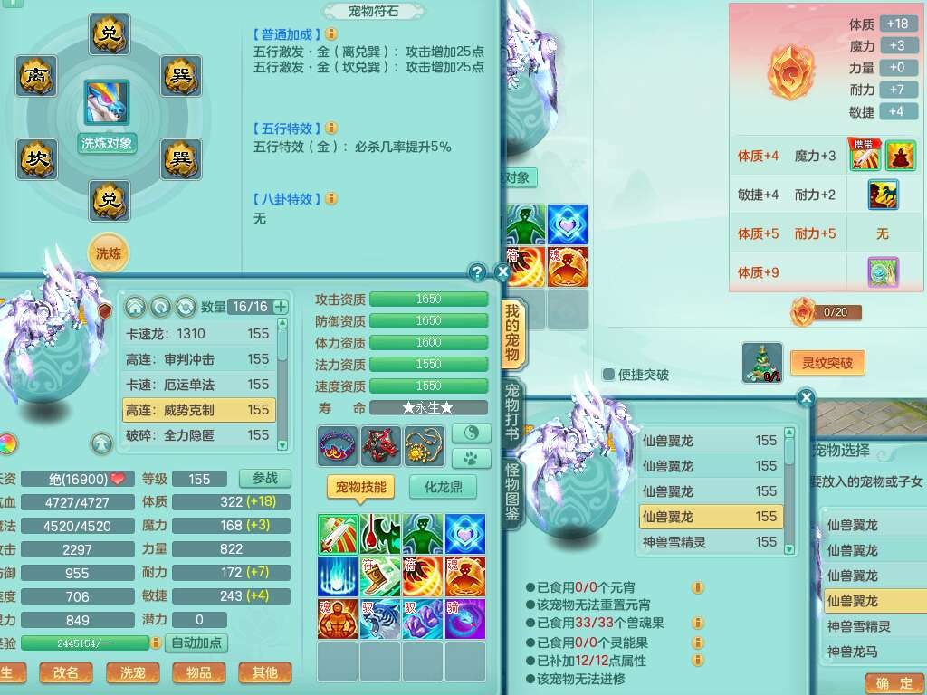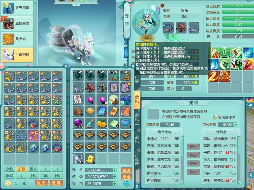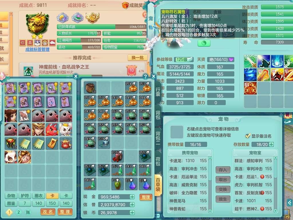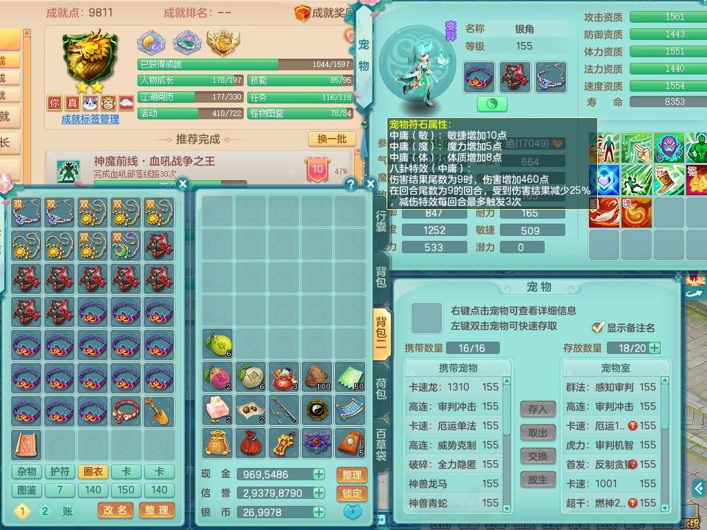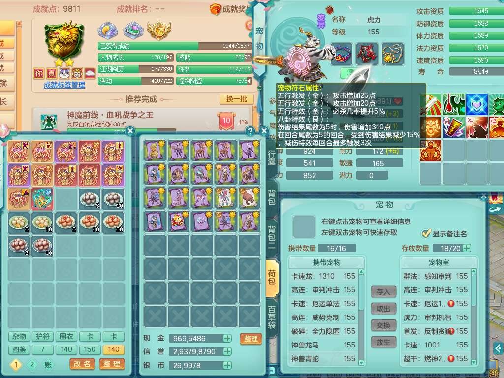 J22355少年游159男万兽,精灵歌,5龙(1龙无内),3内胆神,1破镜,【12只觉醒,已潜龙】,4位靓号不含4,6宠皮,1特殊(虎虎),5只六技能镜花灵,1只6技能龙姬,三红易成长狂暴奇珍武器,崩山裂地单加56衣服,神佑单加56链子,迅捷单加56鞋子,有易成长五雷单加55衣服,5.5基础鼎+70攻、280血,物理躲避10%,14个格子,9个纯六字,5个五字,21只满果子,宠排在榜,修炼在榜,3只坐骑,原始暴龙泰坦,月卡还有37天。