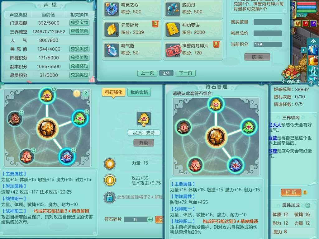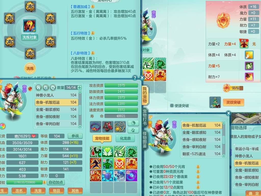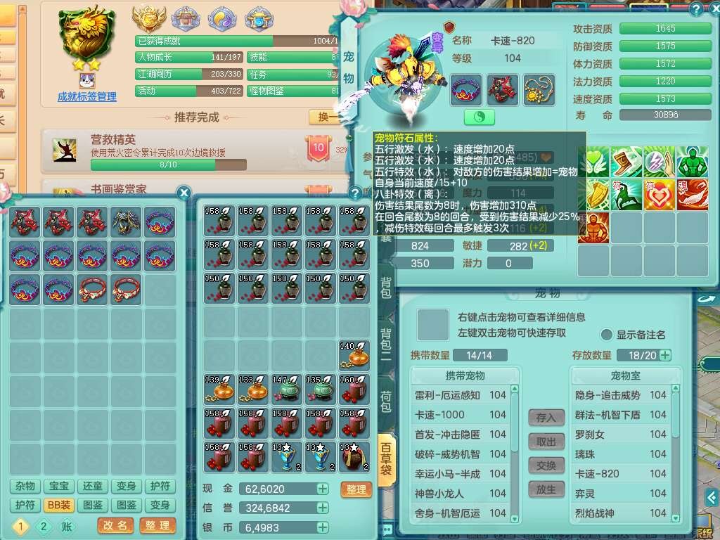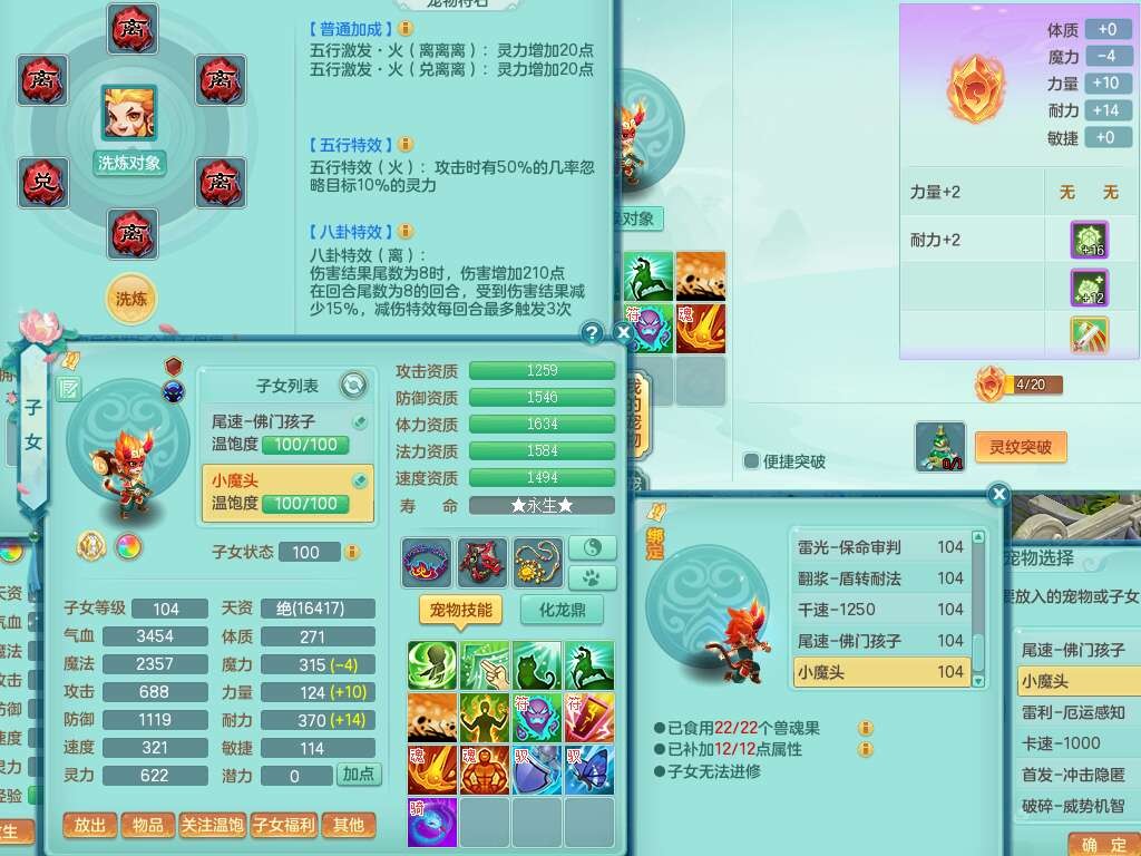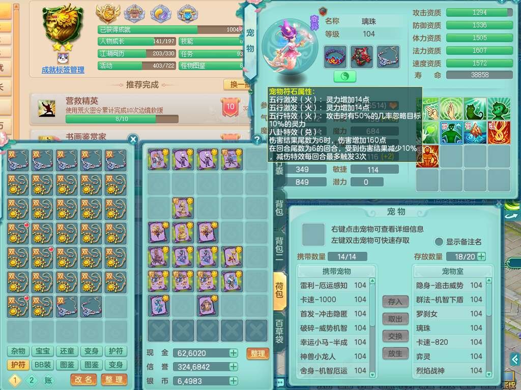 L22354今年勇99男无名谷,2龙(1龙没内),2内胆神(1蛇1马),2神兽+33个神兽内丹碎片,【12觉醒,已潜龙】,1宠皮,易成长罗汉单加35头,556易成长武器,崩山单加衣服,神佑链子,愤怒四海单加腰带,迅捷易成长单加鞋子,法系有163易成长奇珍链子,155易成长单加33链子,法爆单加武器,五雷单加33头,法缭单加34鞋子,3.0基础鼎+42攻+168血,14个纯六字,2个五字,22只满果子,宠排在榜,4个孩子,2只双人坐骑,带133天月卡。➕99男天魔,1神兽,易成长单加头,547易成长武器,破血单加34衣服,神佑链子,愤怒单加腰带,匠心易成长鞋子。➕99女盘丝,2觉醒,易成长笑里单加头,幸运4玉清单加31衣服,神佑四海链子,三红愤怒幸运4心神合一单加30腰带,易成长野兽鞋子,六特。