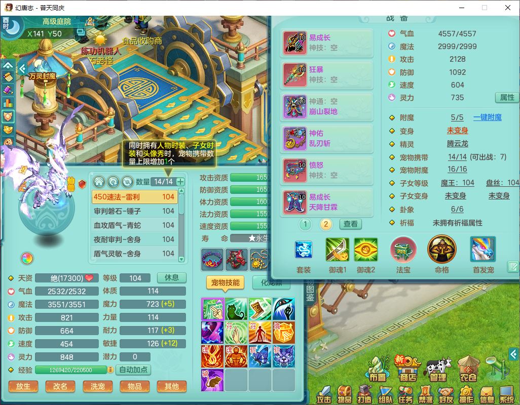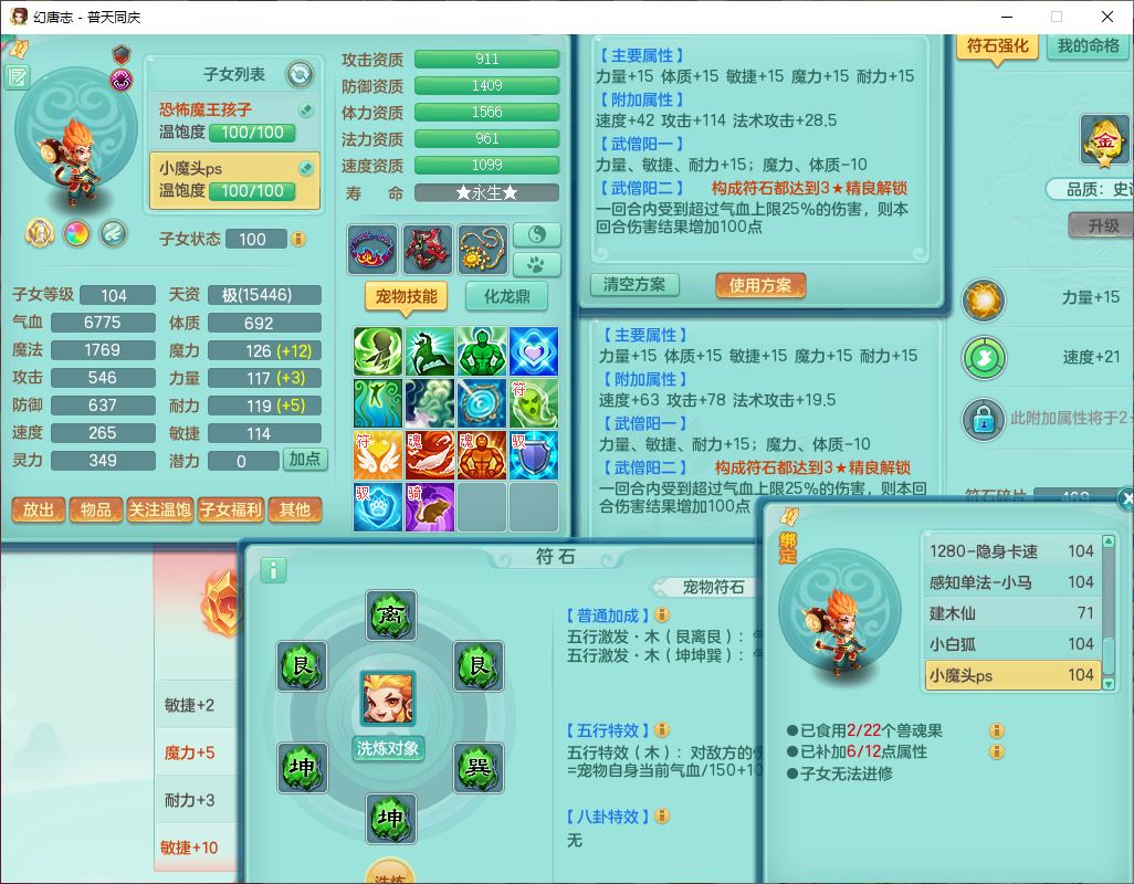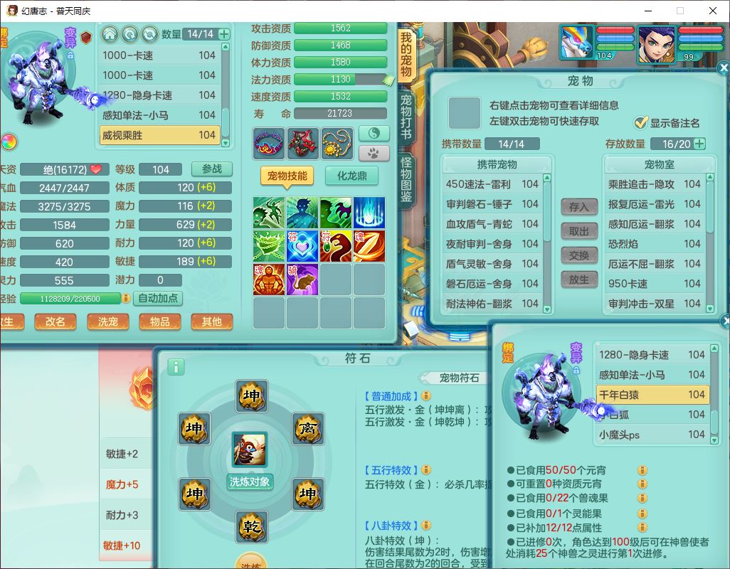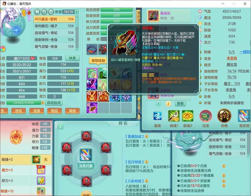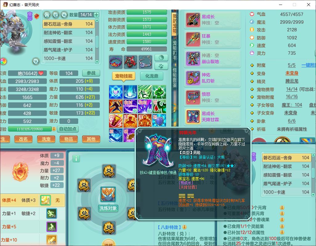 62441普天同庆99男天宫【潜龙号】力敏、全魔双精灵,1龙(换,破境)3内(1青蛇1龙马,1破境)4翻江3舍身1金炉1童子,8觉醒6宠皮7六字11四字19只满果子,8红装备,狂暴武器,崩山衣服,神佑乱刃项链,Y四海鞋子,Y笑里腰带,Y卸甲帽子,鼎2.5+42+168,3套符石,77天月卡,庭院157房屋153,永久外观、精灵皮肤,46个内丹碎片,2坐骑