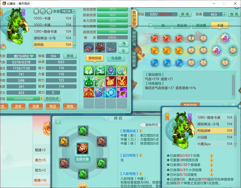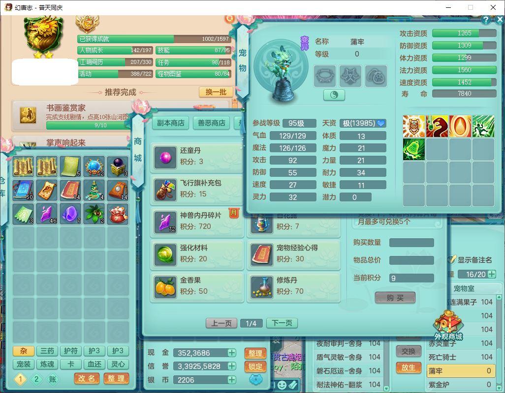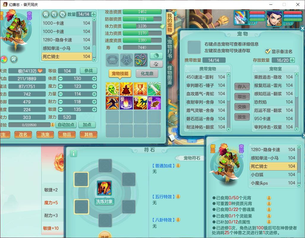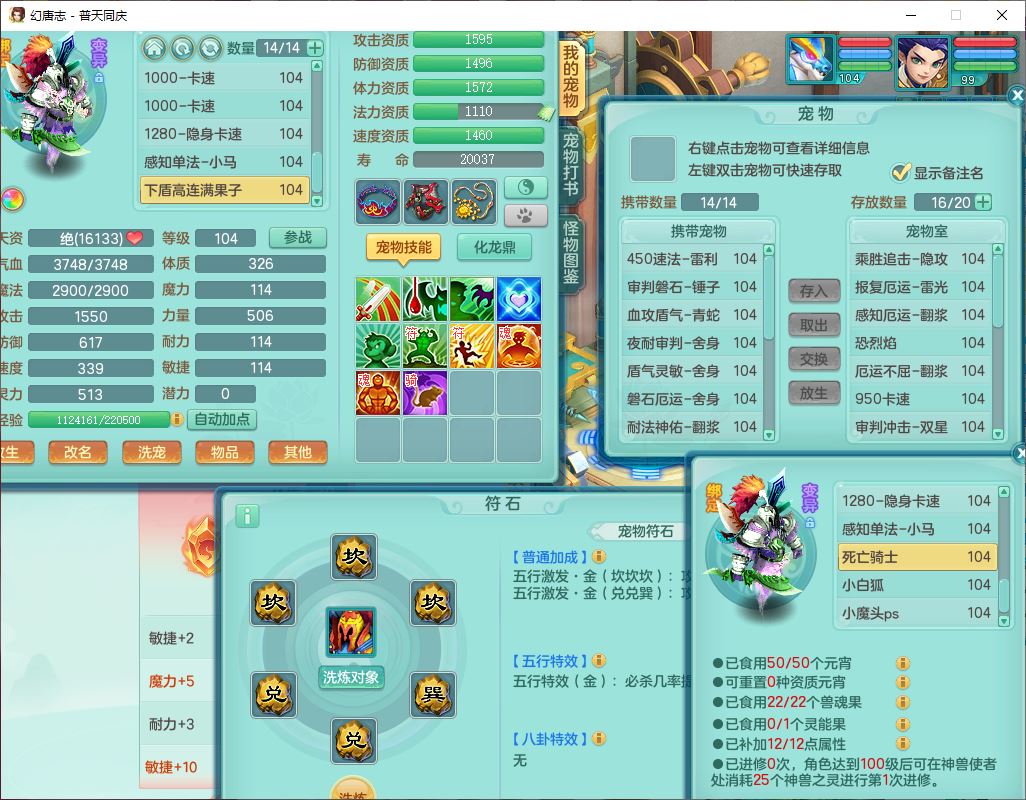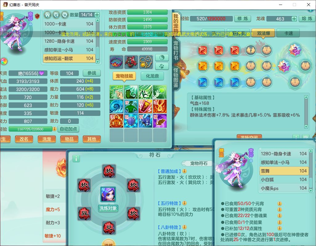 62441普天同庆99男天宫【潜龙号】力敏、全魔双精灵,1龙(换,破境)3内(1青蛇1龙马,1破境)4翻江3舍身1金炉1童子,8觉醒6宠皮7六字11四字19只满果子,8红装备,狂暴武器,崩山衣服,神佑乱刃项链,Y四海鞋子,Y笑里腰带,Y卸甲帽子,鼎2.5+42+168,3套符石,77天月卡,庭院157房屋153,永久外观、精灵皮肤,46个内丹碎片,2坐骑