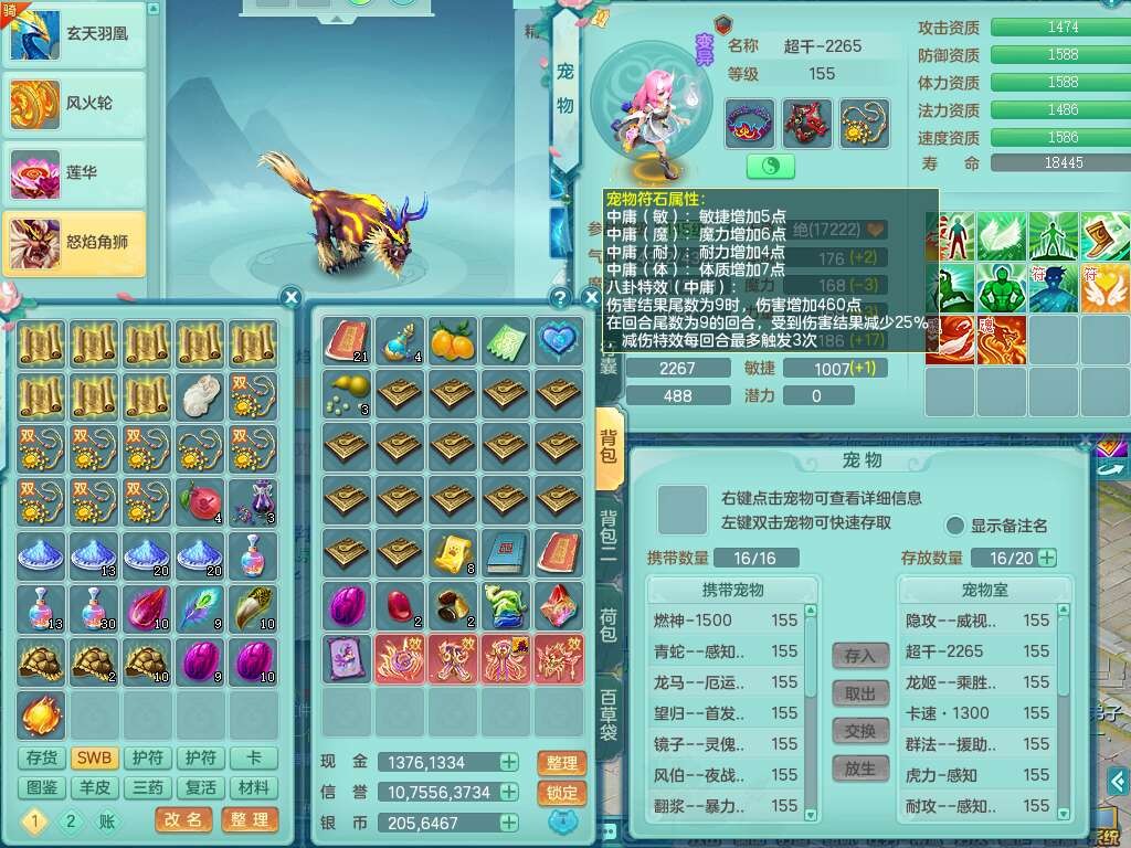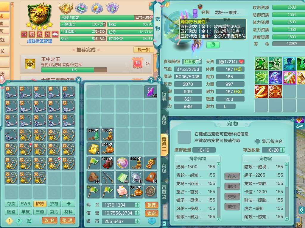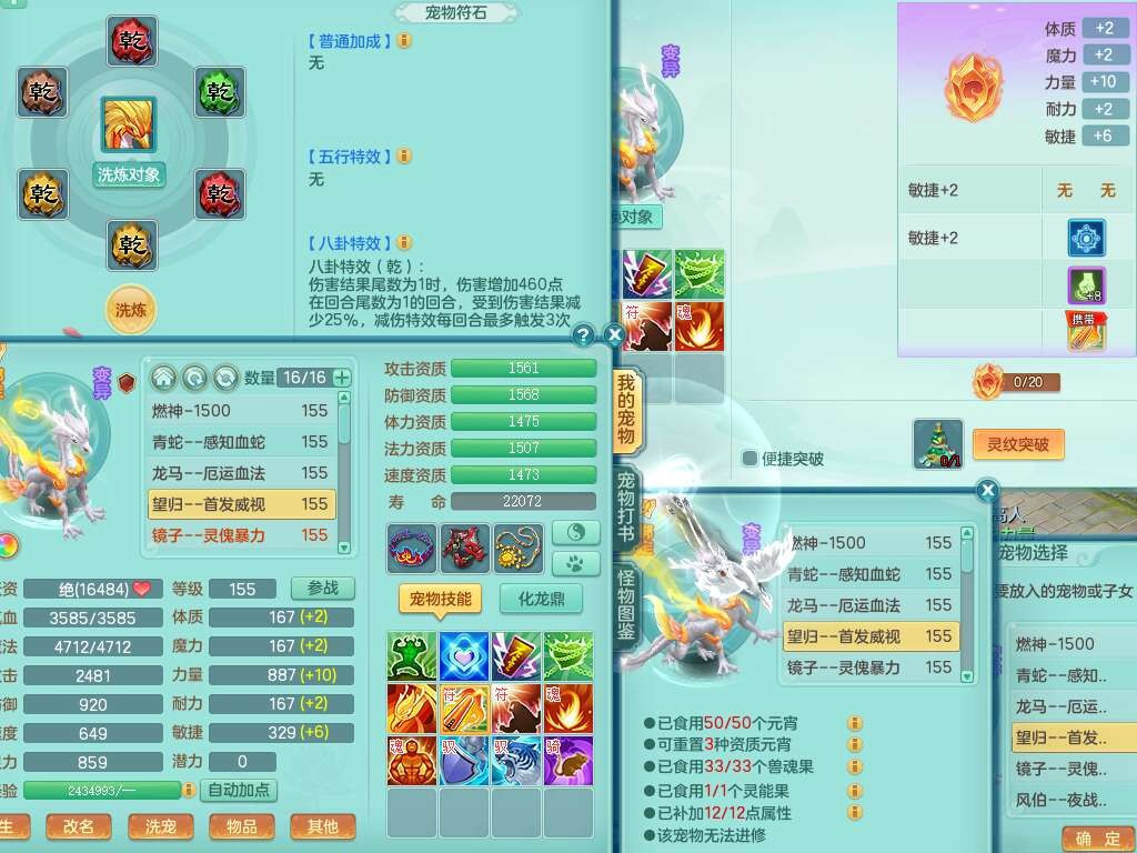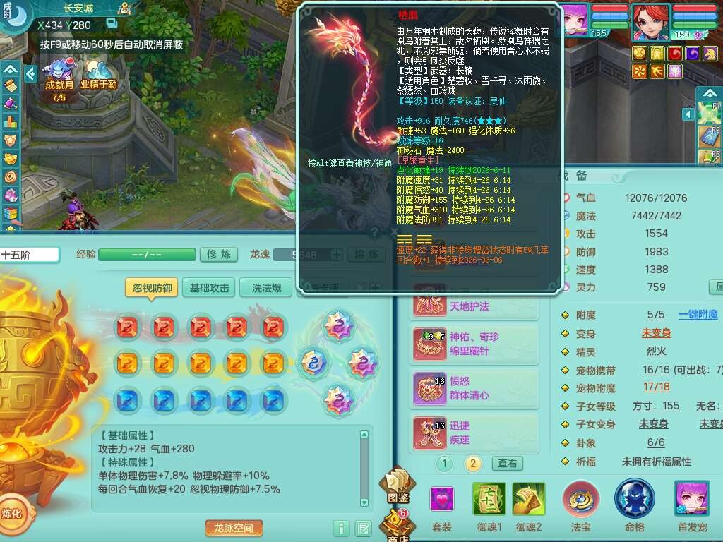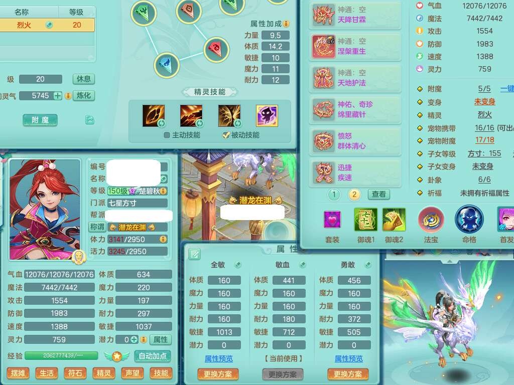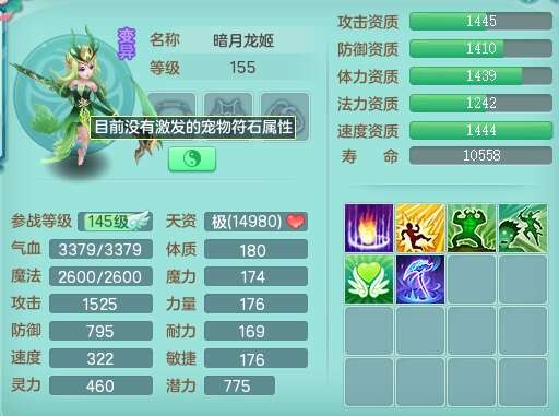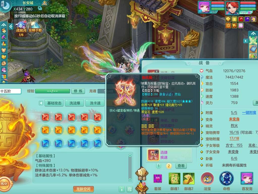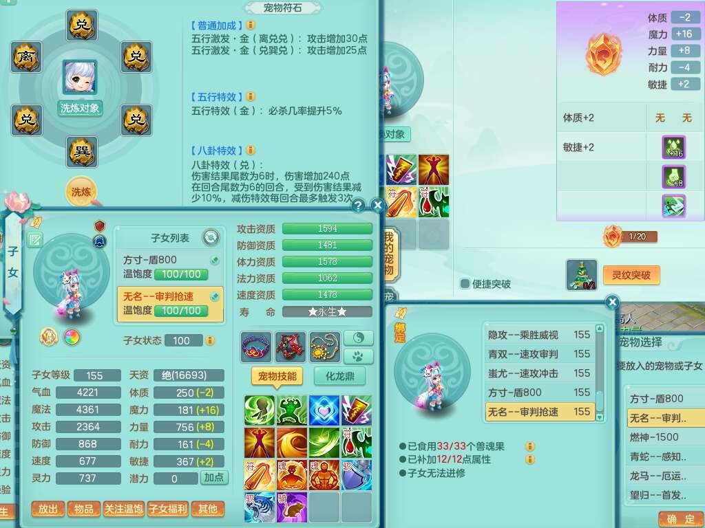 S22372风驰电掣159女方寸,精灵舞,1龙无内,1内胆神,【9只觉醒,已潜龙】,1宠皮,4特殊(青霜,夺命2,灵傀),3只六技能镜花灵,2只六技能龙姬,愤怒6特,可玩任何封辅,934易成长必杀单加武器,5.5基础鼎+70攻,280血,14个格子,8个纯六字,20只满果子,背包45神兽内丹碎片,经验成就在榜,火焰之力武器皮肤,双人飞行坐骑+火焰之力,带2272金币,205W银币,月卡还有53天。