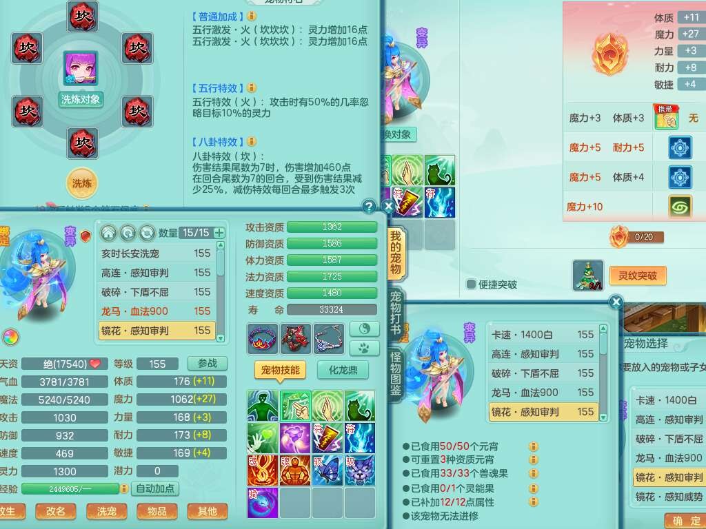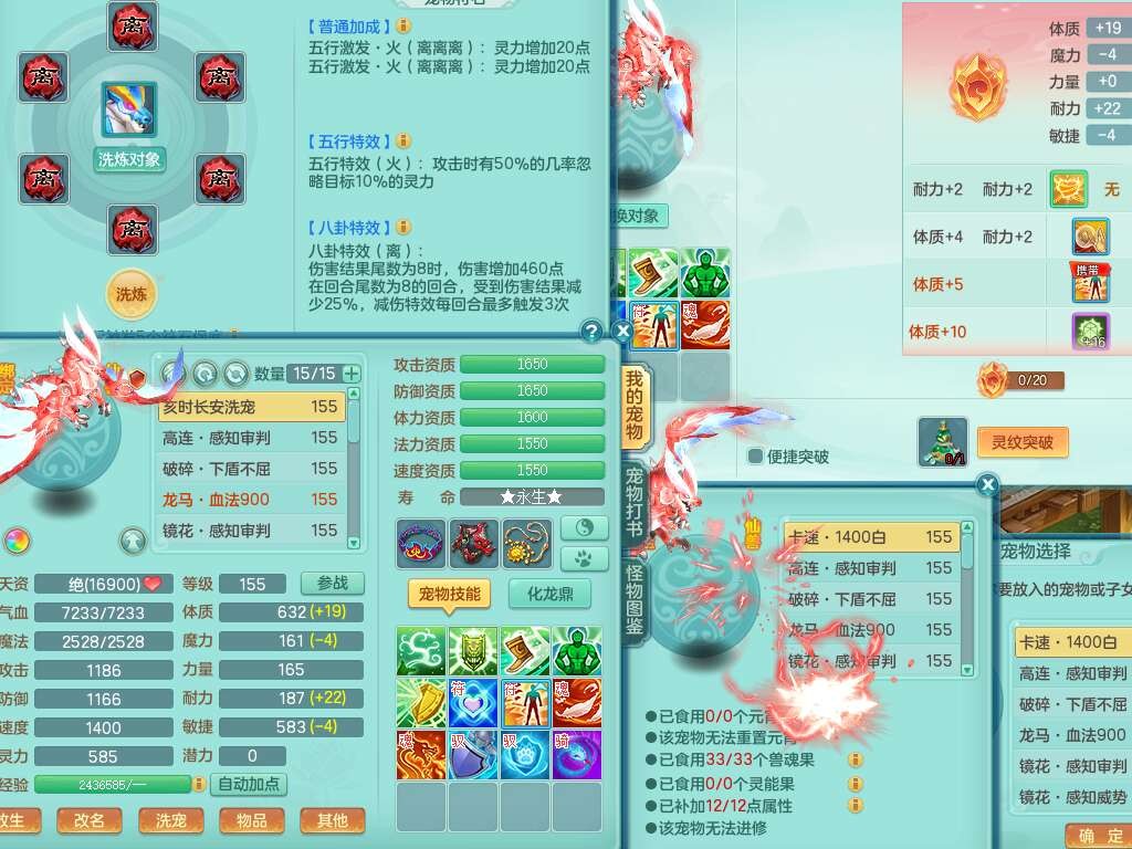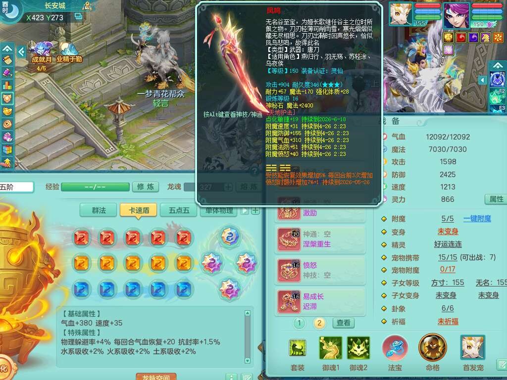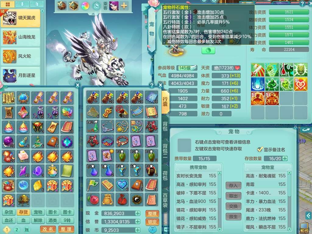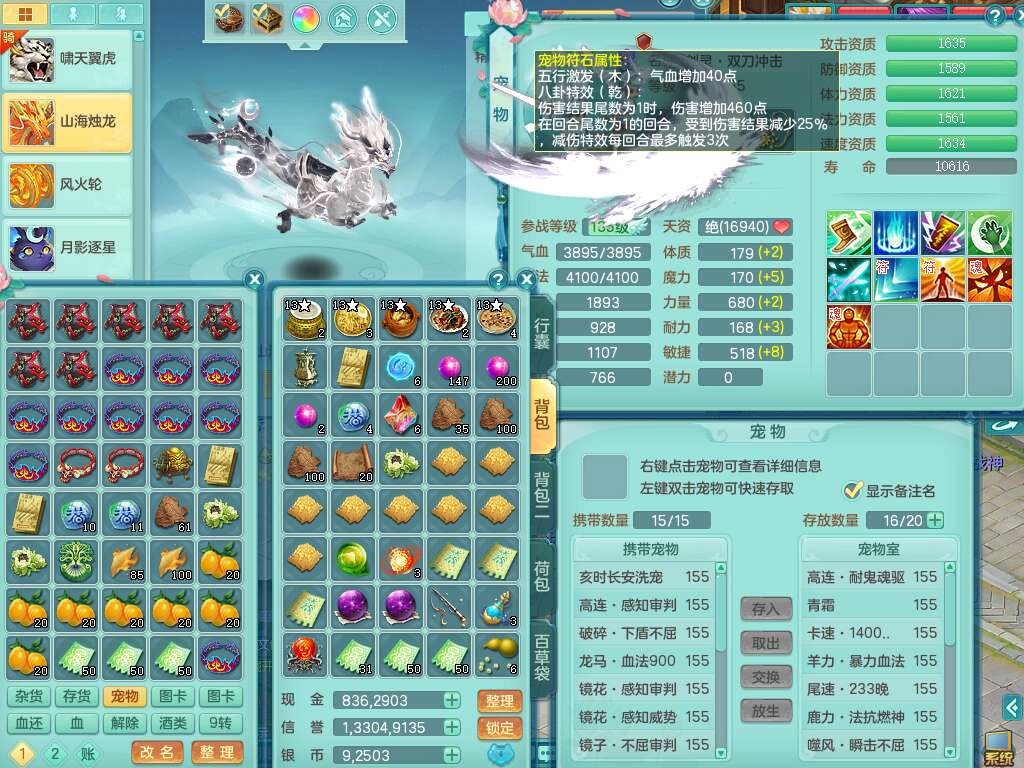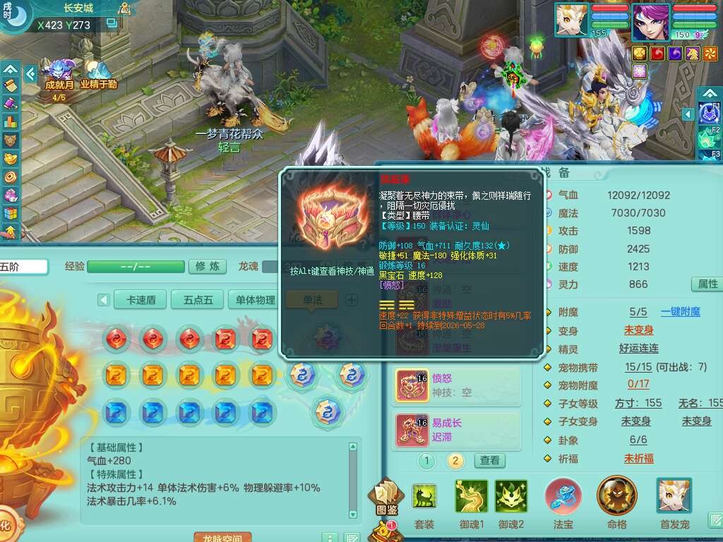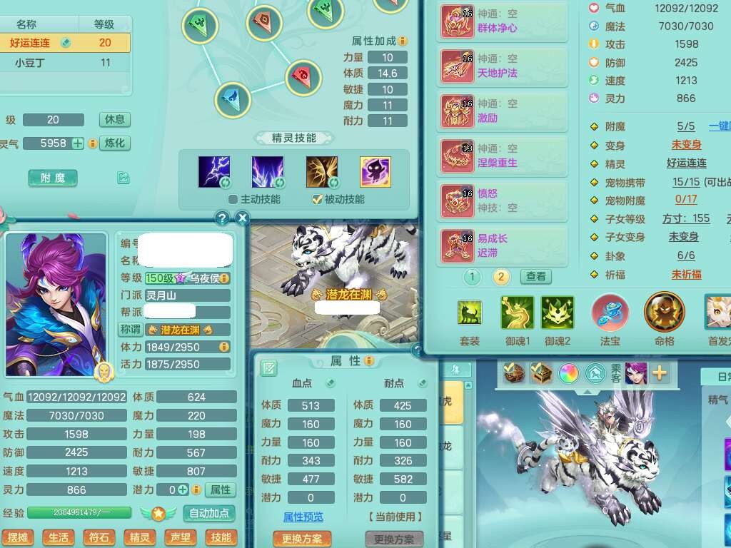 S22362风驰电掣159男灵月山,精灵舞,2龙2内胆神(1马),【10觉醒,已潜龙】,4位靓号不含4,3宠皮,3特殊(羽袭,善恶),4只六技能镜花灵,愤怒单加51腰带,易成长迟滞鞋子,五特,有愤怒单加57腰带,5.5基础鼎+70攻+280血,差174积分永久14个格子,7个纯六字,2个五字,18只满果子,双人坐骑,有40个神兽内丹碎片,87天月卡。