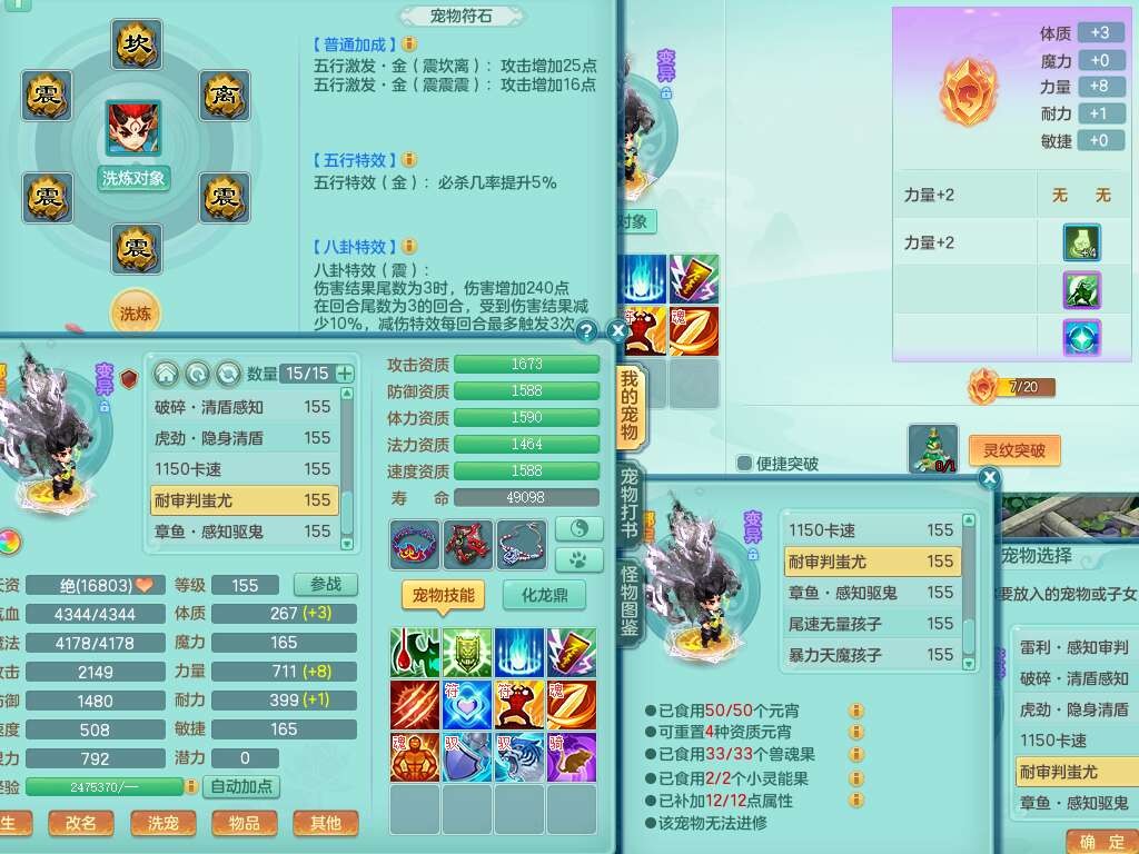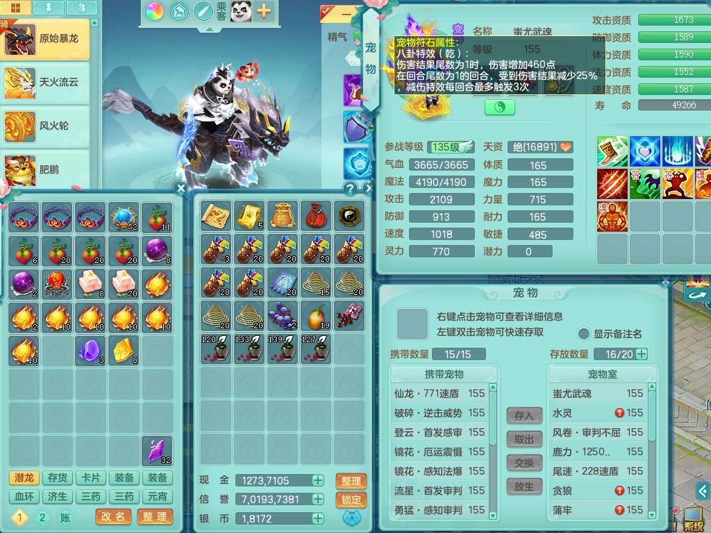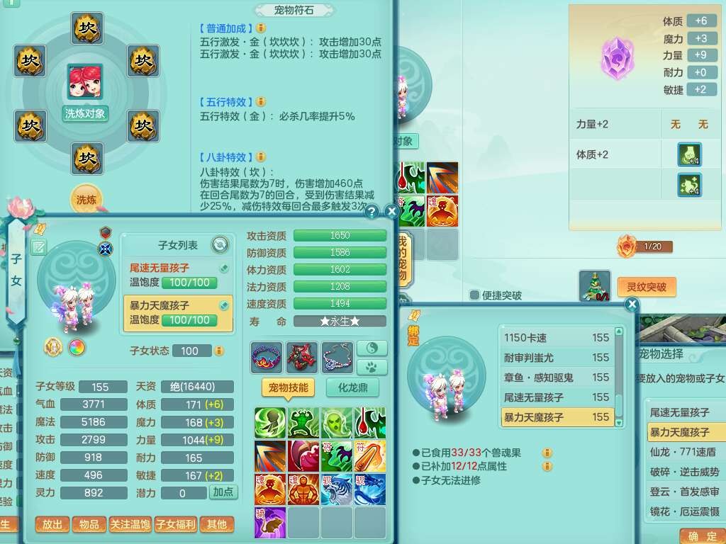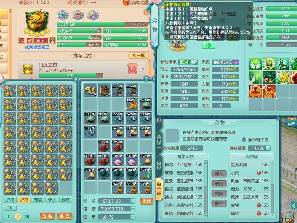 a22359普天同庆159男万兽,1龙没内,1内胆神,1神兽青蛇+32神兽内胆碎片,8只觉醒(准潜龙,化龙鼎满足,宠物只差1个觉醒,符石差3个26,2个附加),4宠皮,6特殊(流星,勇猛,噬风,雷厉,夺命,虎虎),3只六技能镜花灵,崩山单加55衣服,易成长晶清单加54鞋子,926易成长武器,易成长单加57腰带,5.5基础鼎+70攻+280血,物理躲避10%,13个格子,8个纯六字,16只满果子,仓库还有77个果子,2个双人坐骑,原始暴龙洪荒,带107天月卡。