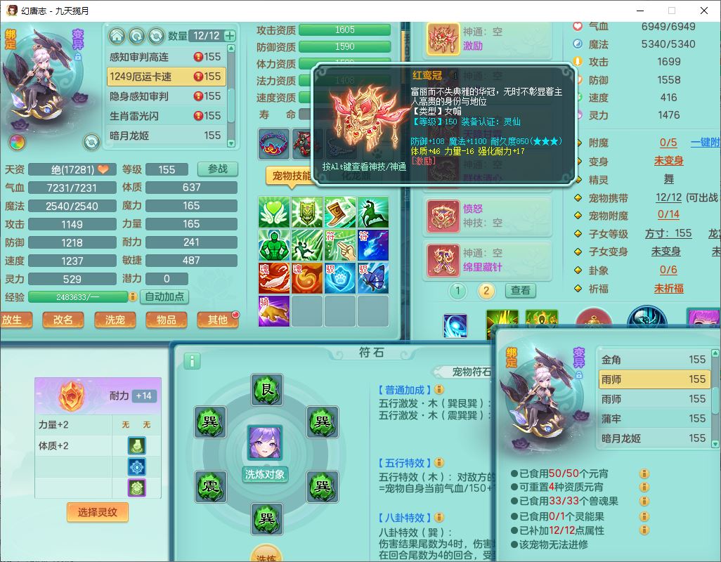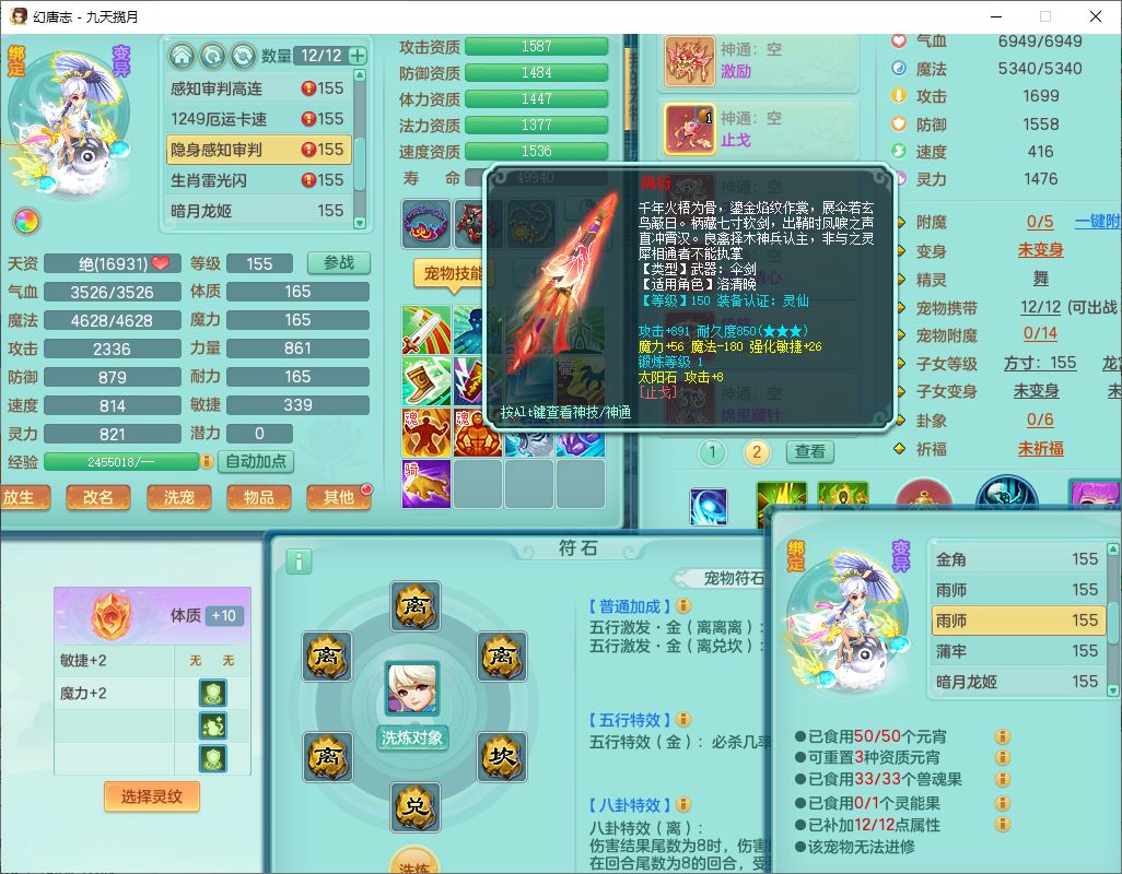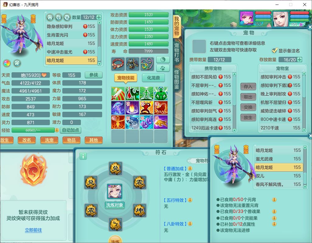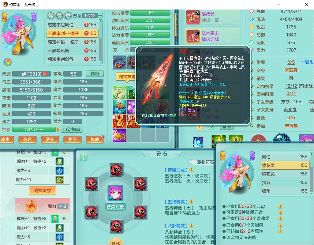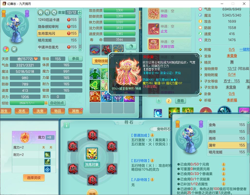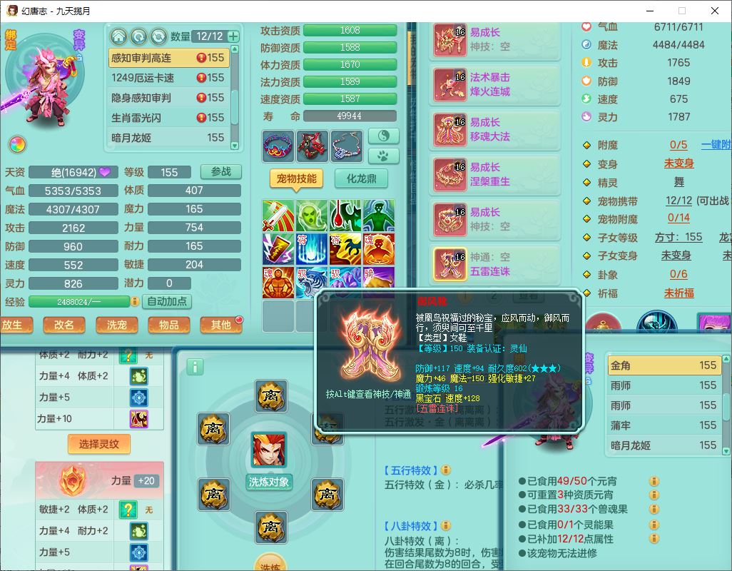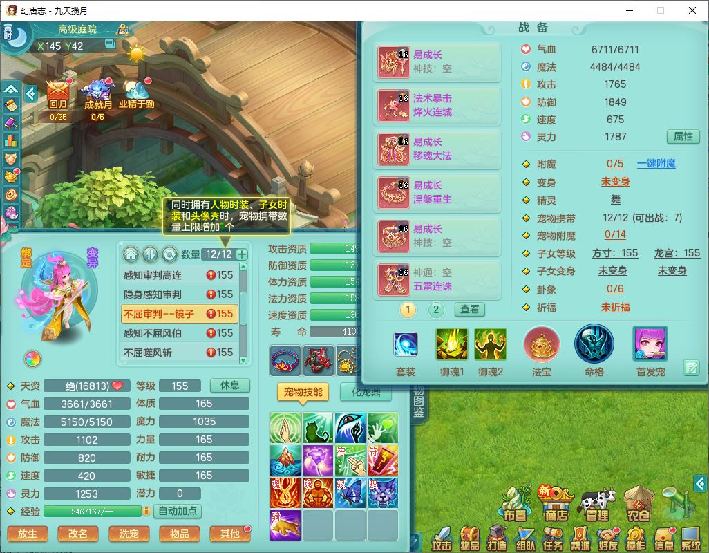 4381九天揽月159女魔王【潜龙号】精灵舞,1内1望归3镜花1龙姬1特殊兽决(琴音),8觉醒4宠皮7六字1五字10四字14只满果子,9红装备,法爆烽火武器,Y移魂衣服,Y慈航项链,五雷鞋子,一套辅助装备,鼎5.5+70+280,庭院153,56个仙兽灵,1双人飞行坐骑