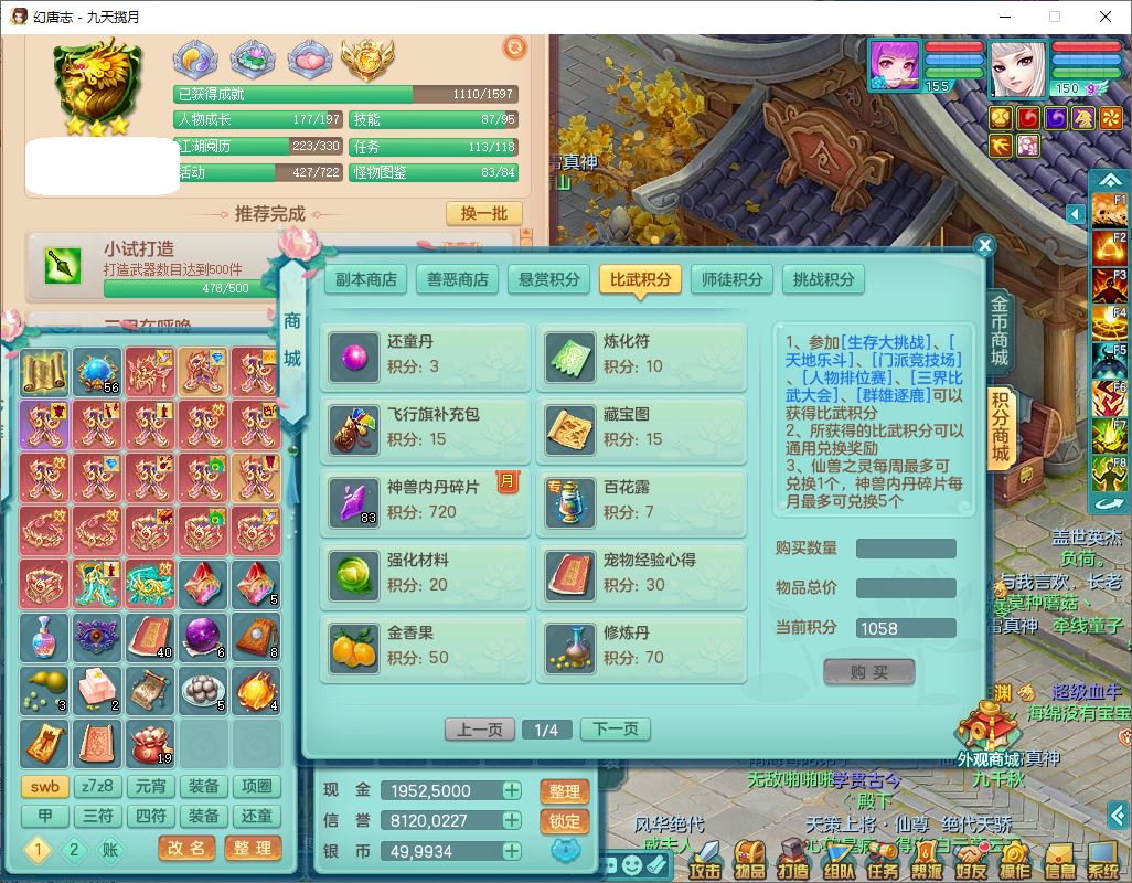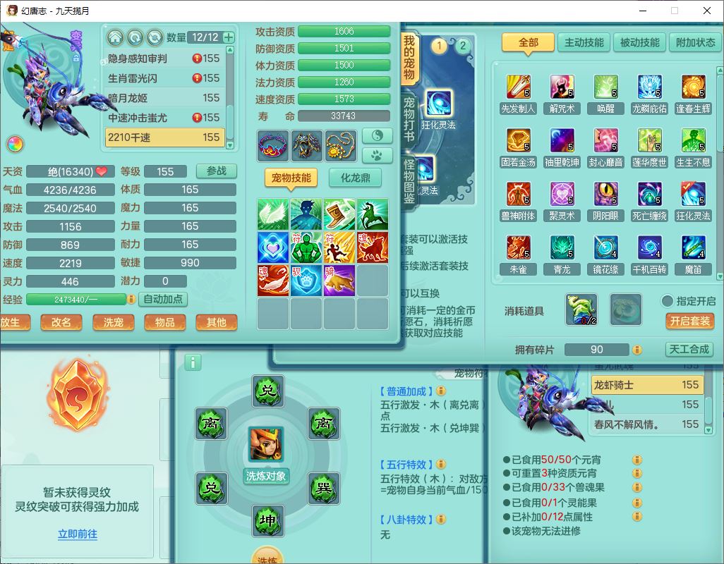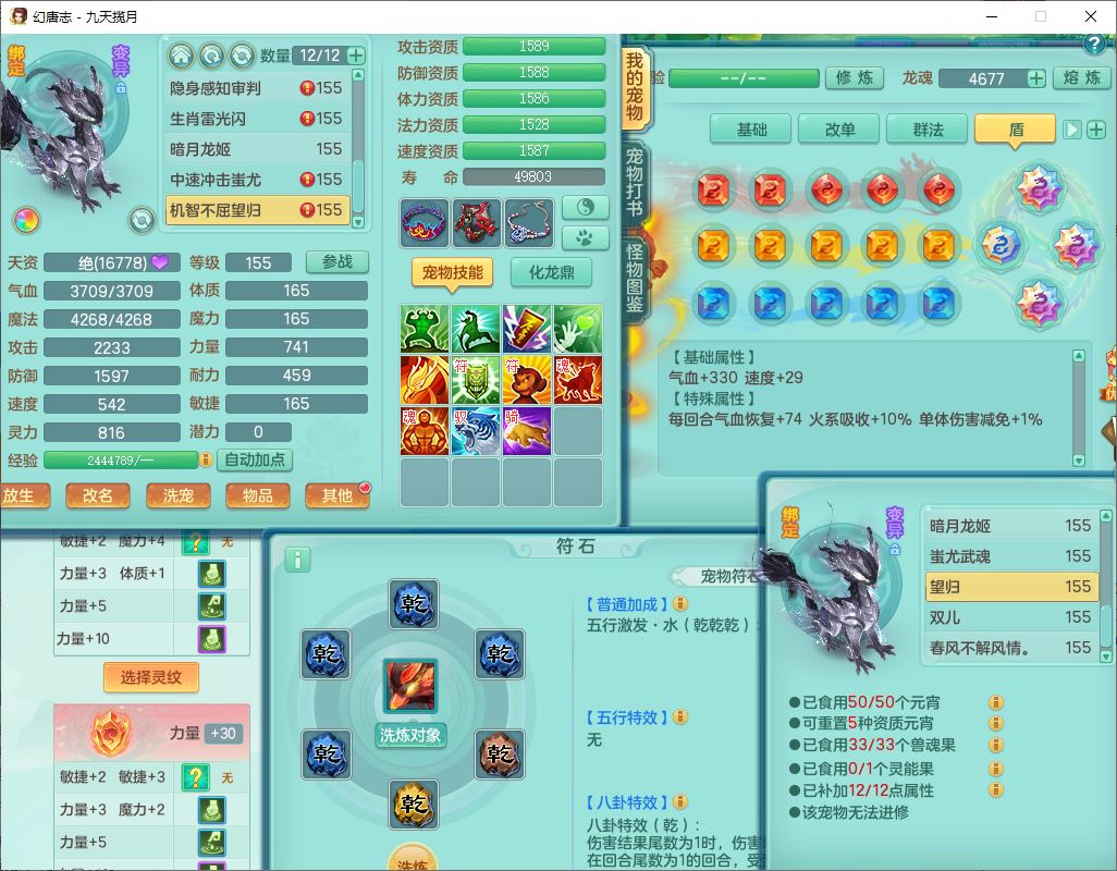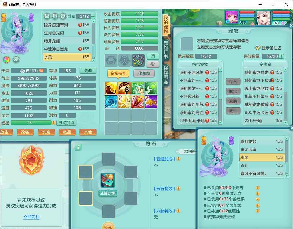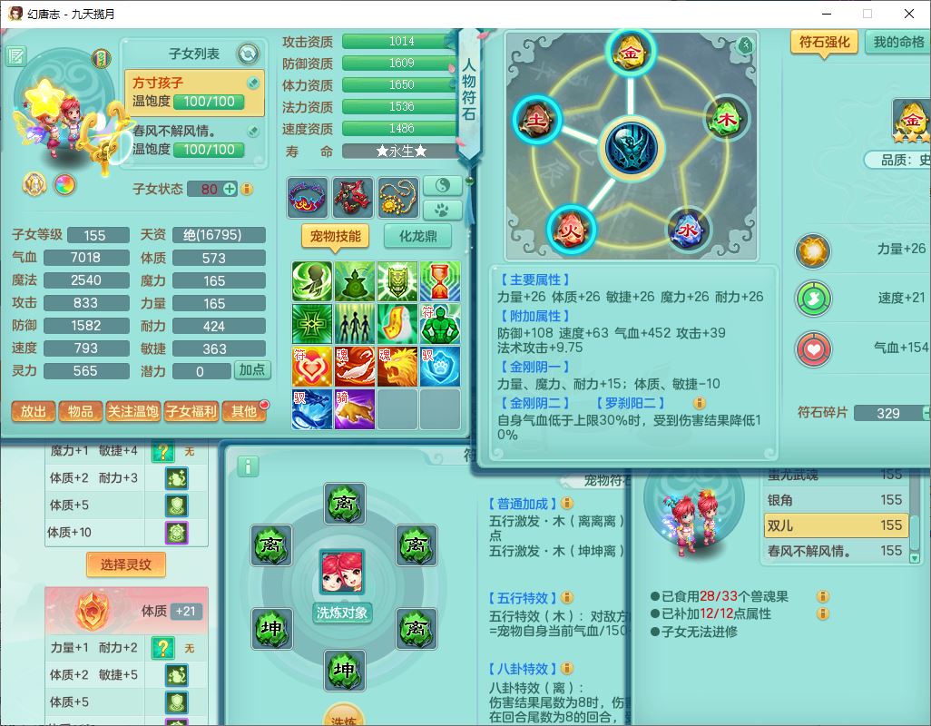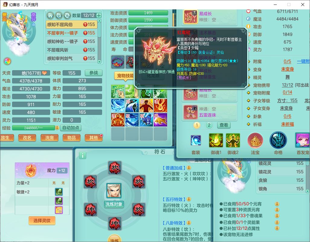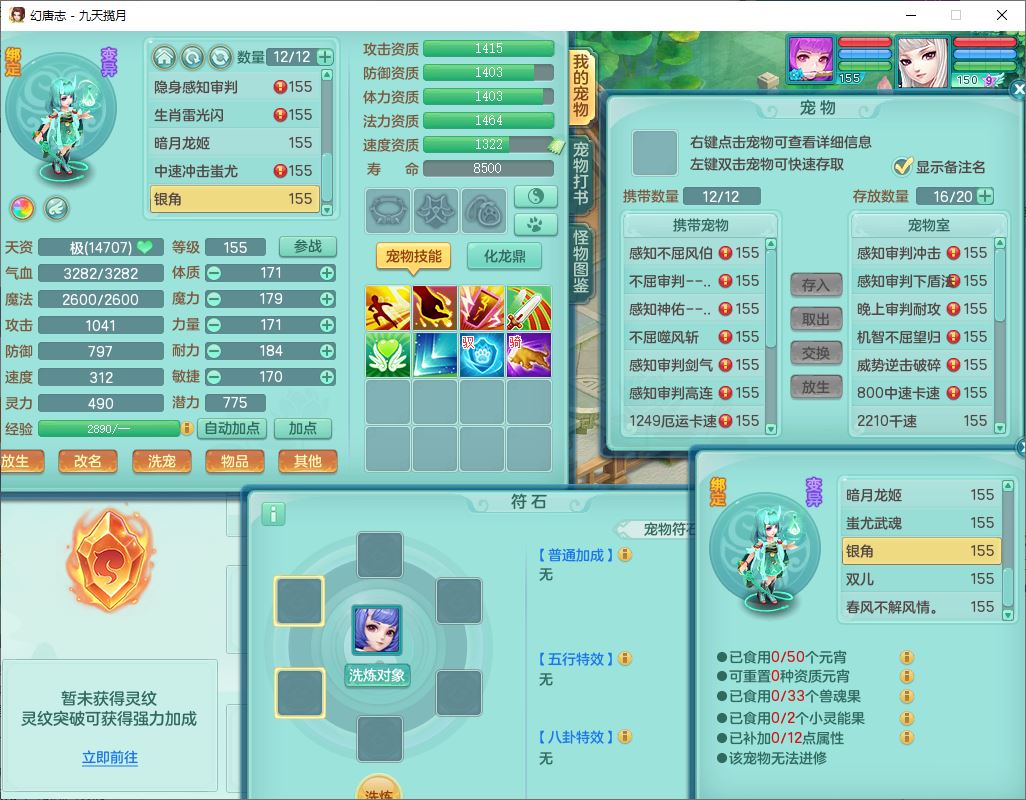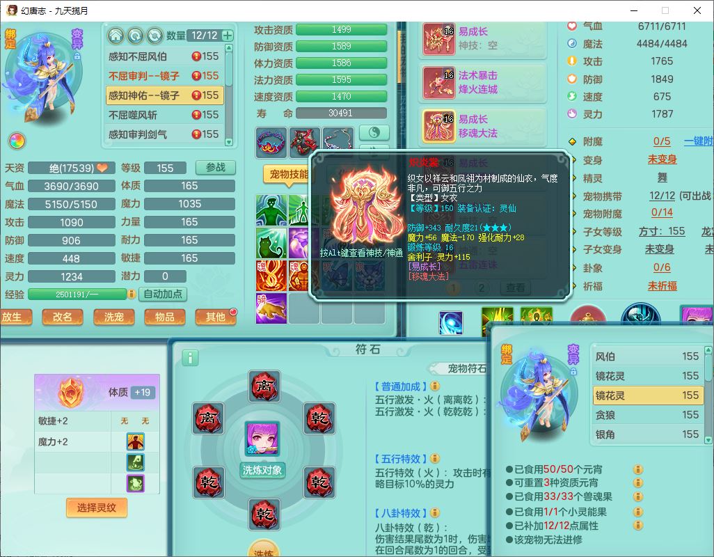 4381九天揽月159女魔王【潜龙号】精灵舞,1内1望归3镜花1龙姬1特殊兽决(琴音),8觉醒4宠皮7六字1五字10四字14只满果子,9红装备,法爆烽火武器,Y移魂衣服,Y慈航项链,五雷鞋子,一套辅助装备,鼎5.5+70+280,庭院153,56个仙兽灵,1双人飞行坐骑
