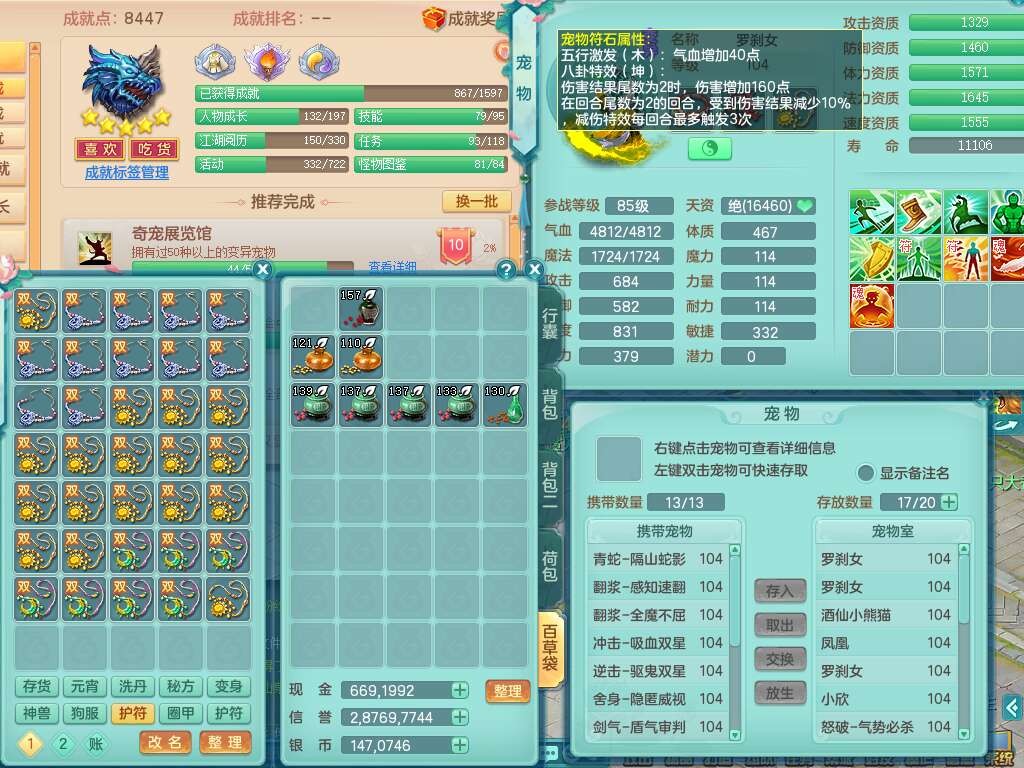 S22395,2020区99男万兽,1内胆神,1只觉醒,8位靓号,541易成长必杀单加武器,崩山单加衣服,神佑玉清链子,愤怒心神合一单加腰带,易成长单加30鞋子,仓库有548狂暴单加武器,542易成长奇珍单加33武器,3.0基础鼎,综合12只满果子,仓库62仙兽蛋,24神兽内丹碎片,双人坐骑,带百万银币。