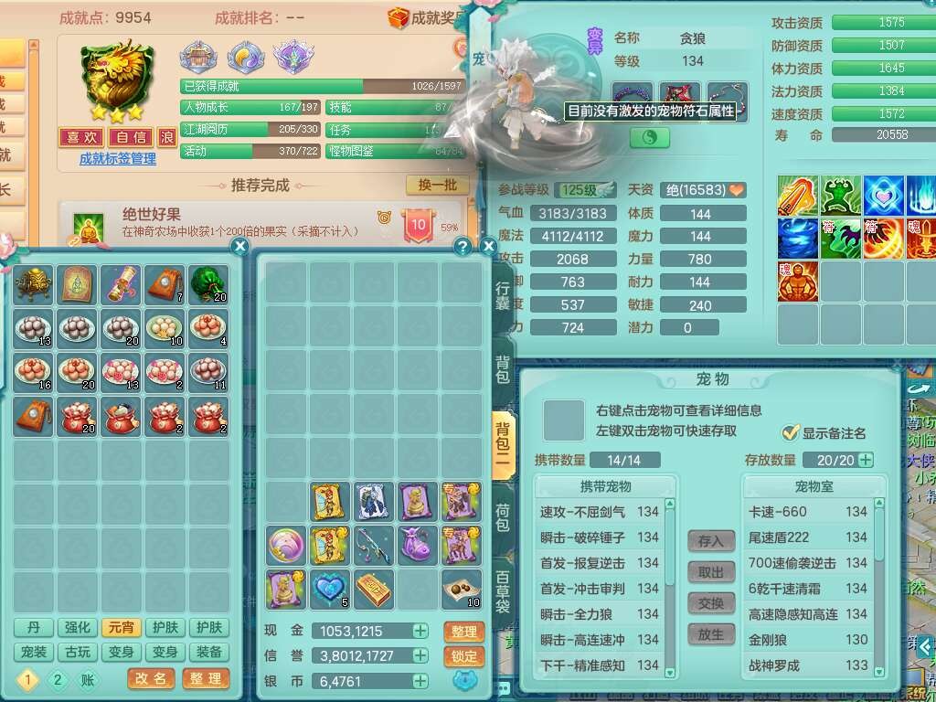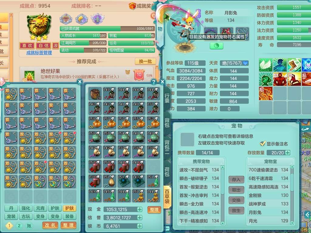 L22392任剑逍遥129男龙宫,精灵歌,1龙没内,2内胆神,6只觉醒,8宠皮,714法爆烽火单加45武器,212双红易成长驾驭术单加41链子,4.0基础鼎,9个纯六字,4个五字,17只满果子,宠排在榜,3只坐骑。