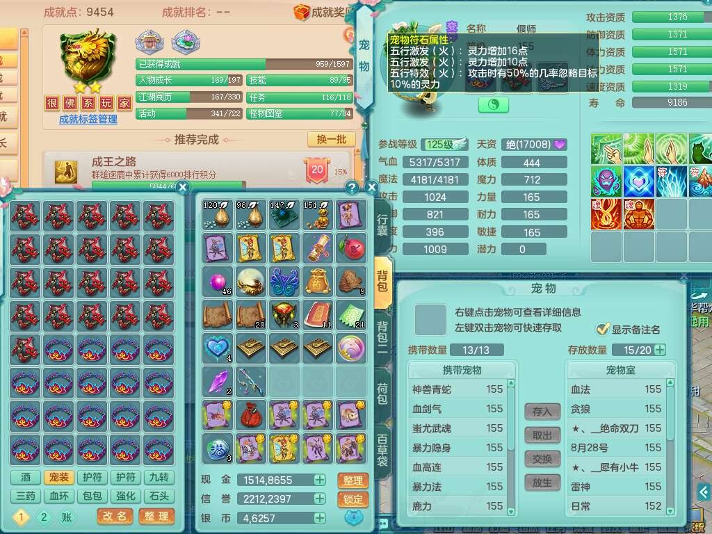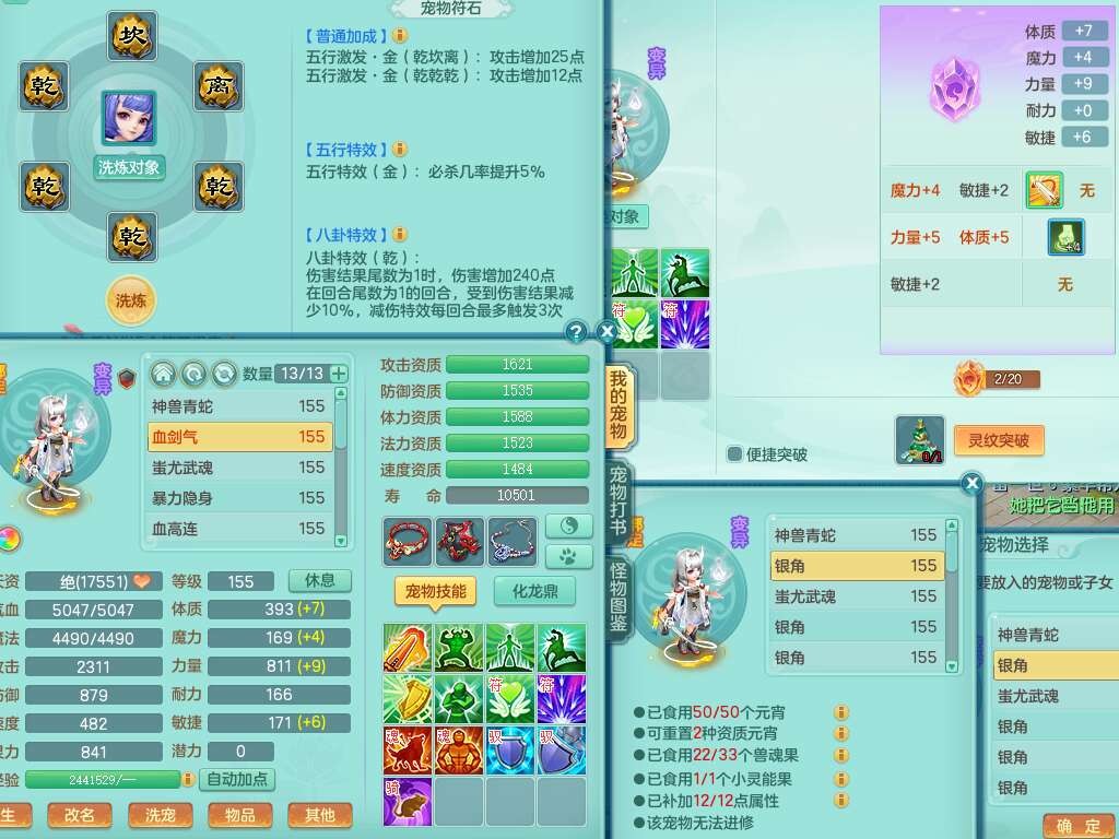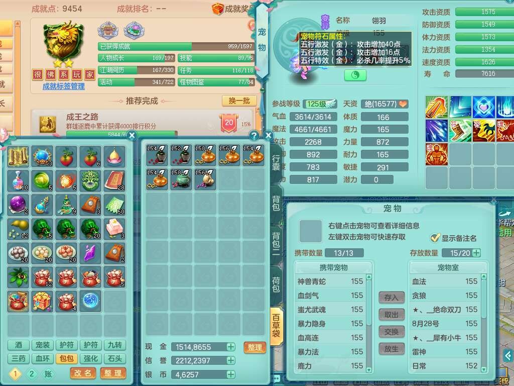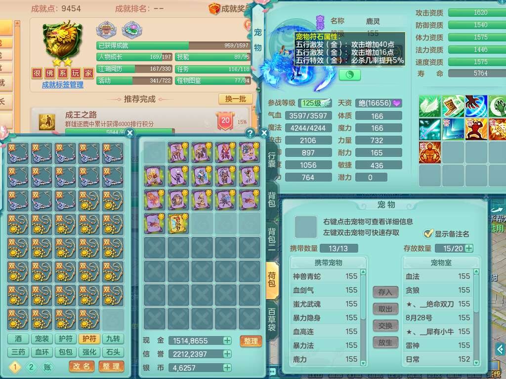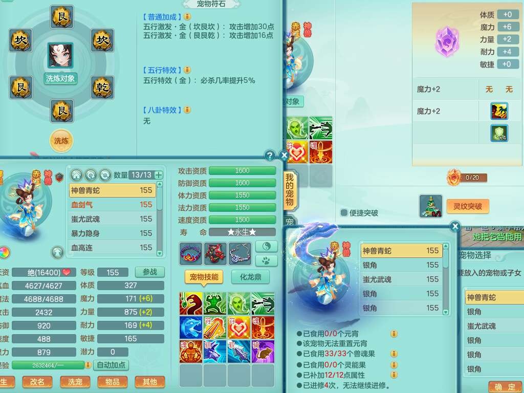 S22388风华绝代159男龙宫,精灵歌,1内胆神,1特殊(月光),击退单加56武器,有928法暴单加55武器,易成长单加56衣服,易成长激励单加52鞋子,4.5基础鼎,综合4只满果子。