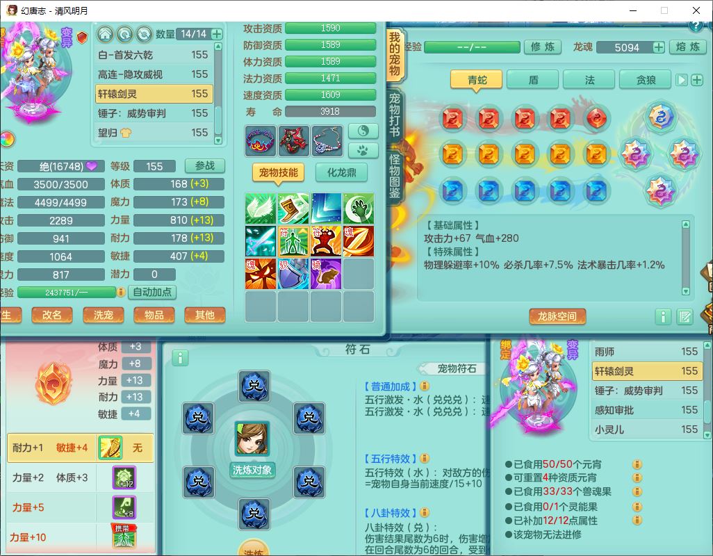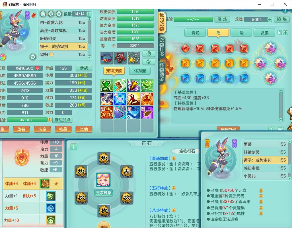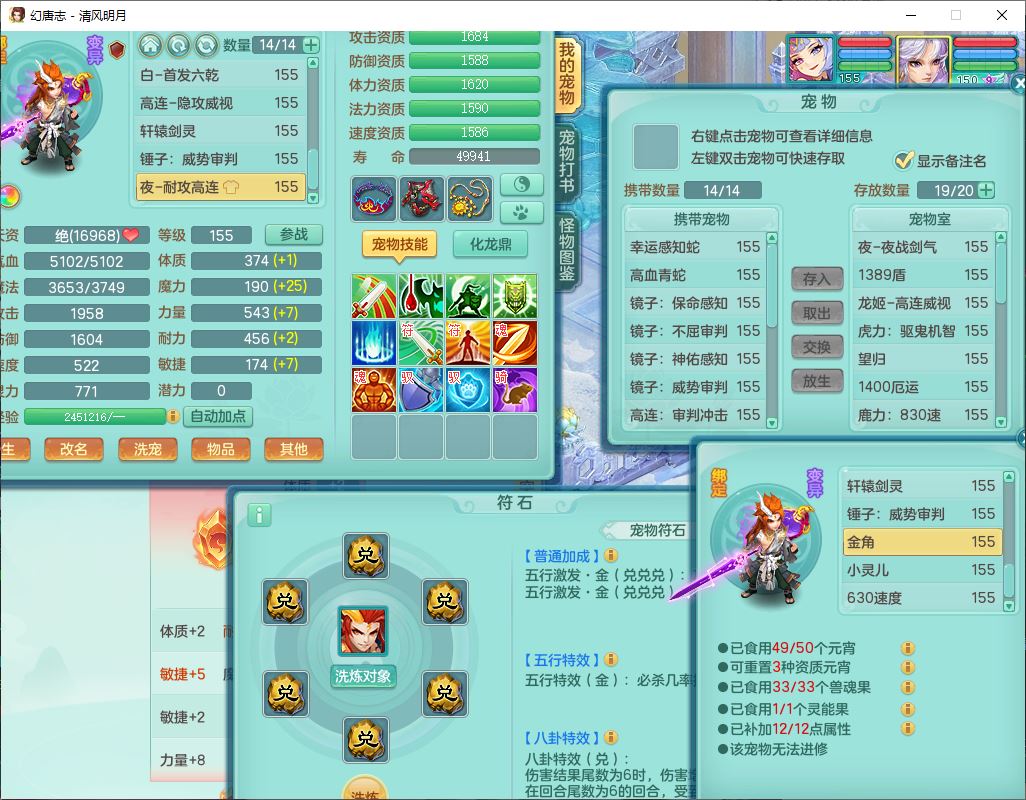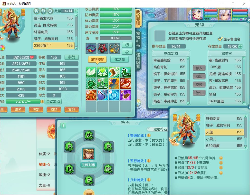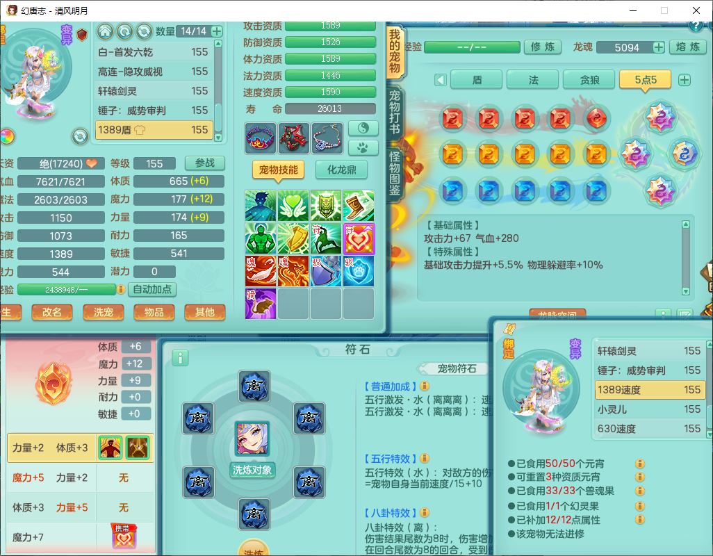 62444清风明月159男魔王【准潜龙号,差3条主符石1条附加1颗赤炎】精灵舞,2内丹青蛇1望归4镜花1龙姬1金炉,12觉醒5宠皮11六字3五字7四字20只满果子,10红双法缭星辰之拥装备,五雷帽子,法爆魔音武器,法缭晶清衣服,266单加Y四灵项链,Y烽火腰带,法缭鞋子,一套12红辅助装,Y笑里衣服,Y激励武器,幸运迅捷守护鞋子,鼎5.5+280,185天月卡,冰晶庭院157,永久外观、精灵皮肤,18个仙兽灵,34个内丹碎片,2双人坐骑(1飞行),带两个156奶粉,装备宝宝齐全