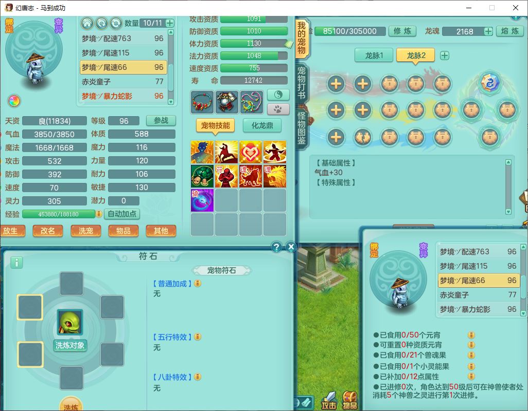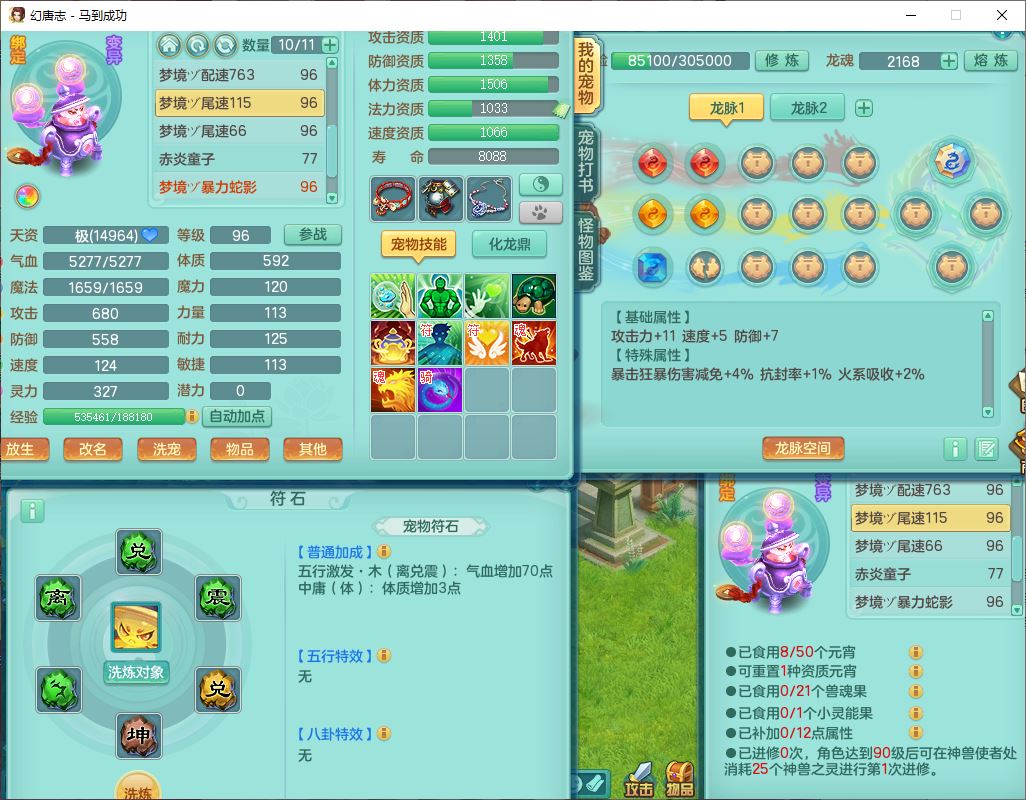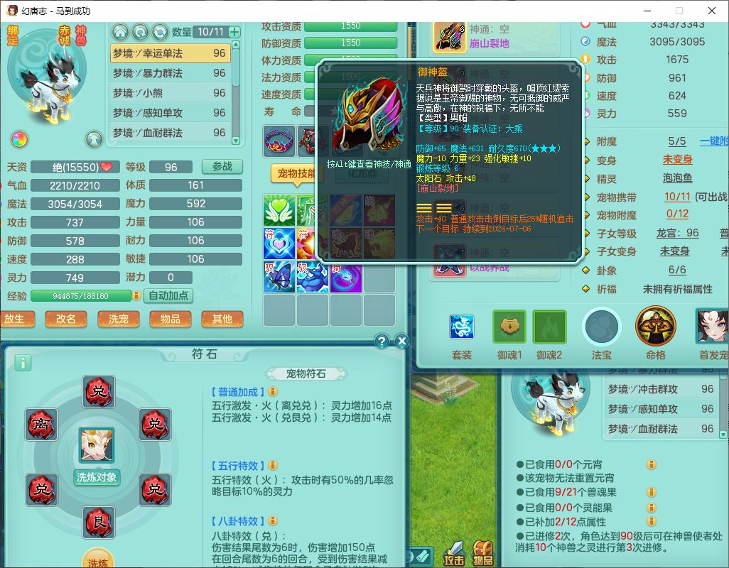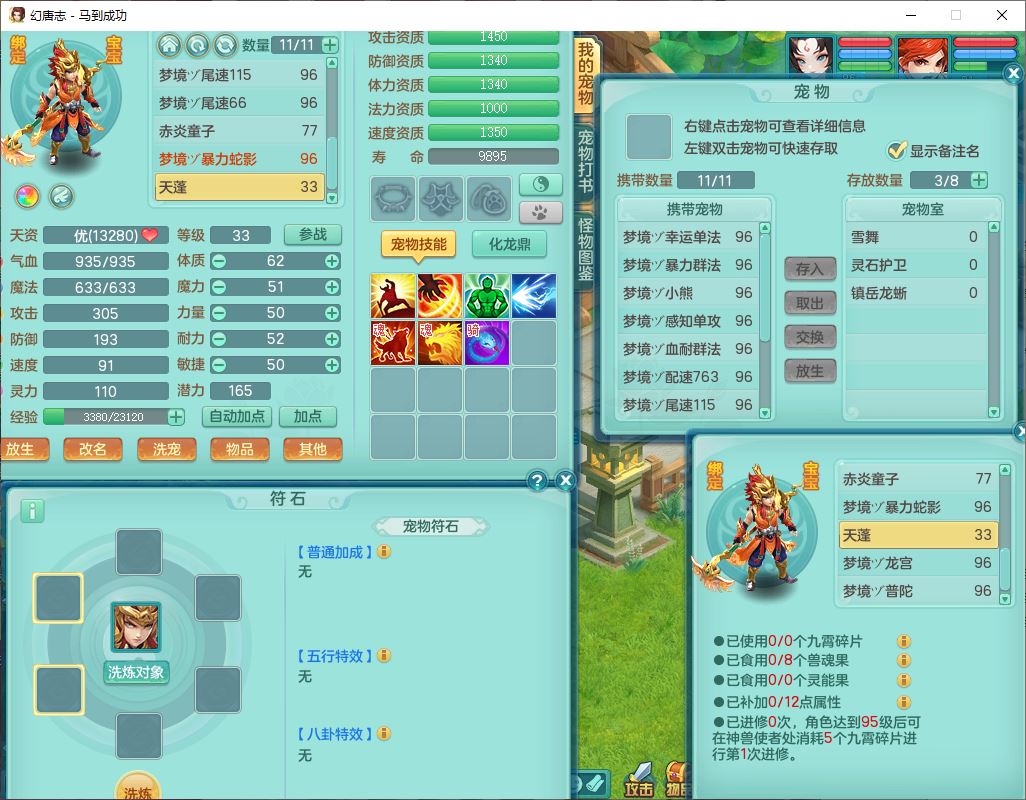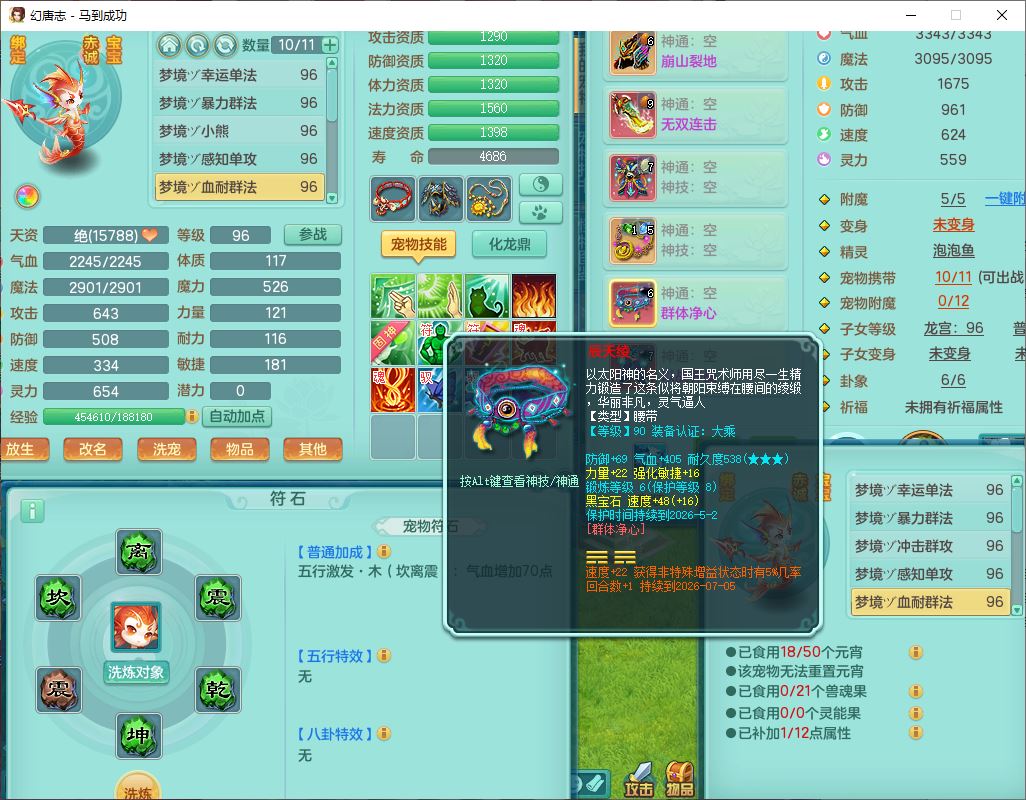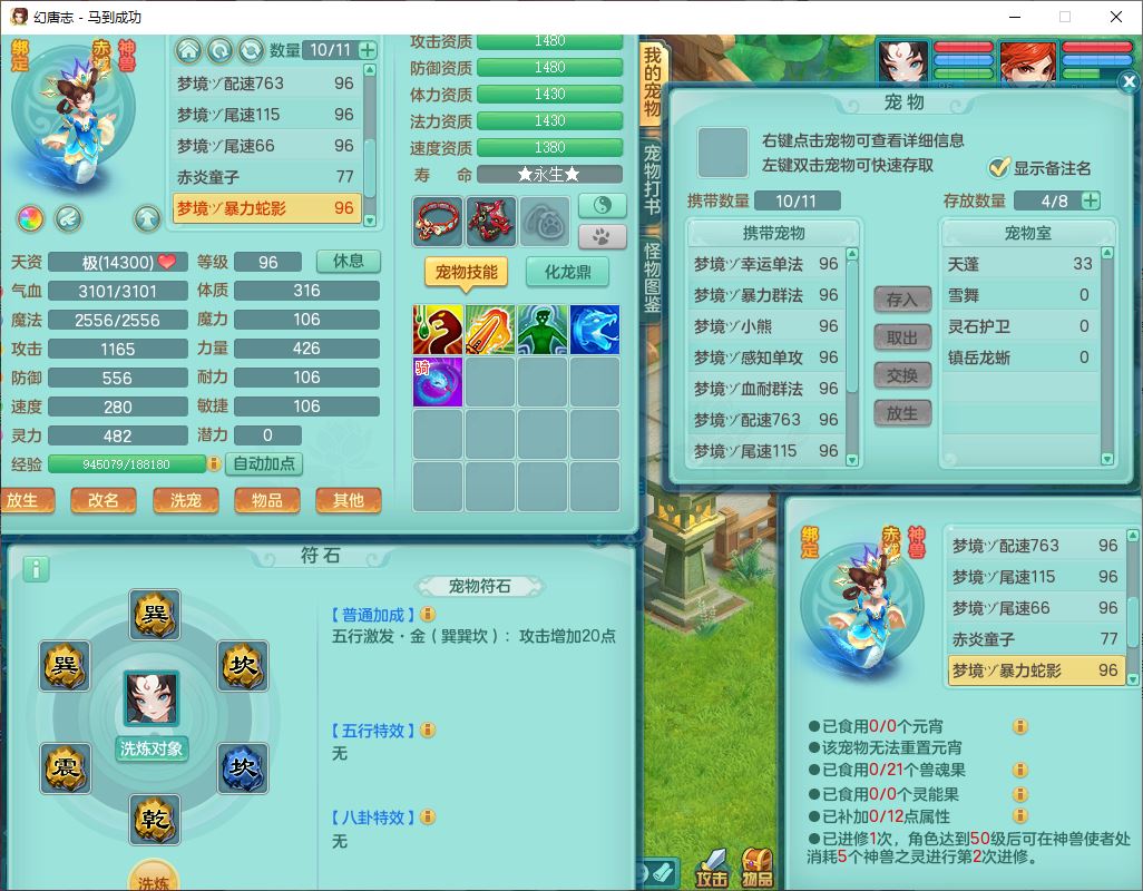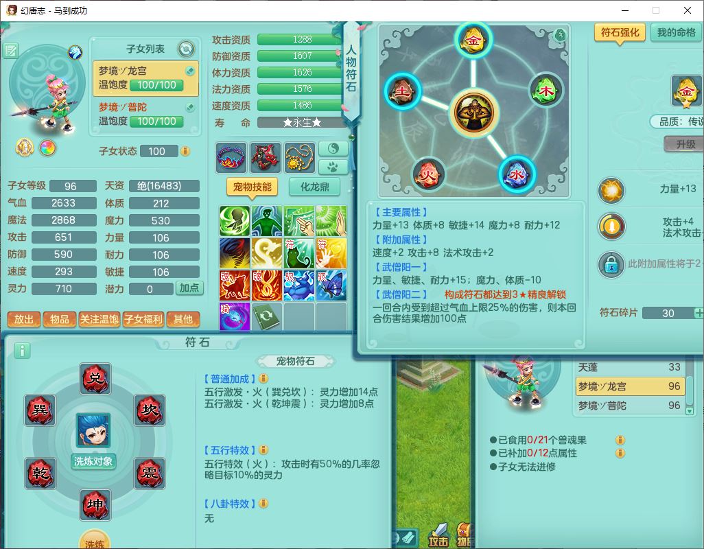 99801马到成功91男无名体敏耐精灵,2神兽无内(1龙马1青蛇)1金炉1童子,七只成品满高书宝宝,2孩子(龙宫+普陀),装备齐全,破血武器,崩山帽子,以战鞋子,蛟龙五件套,142天月卡,6个内丹碎片,成就、宠排在榜,有时装头像,1双人飞行坐骑,带双重可换绑