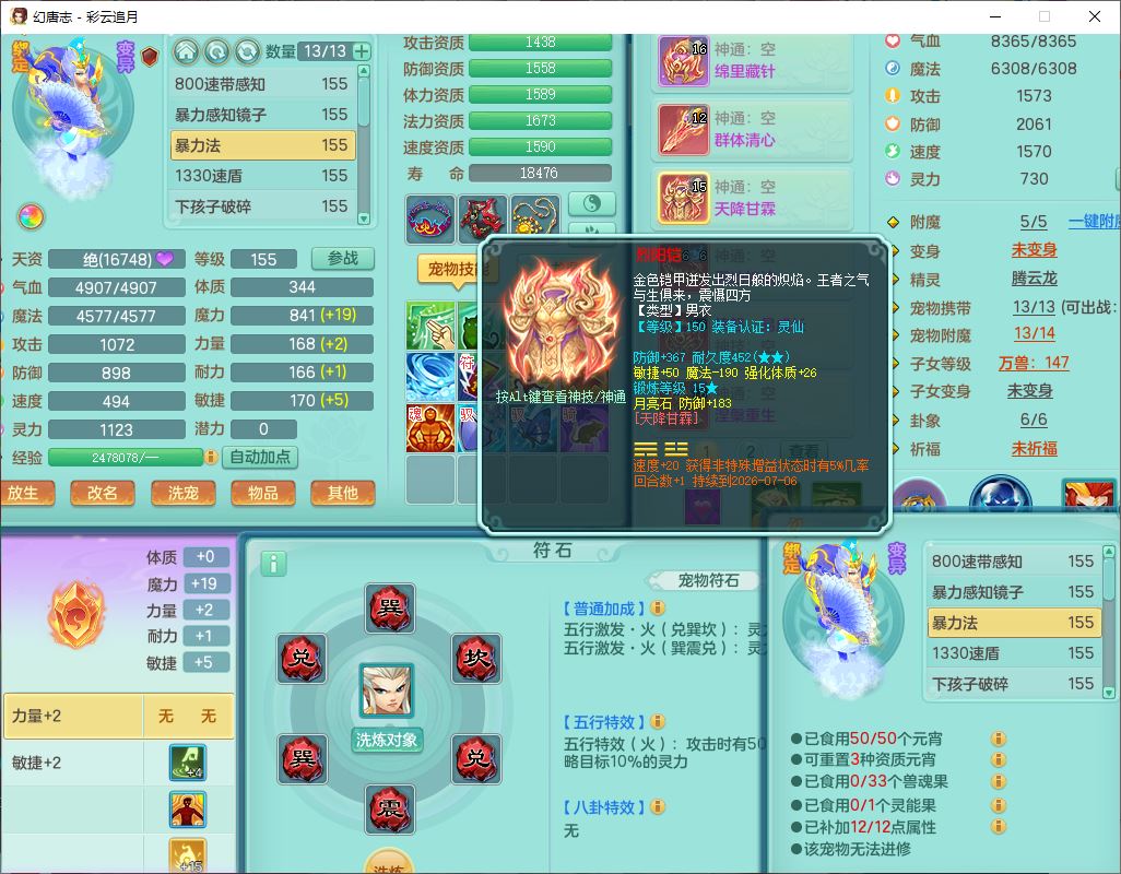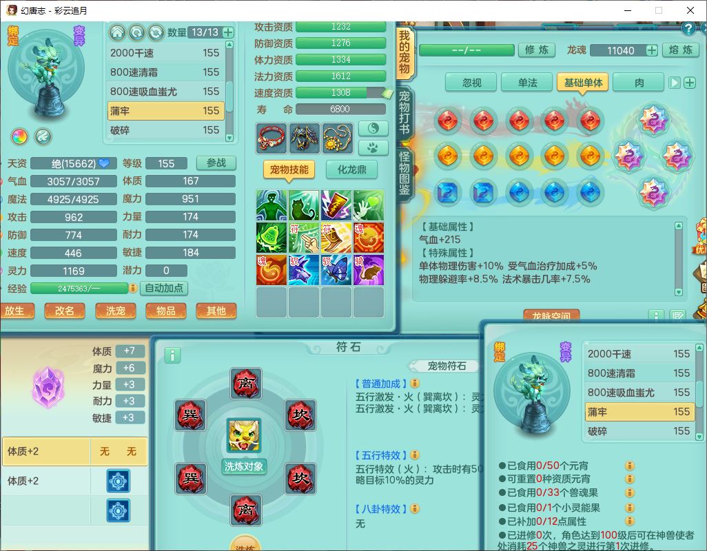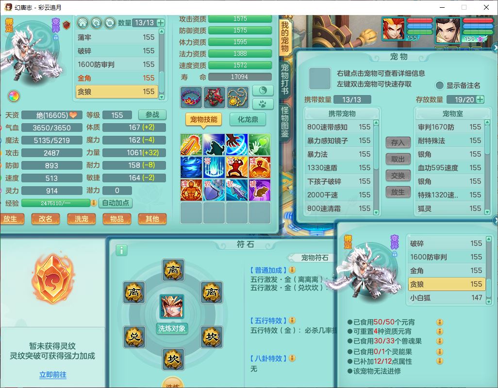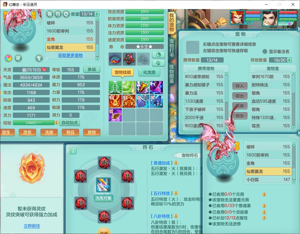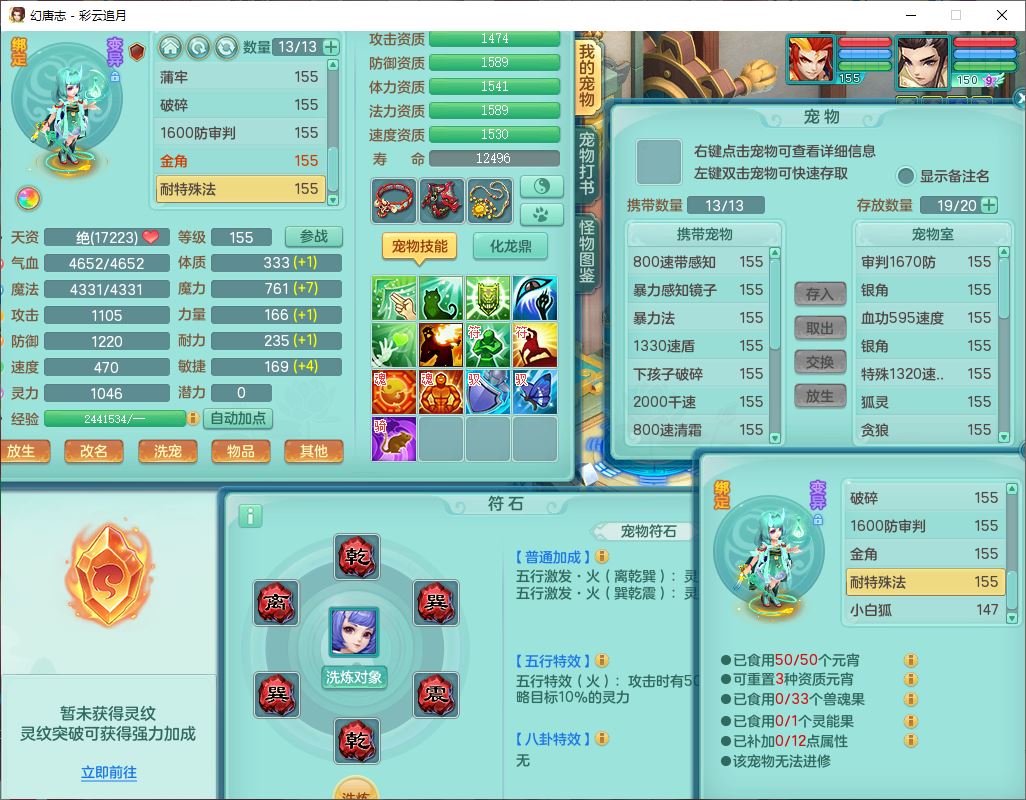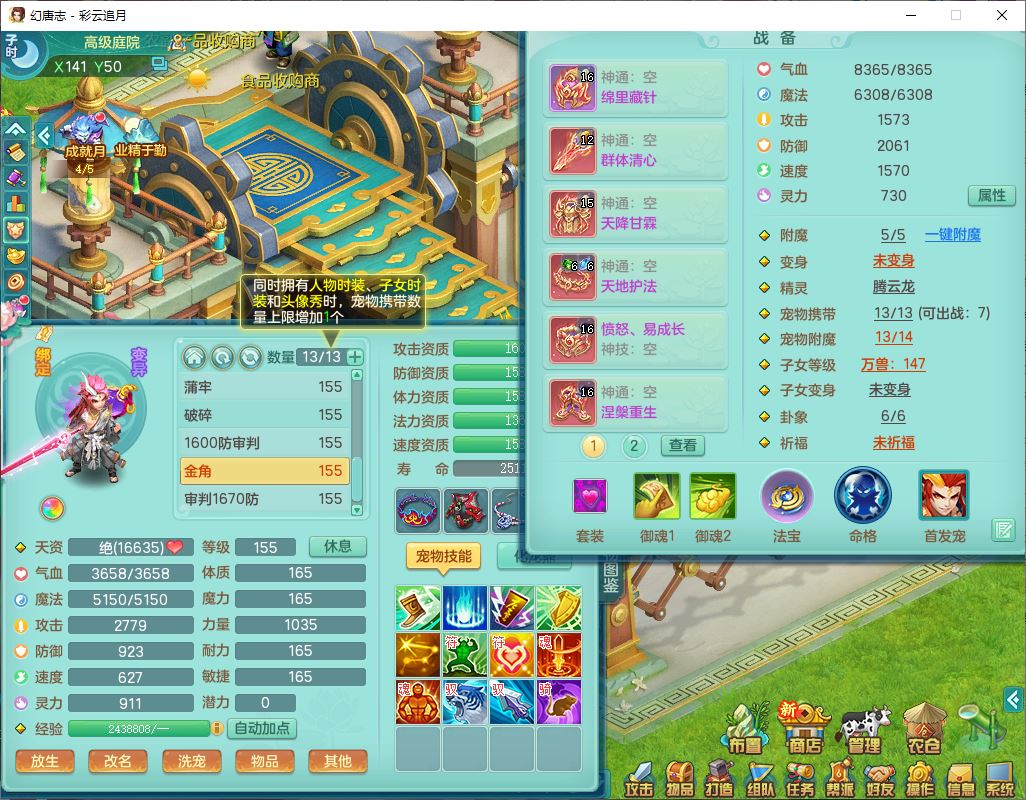 24347彩云追月159男方寸精灵舞,1龙(换,无内)1内1望归1镜花灵2特殊(烈焰,兽决虎虎),1觉醒2宠皮(1幻灵果)2六字10四字综合8只满果子,7红装备,愤怒Y腰带,鼎5.5+70,庭院163,永久头饰,1山海烛龙坐骑