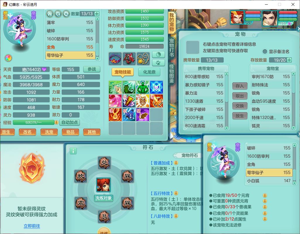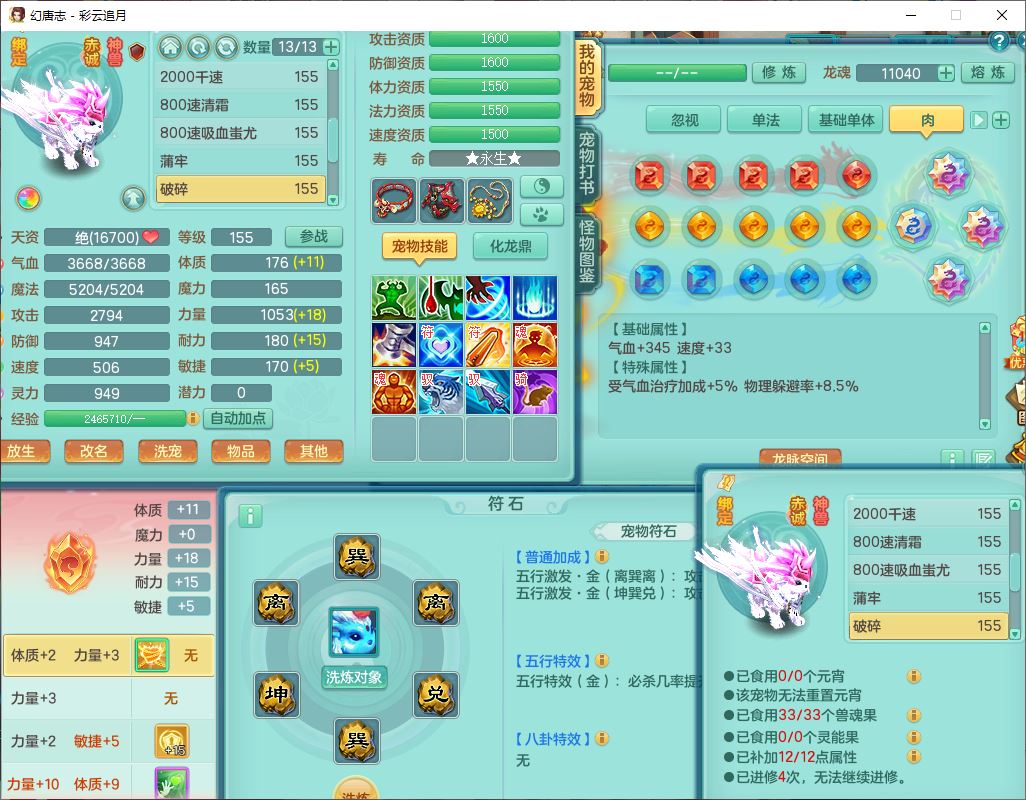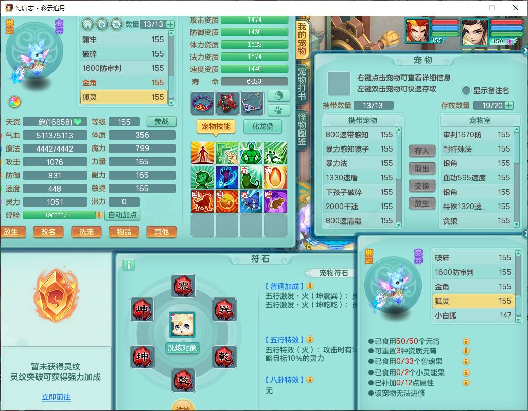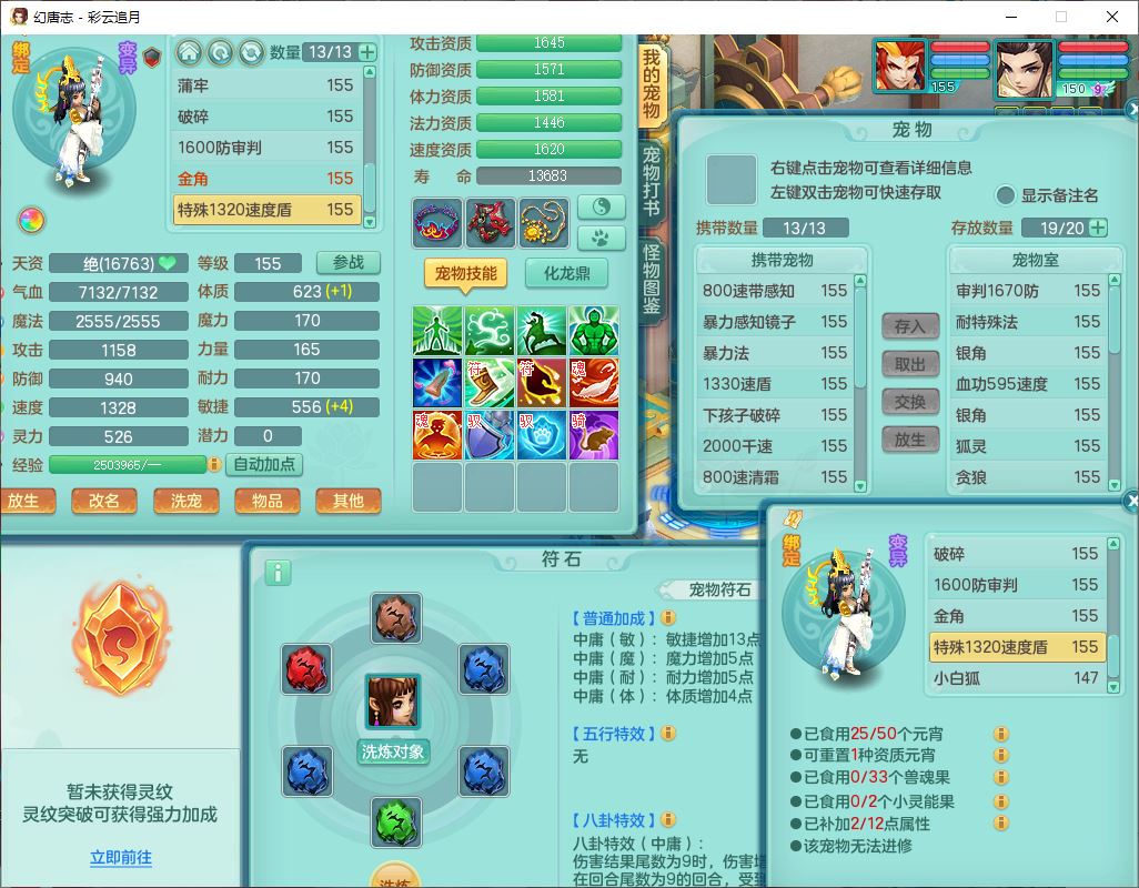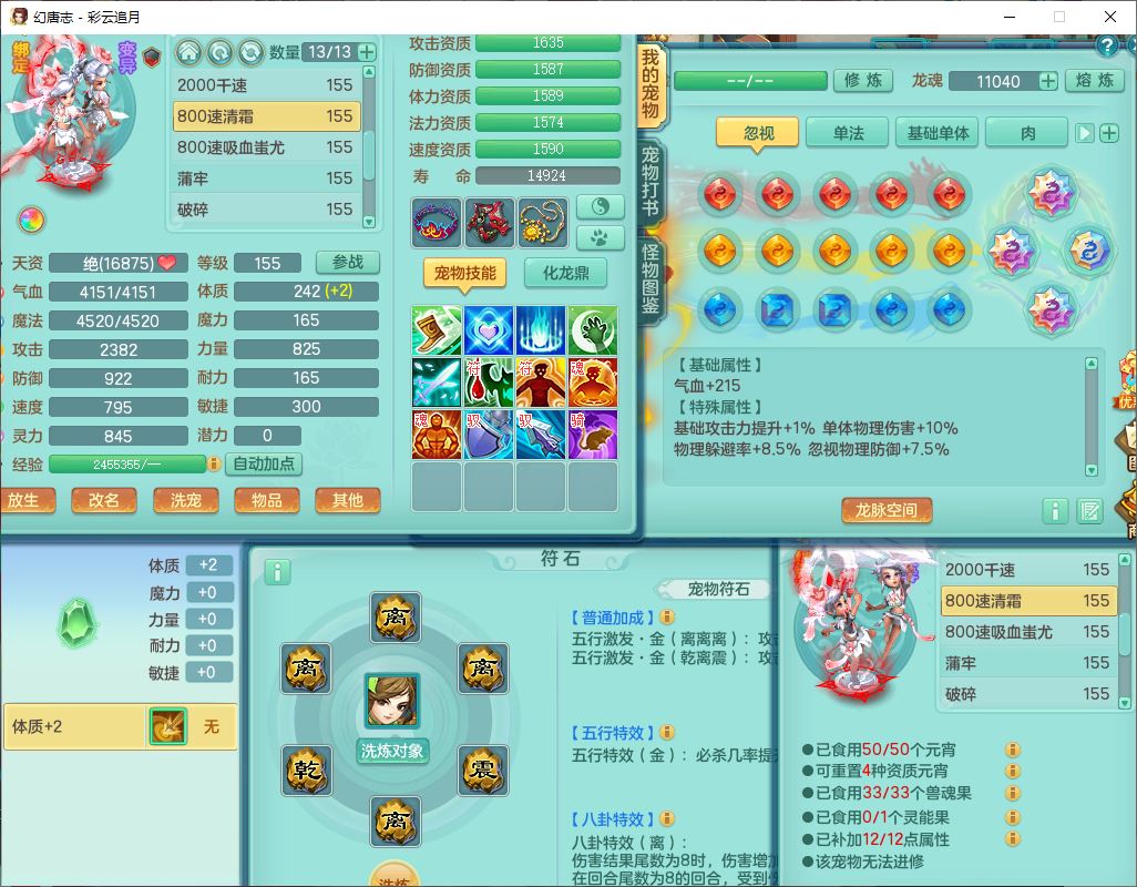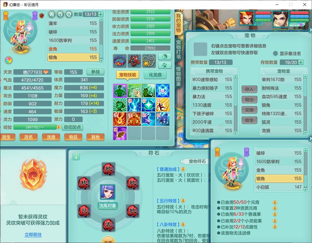 24347彩云追月159男方寸精灵舞,1龙(换,无内)1内1望归1镜花灵2特殊(烈焰,兽决虎虎),1觉醒2宠皮(1幻灵果)2六字10四字综合8只满果子,7红装备,愤怒Y腰带,鼎5.5+70,庭院163,永久头饰,1山海烛龙坐骑