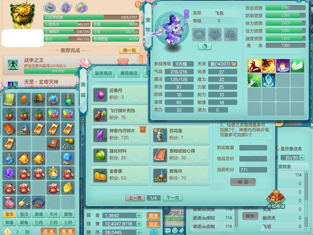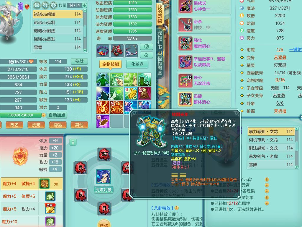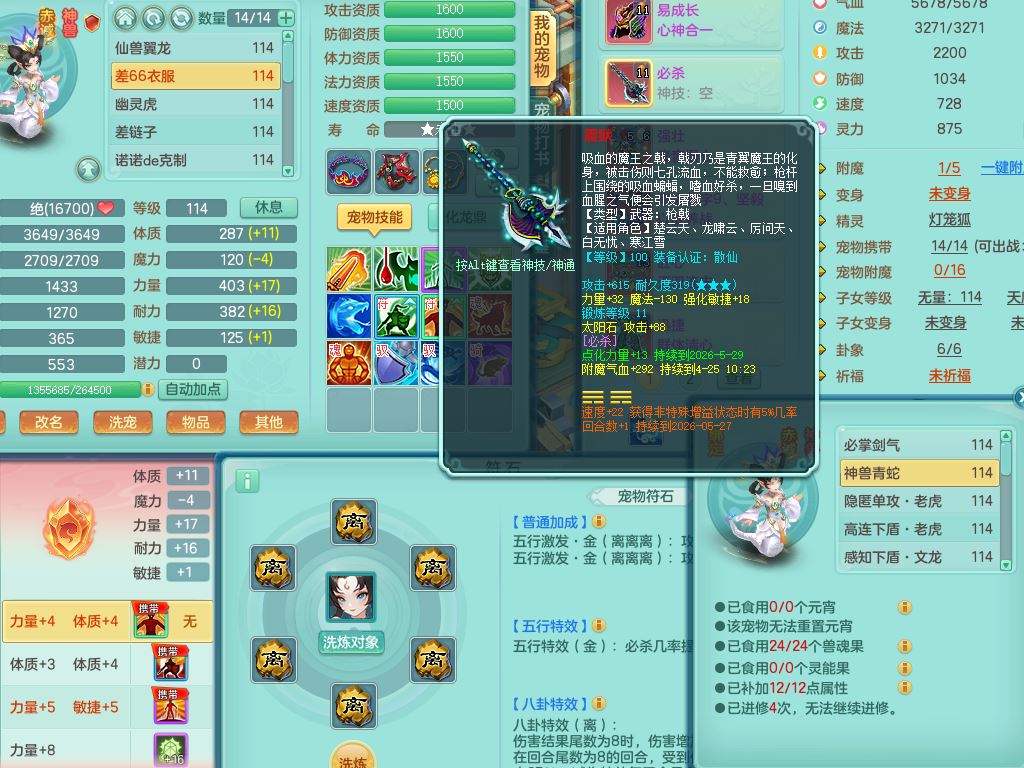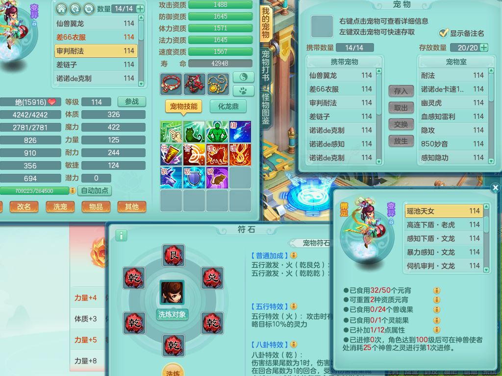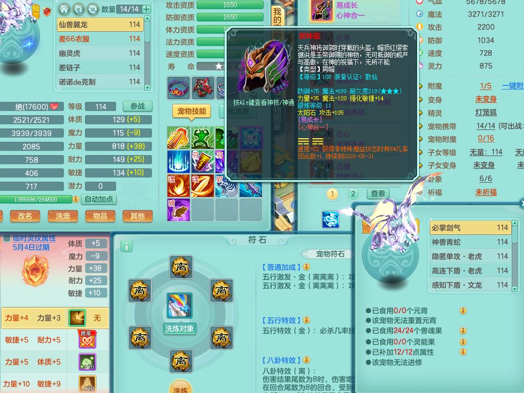 24344风驰电掣109男天宫【潜龙过半】准精灵怒,1龙(换,破境)1内(青蛇)1飞羽1炉子4宠皮,9觉醒3六字1五字11四字16只满果子,12红装备,Y心神帽子,必杀武器,强壮魔音衣服,幸运9坚毅以战项链,匠心破血腰带,迅捷玉清鞋子,鼎2.5+42+168,2套符石,60天月卡,庭院155,永久头饰、背饰、精灵皮肤,38个内丹碎片,2双人坐骑(1飞行)