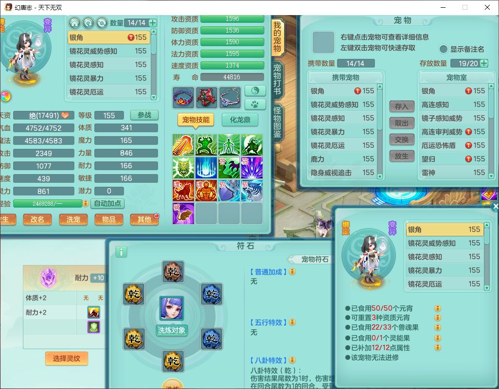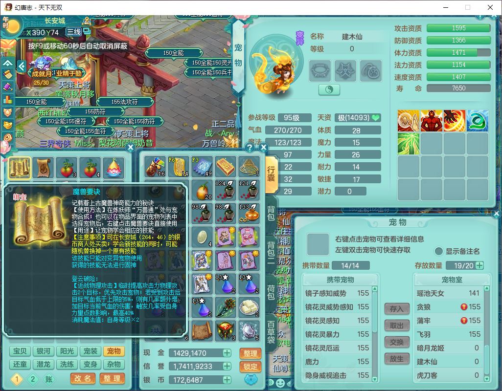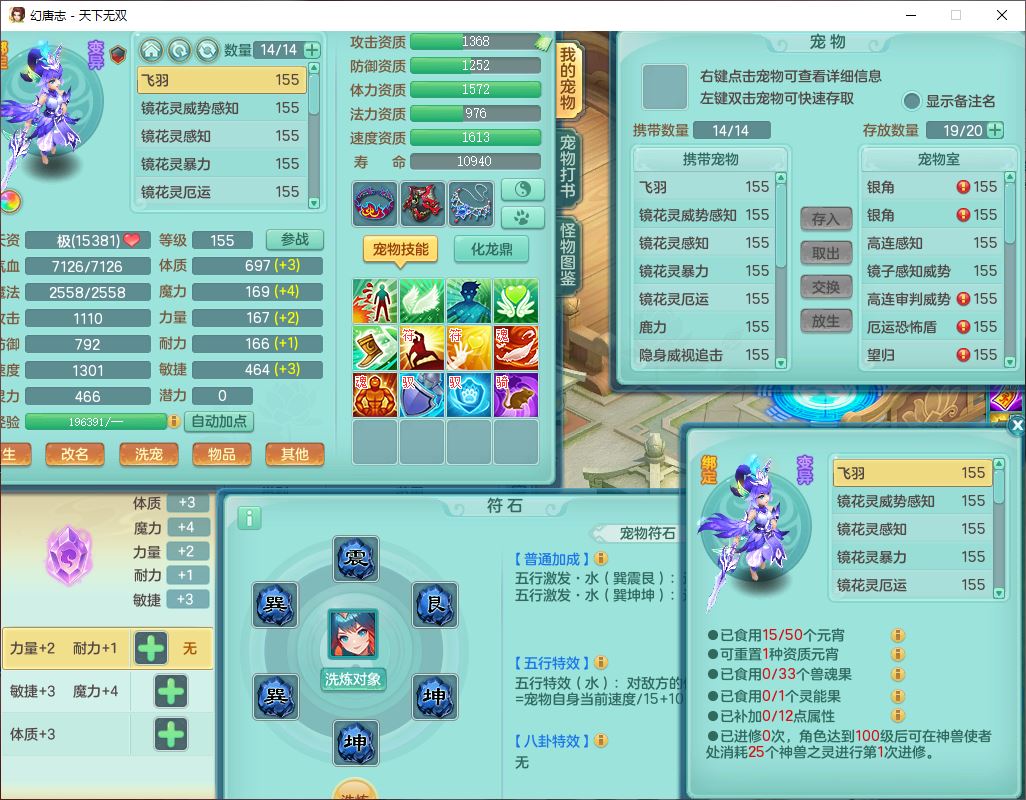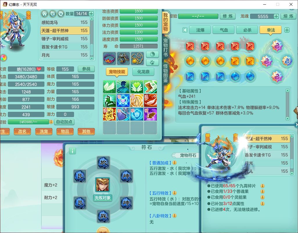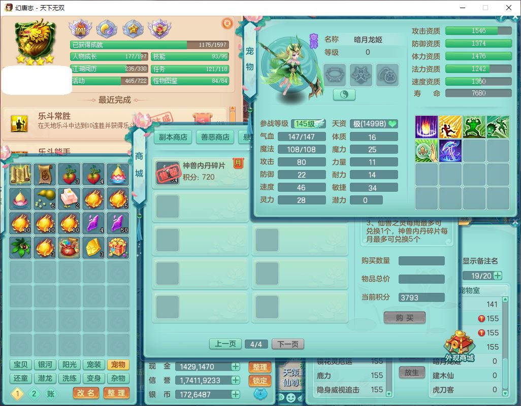 tx10460天下无双159男方寸精灵舞,1龙(无内)1内丹神(龙马)1龙马(无内)5镜花1望归1龙姬1建木2特殊(禁锢,兽决登云),5觉醒5六字1五字4四字综合7只满果子,11红星辰之拥装备,封印精通慈航帽子,封锁魔音武器,Y激励衣服,愤怒四海腰带,迅捷群体守备鞋子,鼎5.5+70,167天月卡,54内丹碎片,半页还童丹,172W神武币,1双人飞行坐骑