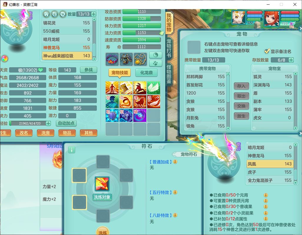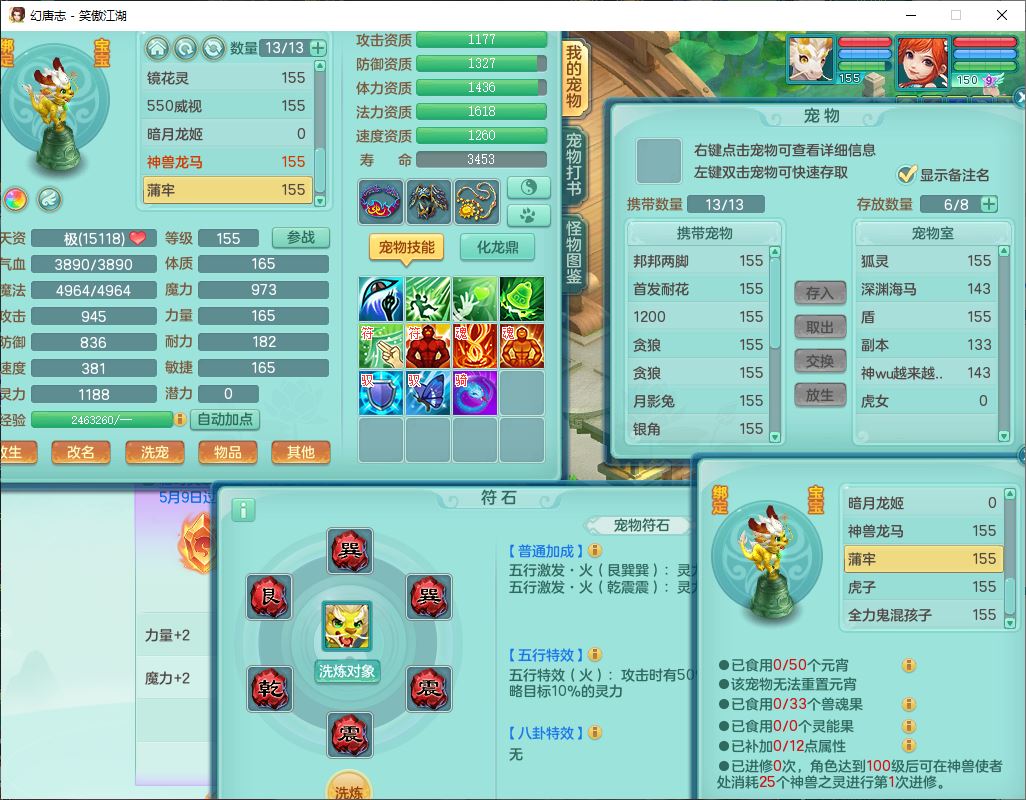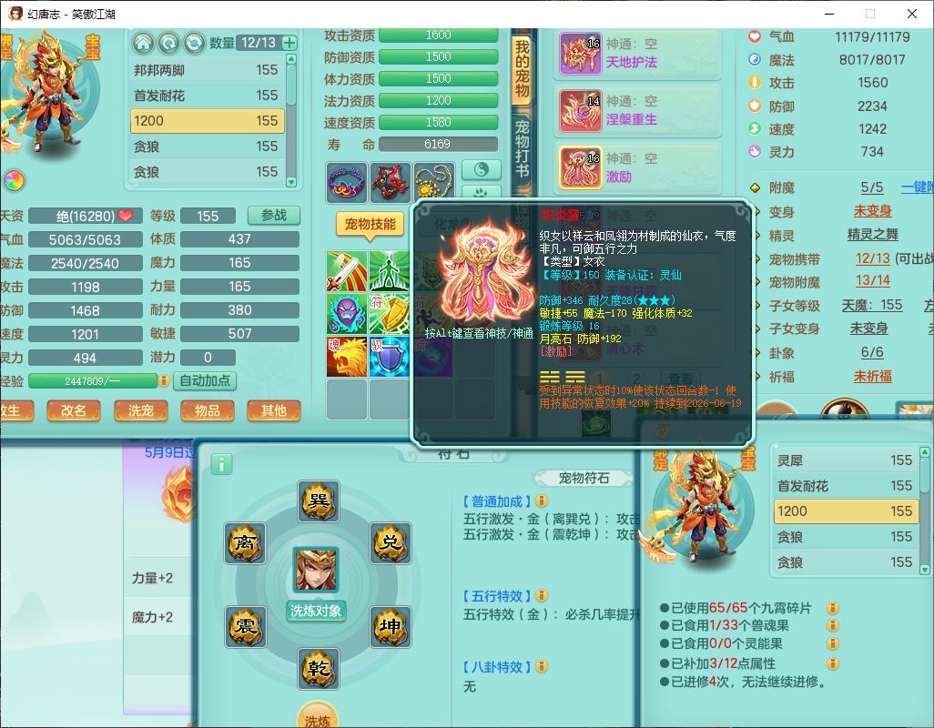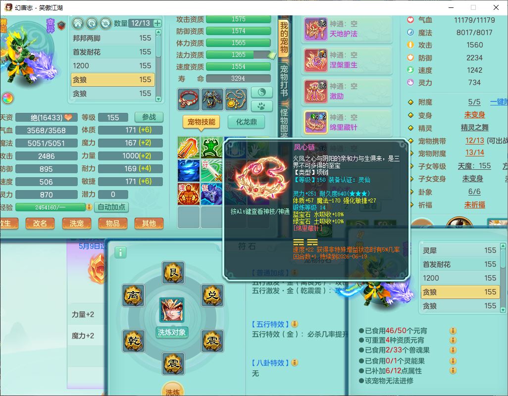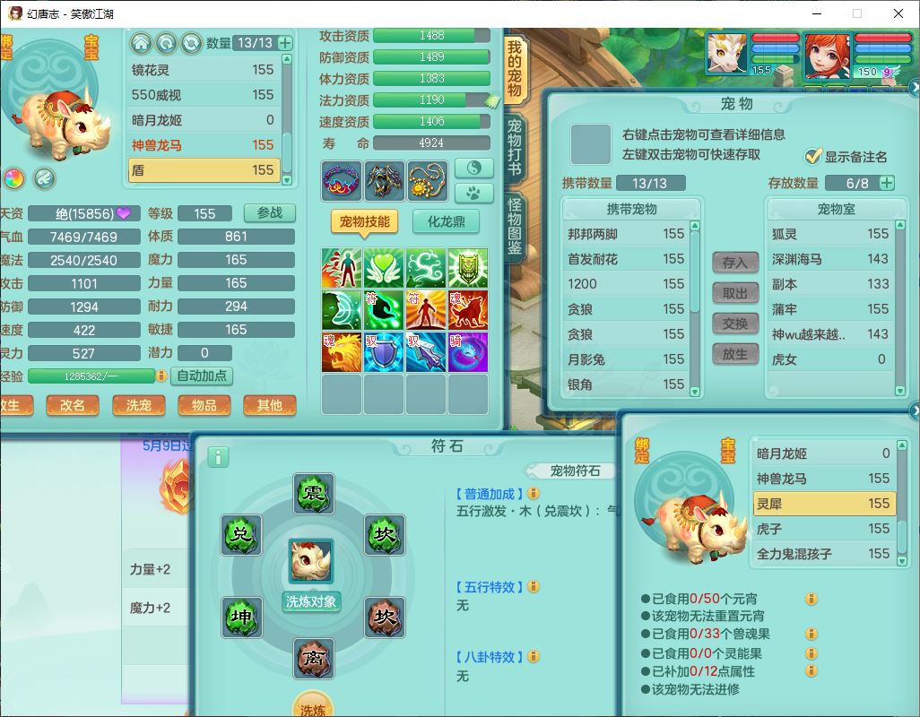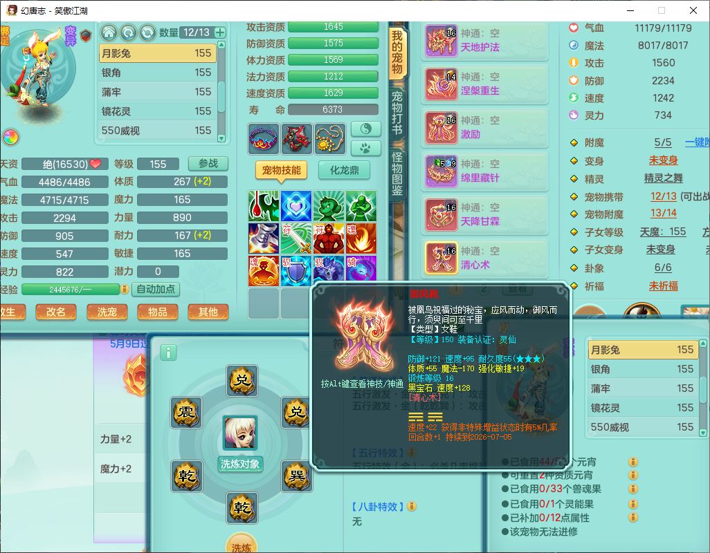 4385笑傲江湖159女无量精灵舞,1龙马(无内)2镜花,宝宝种类齐全,装备齐全,11个仙兽灵,25个内丹碎片