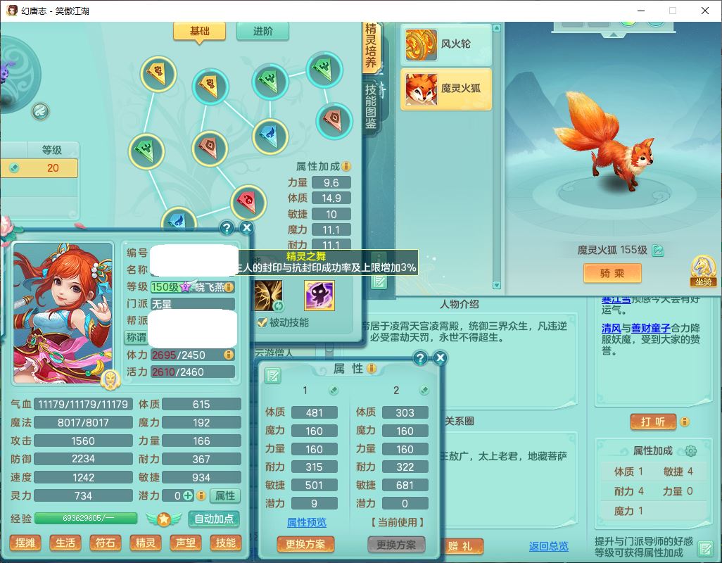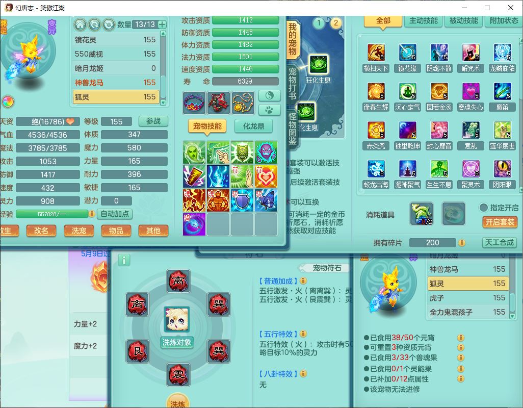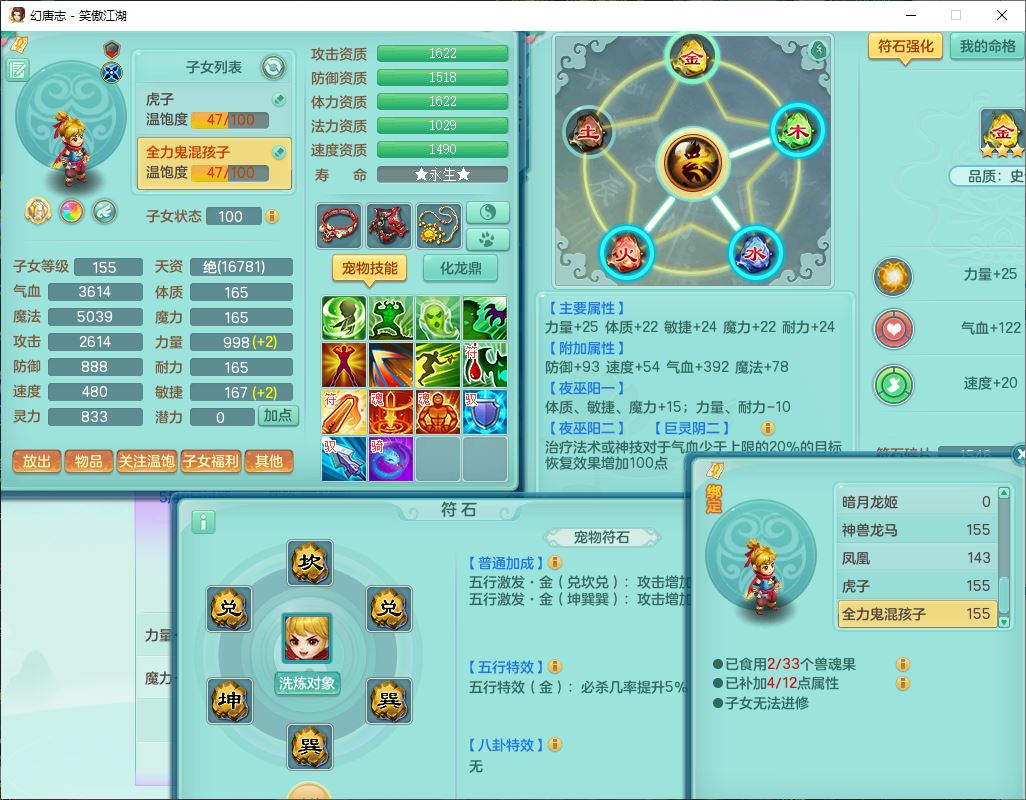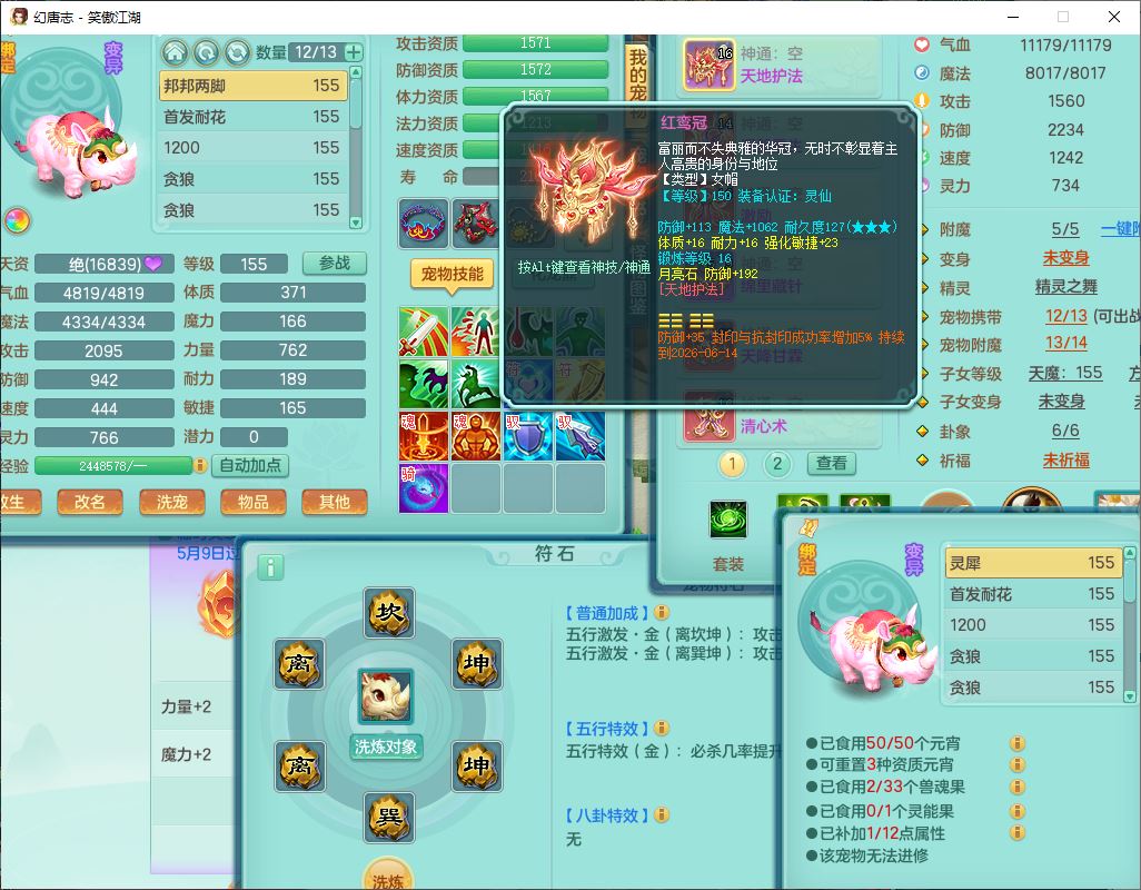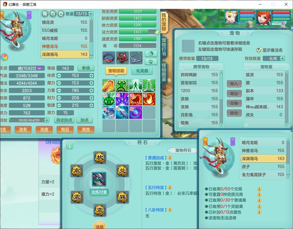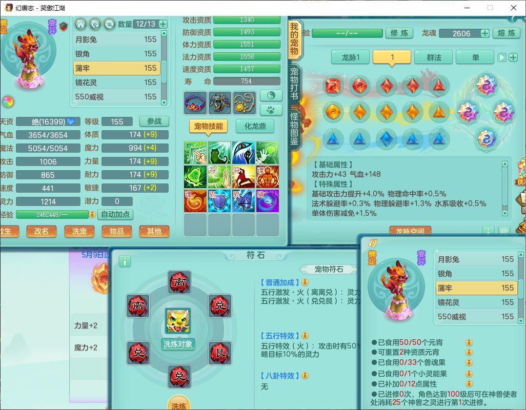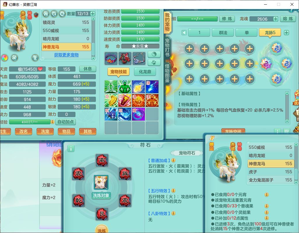 4385笑傲江湖159女无量精灵舞,1龙马(无内)2镜花,宝宝种类齐全,装备齐全,11个仙兽灵,25个内丹碎片