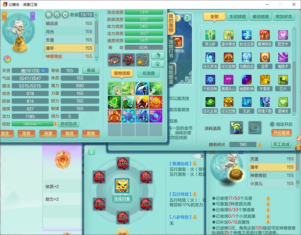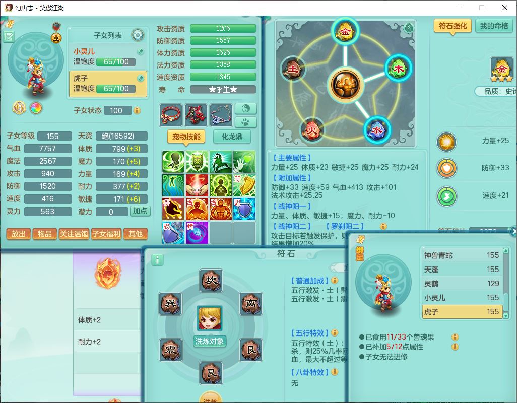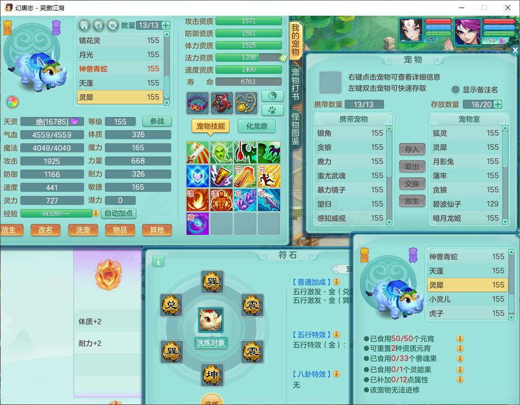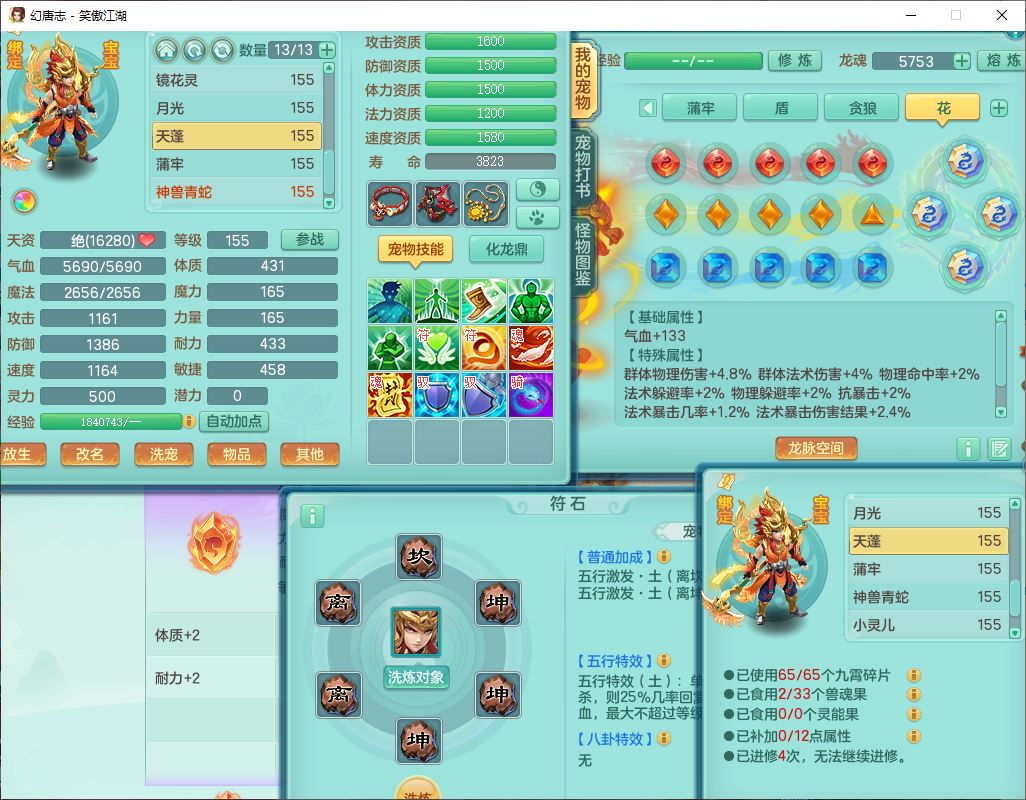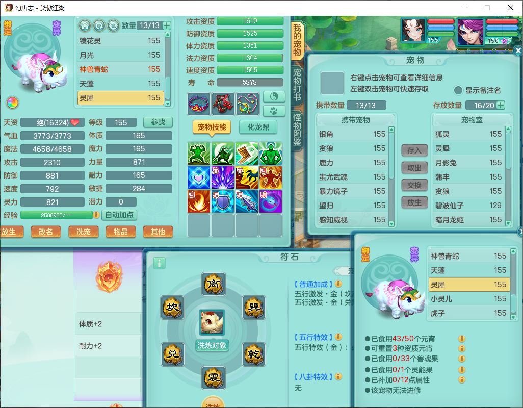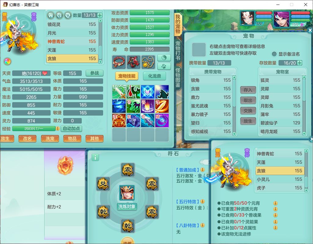 4384笑傲江湖159男万兽精灵歌,1青蛇(无内)1望归2镜花,宝宝种类齐全,装备齐全,狂暴武器,34个内丹碎片,1飞行坐骑,带成品159奶粉精灵舞,装备宝宝齐全