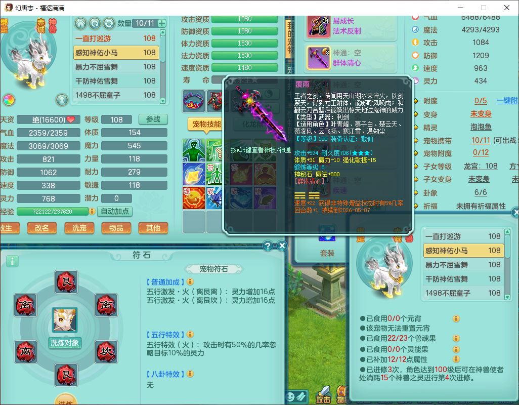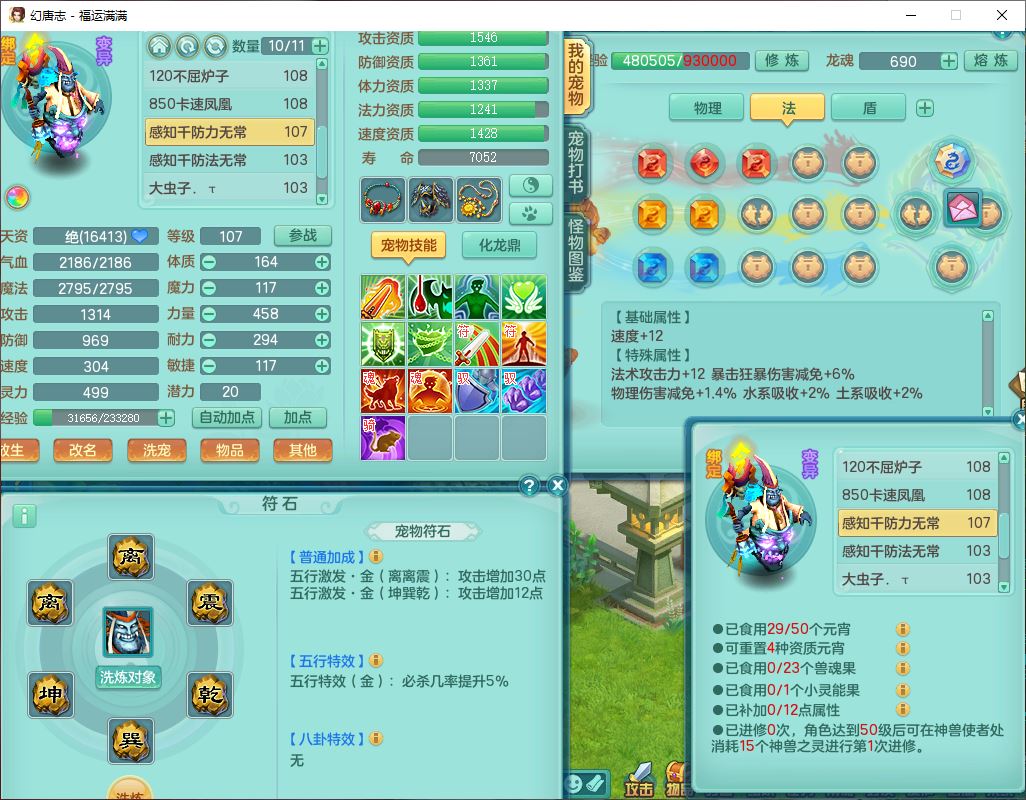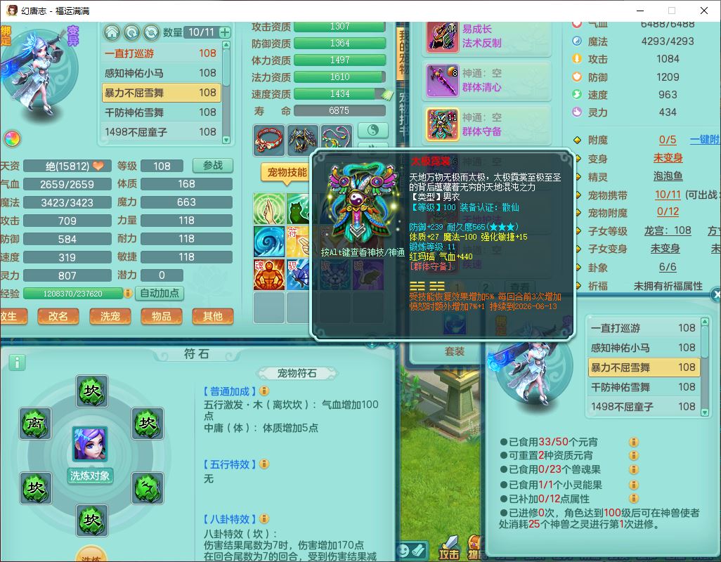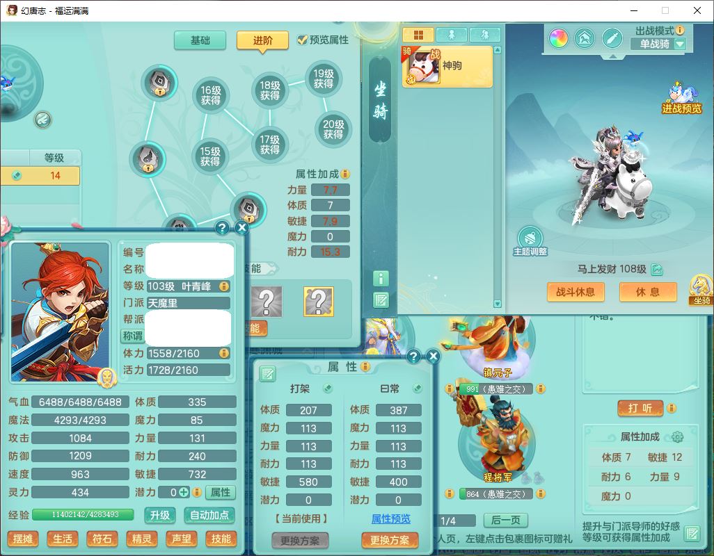 99803福运满满103男天魔【马上发财+火焰之力】10级精灵,2内(1青蛇1龙马)2翻江1童子1金炉,8只成品满高书宝宝,2孩子(龙宫+方寸),装备齐全,Y法术反制武器,119天月卡,满修炼,永久头饰、脸饰,24个内丹碎片,100多w神武币