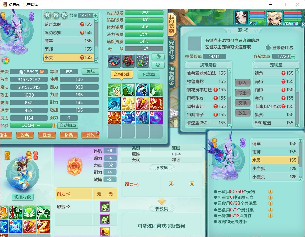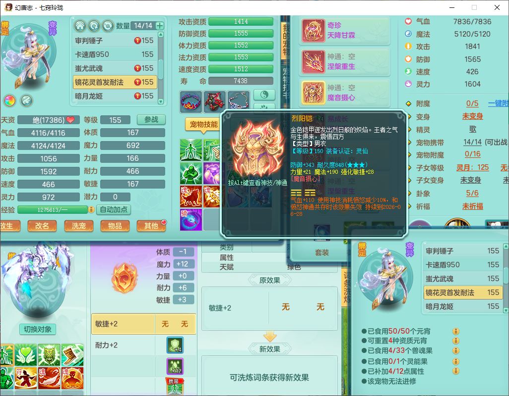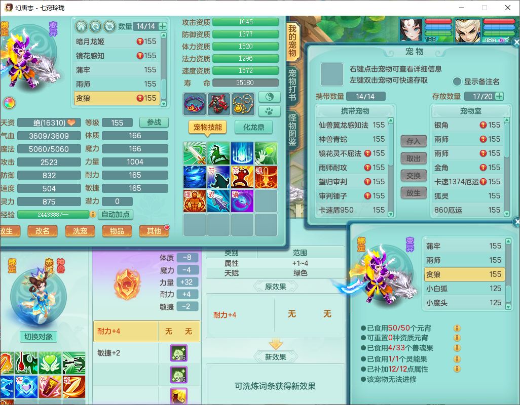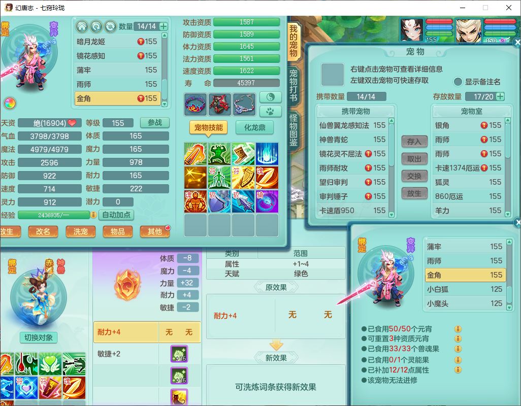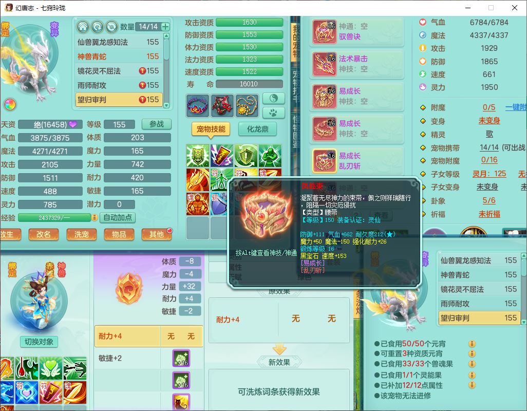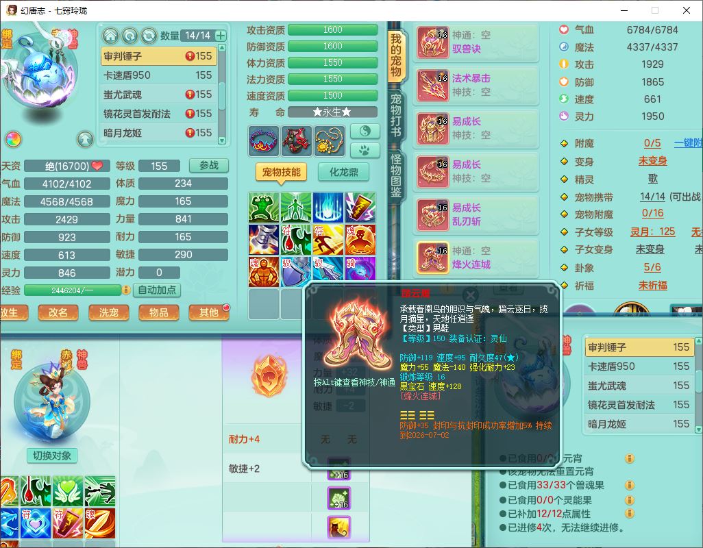 4383七窍玲珑159男天宫精灵舞,2龙(1换,无内)2内(1青蛇)23镜花灵1龙姬,2宠皮12只满果子,7红装备,1950灵力,法爆武器,268Y项链,Y双红腰带,一套辅助愤怒5特,鼎4.5+70+280,2套符石,永久外观,精灵皮肤,飞行双人坐骑