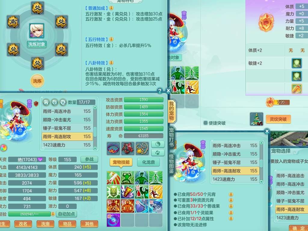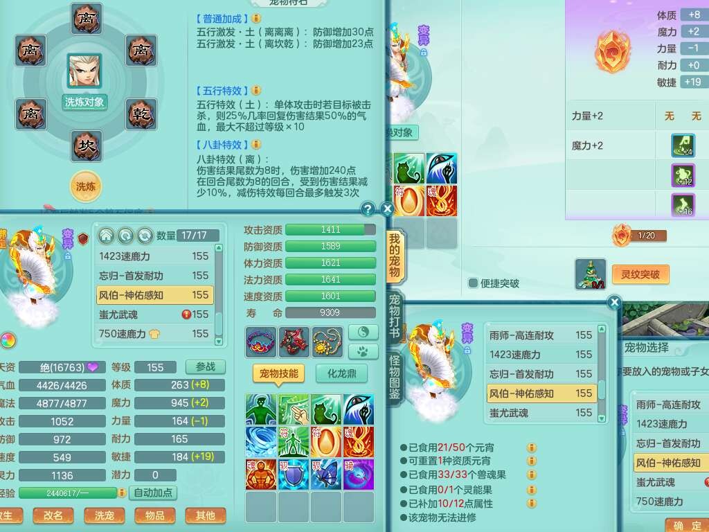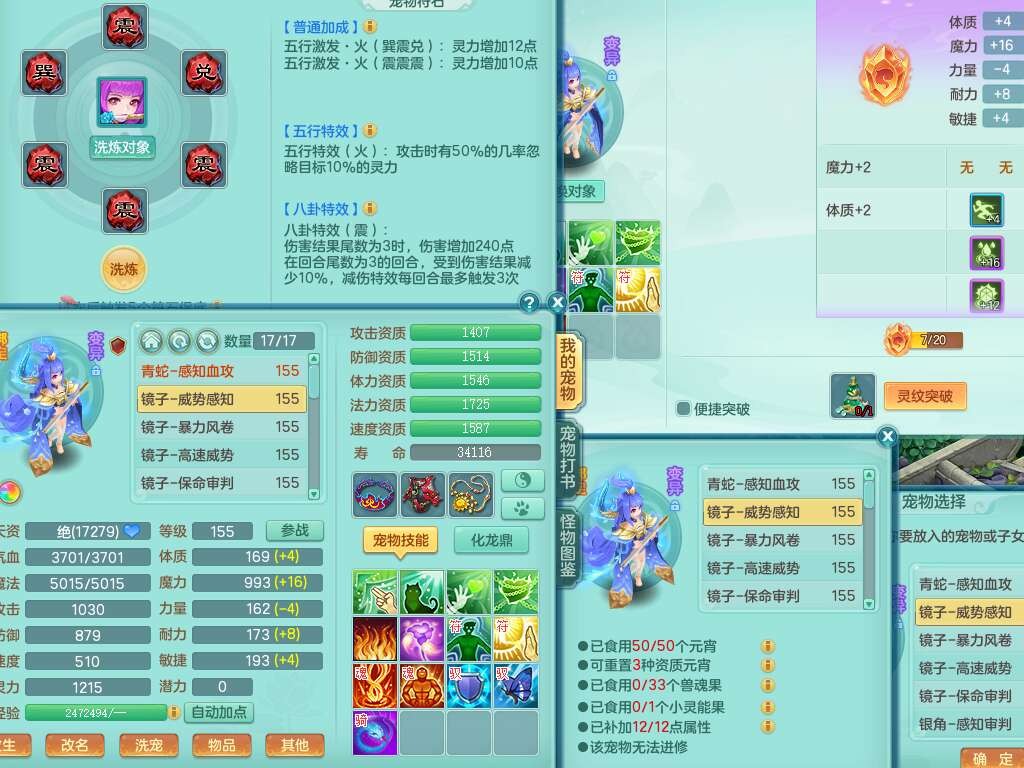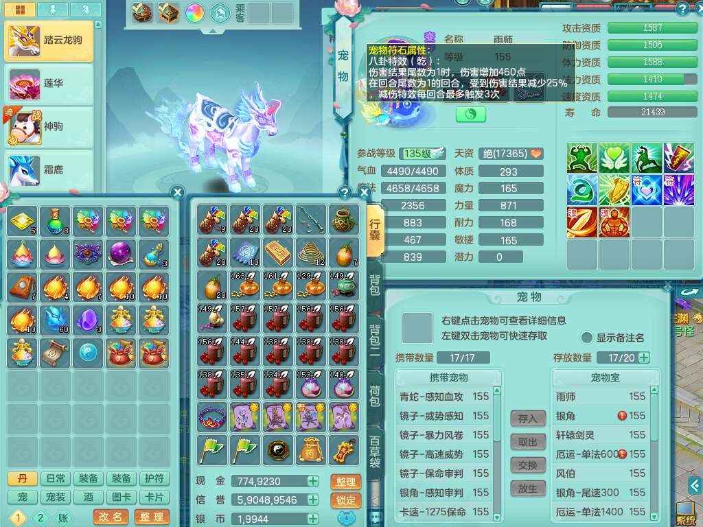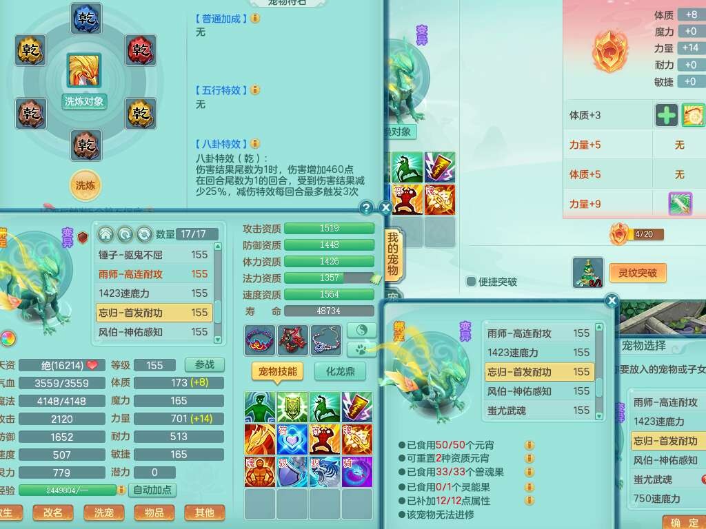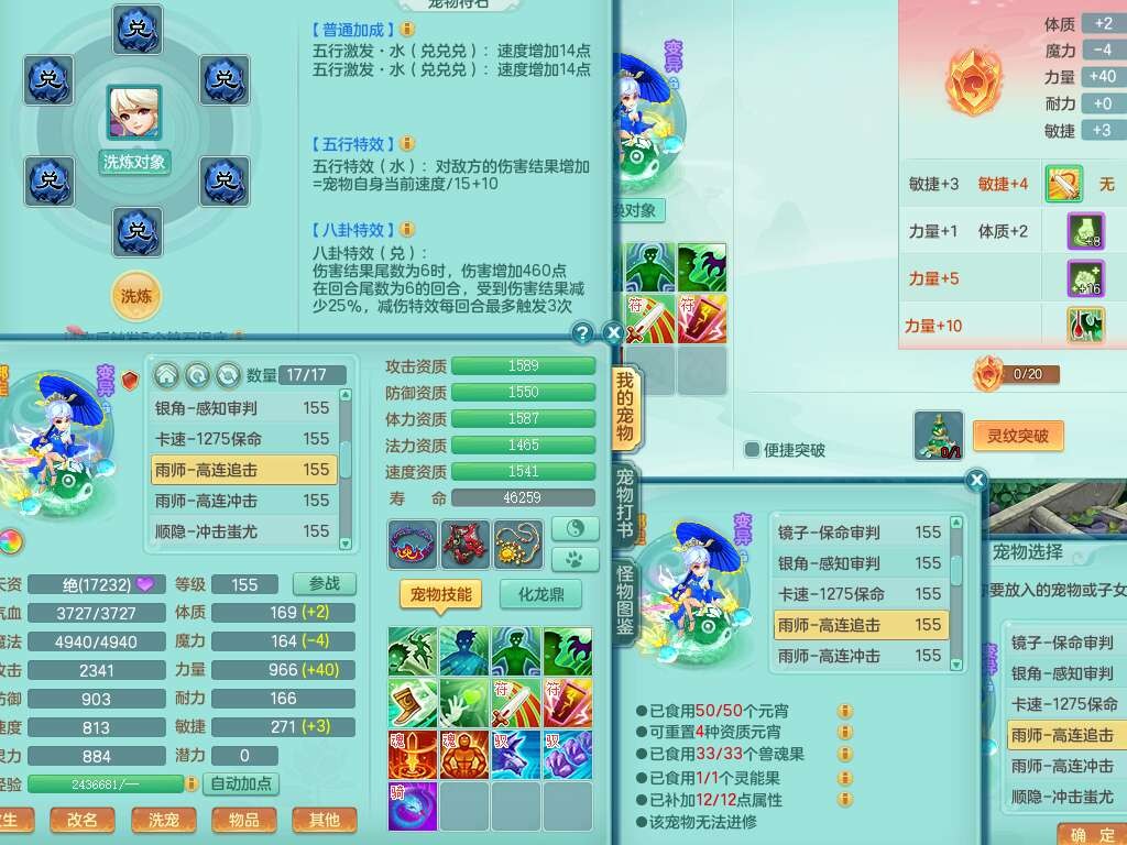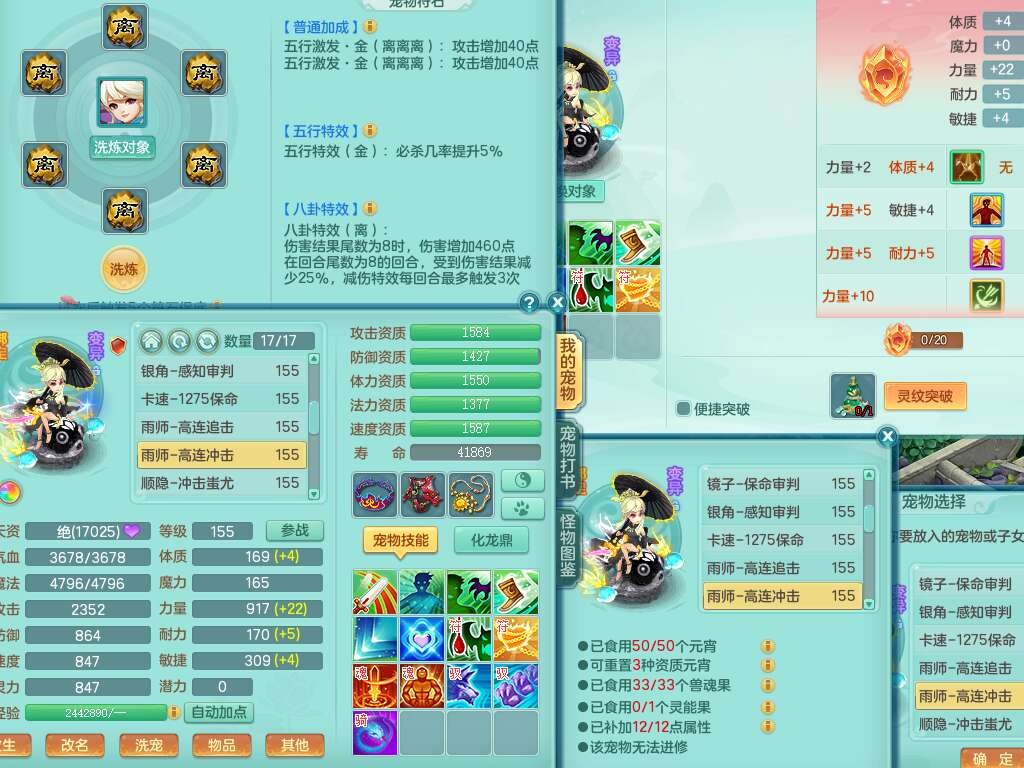 K22424醉生梦死159男万兽,精灵歌+舞,1龙没内,1内丹蛇,【7觉醒,已潜龙】,1特殊(风卷),4只六技能镜花灵,1只六技能龙姬,易成长破魔斩单加57头,911狂暴易成长单加武器,崩山单加55衣服,神佑群体守备单加52链子,易成长慈航单加56腰带,破甲鞋子,5.5基础鼎+70攻+280血,15个永久格子,7个纯六字,5个五字,14只满果子,仓库还有55个果子,52个神兽内丹碎片,宠排在榜,经验在榜,双人坐骑,神驹马上发财+火焰之力武器,带162天月卡。➕159男无量,1神兽,3觉醒,1特殊(剑气),3只六技能镜花灵,易成长野兽衣服,愤怒移魂大法腰带,六特。➕159女盘丝,2只六技能镜花灵,易成长明镜非台单加52头,易成长野兽单加55武器,愤怒迟滞腰带,六特。➕159男魔王,易成长五雷衣服,法缭鞋子。