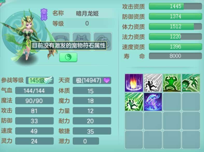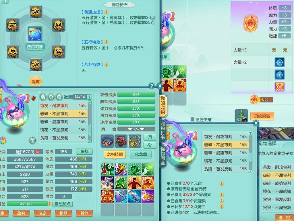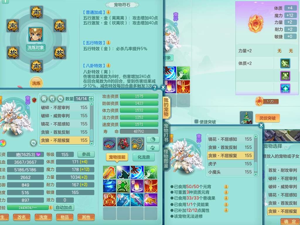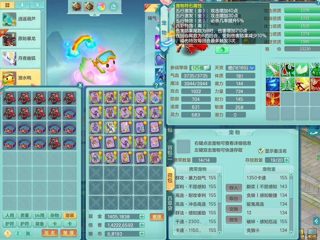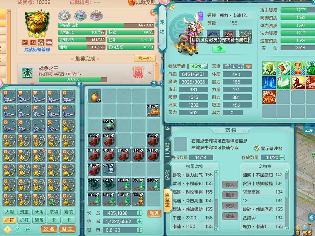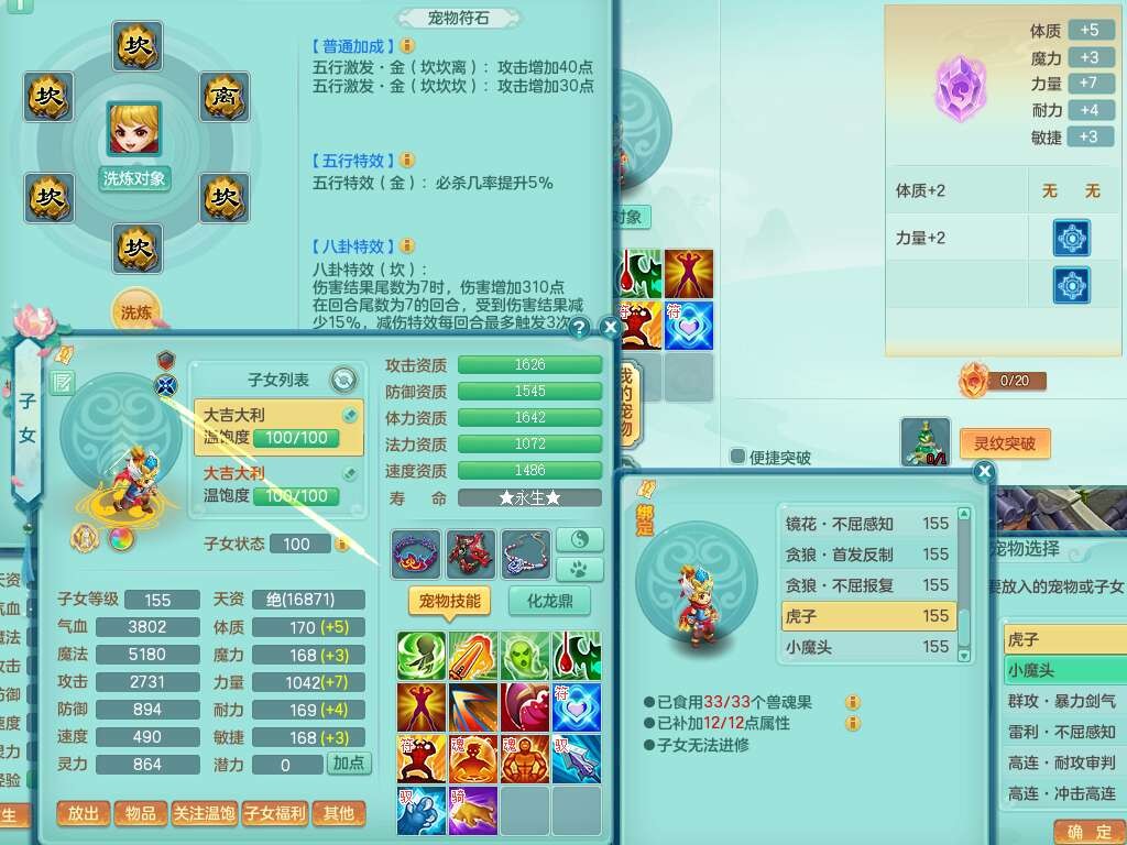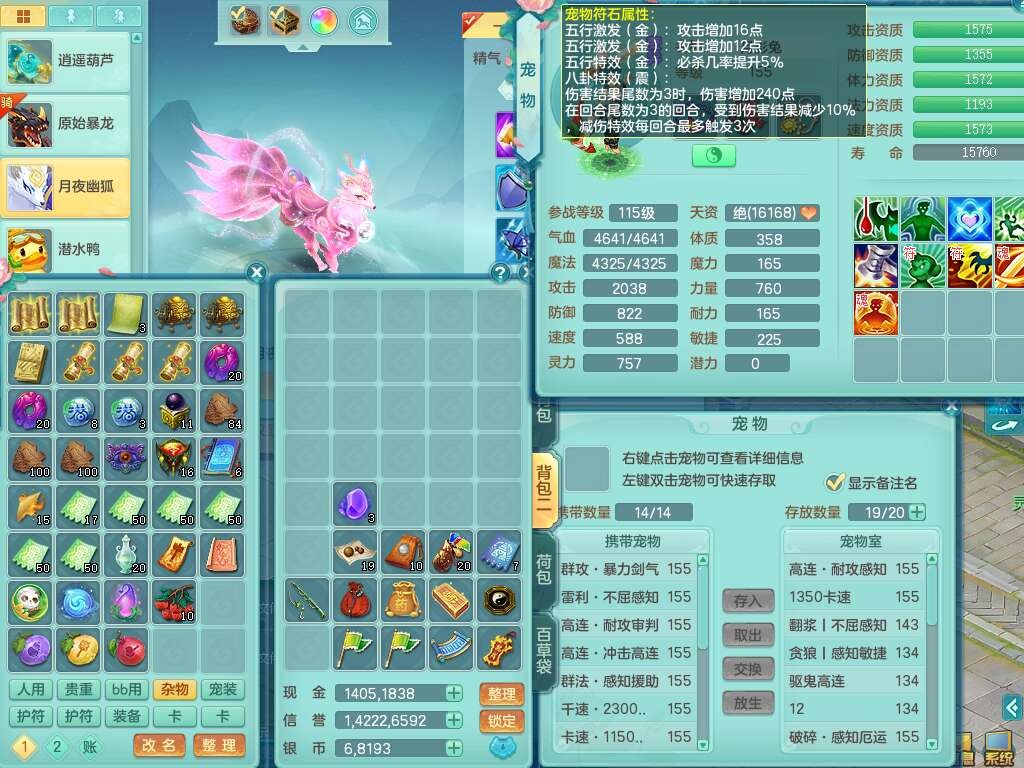 p22421,2020区159男万兽,精灵歌,8龙3内丹神,1破镜,4只觉醒(3只潜龙BB,宠装完全够数,符石差3个主要2个附加,化龙鼎差3个赤炎龙纹),4位靓号,3宠皮,2只六技能镜花灵,易成长崩山衣服,易成长必杀武器,易成长单加56鞋子,5.5基础鼎,7.4法爆,7个纯六字,1个五字,16只满果子,仓库还有141个果子,4个坐骑,暴龙泰坦+西瓜冰武器皮肤。带3个155+奶粉。