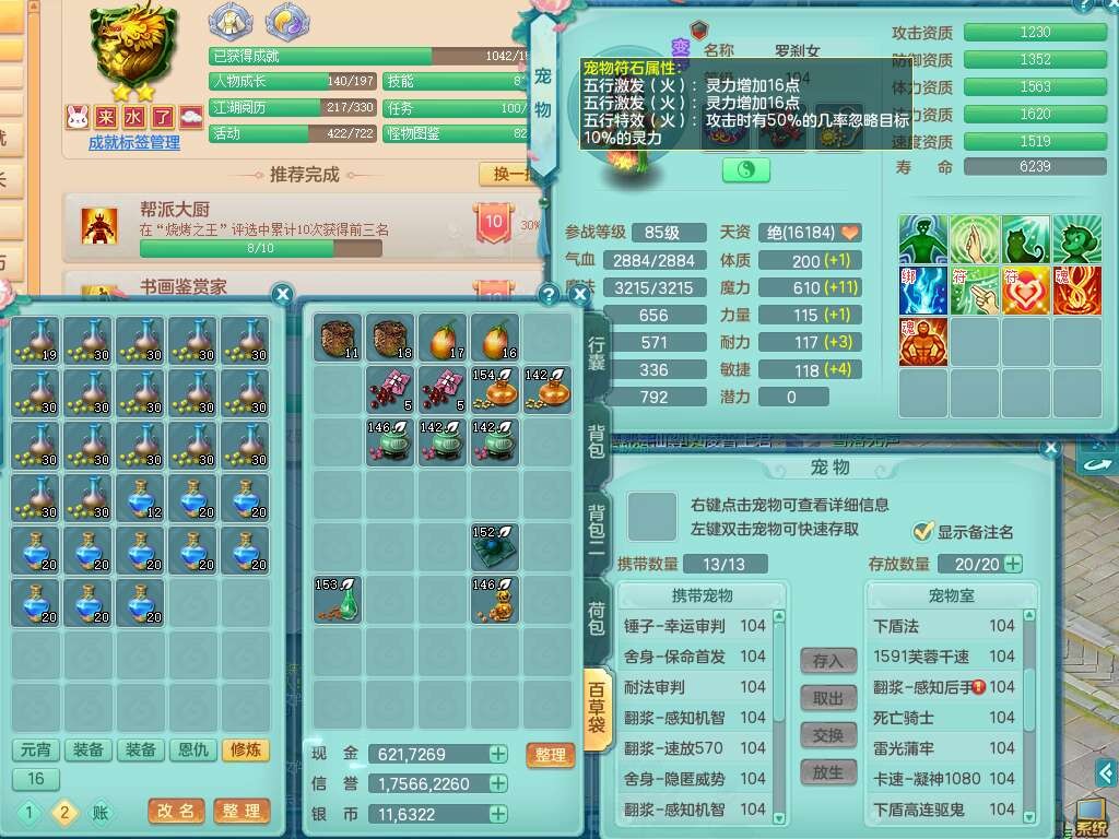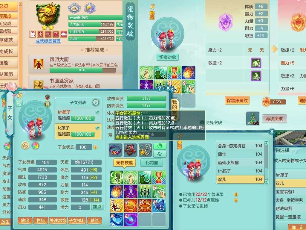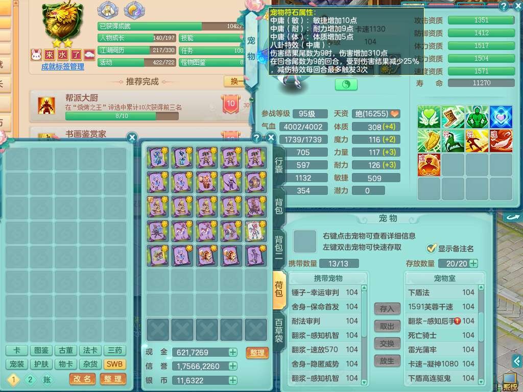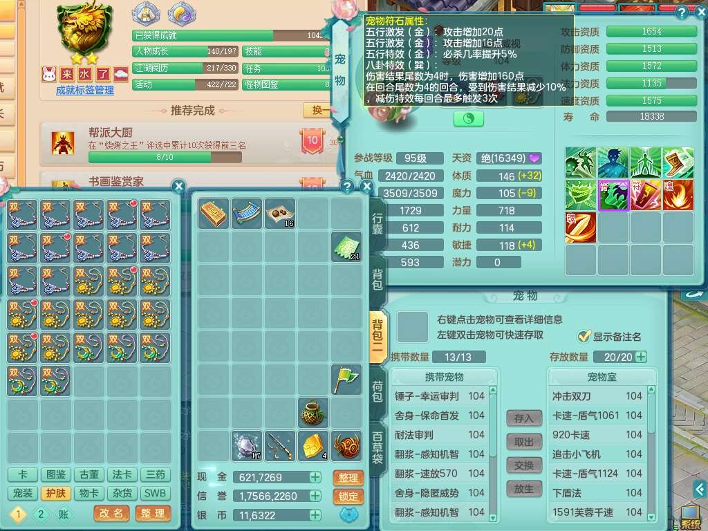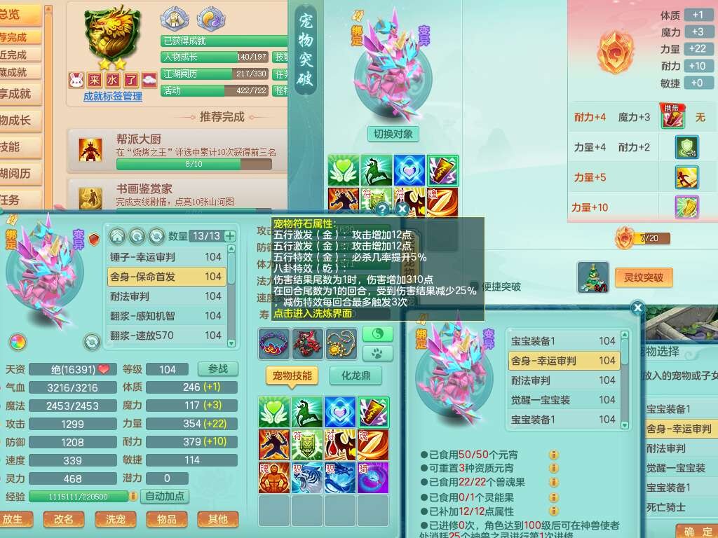 s22422,2023区99男方寸,1内胆神,9觉醒,2宠皮,易成长群体守备单加33武器,愤怒明镜非台腰带,易成长慈航单加32鞋子,五特,物理装备有,551易成长单加30武器,崩山单加衣服,神佑单加链子,法系装备有,法爆单加31武器,161易成长单加链子,匠心五雷衣服,2.5基础鼎+42攻,7个纯六字,1个五字,15只满果子,双人坐骑,有21个仙兽蛋,46个神兽内丹碎片,120天月卡。带1个99奶粉。