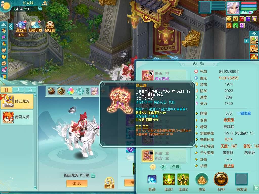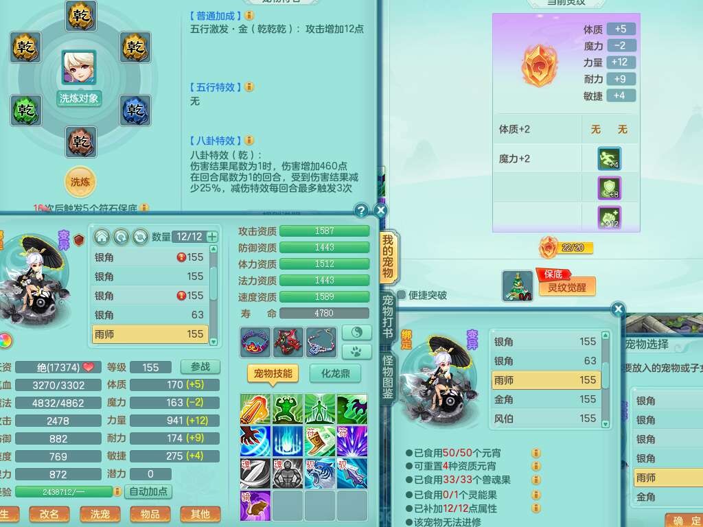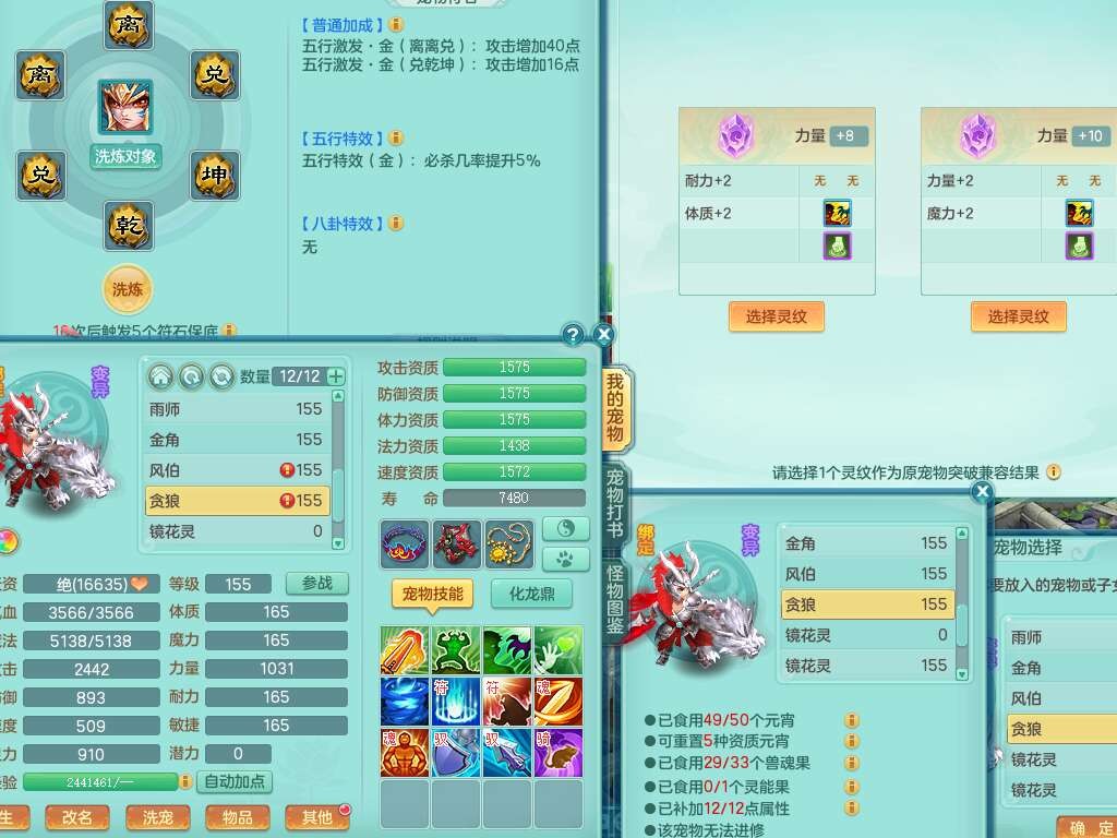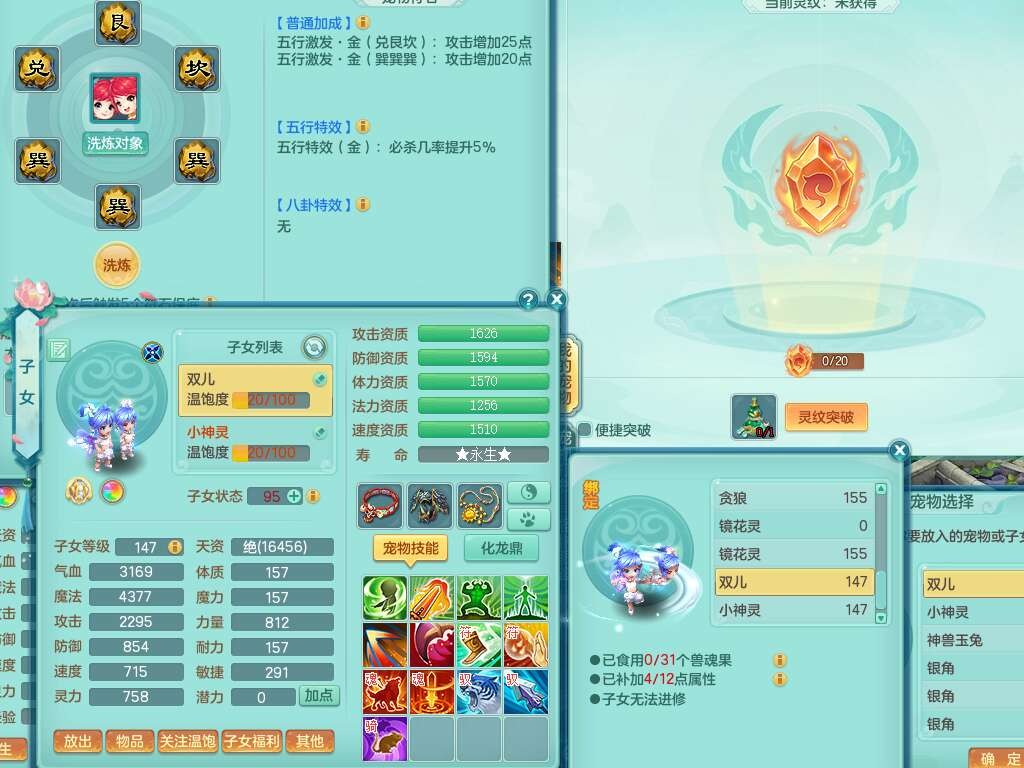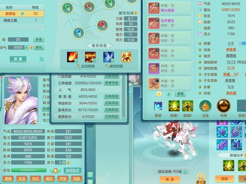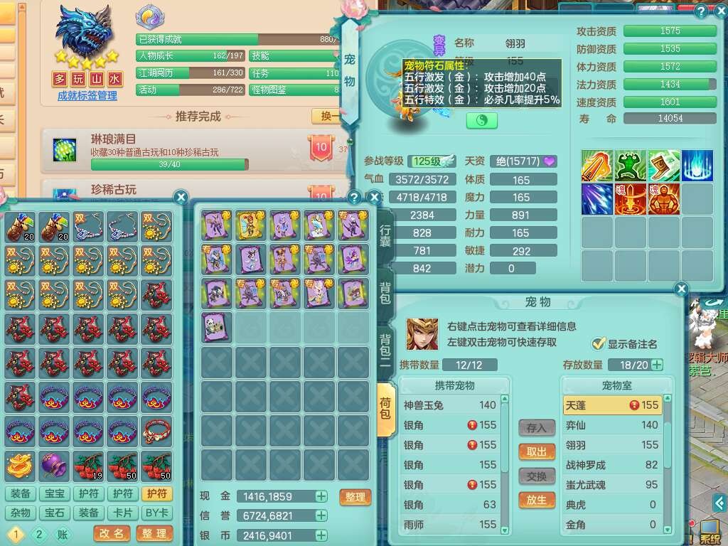 K22419超凡入圣159男魔王,1神兽,1只六技能镜花灵,法爆单加51武器,243易成长单加50链子,4.5基础鼎,4只满果子,仓库还有31个果子,双人坐骑,带3994金币,2416w神武币。