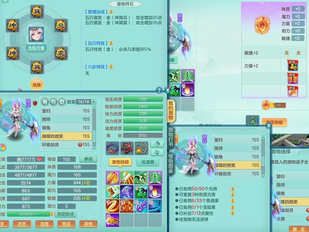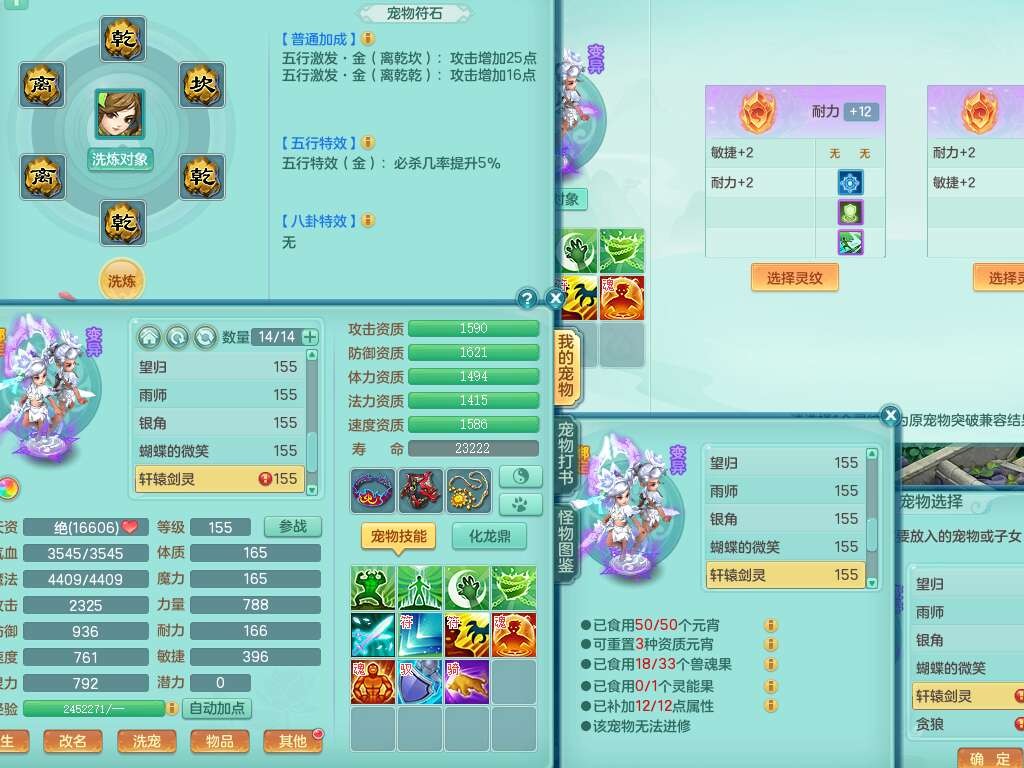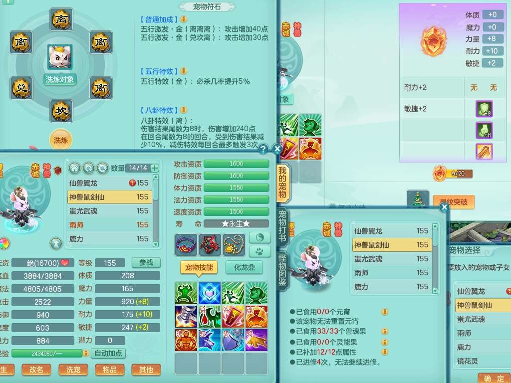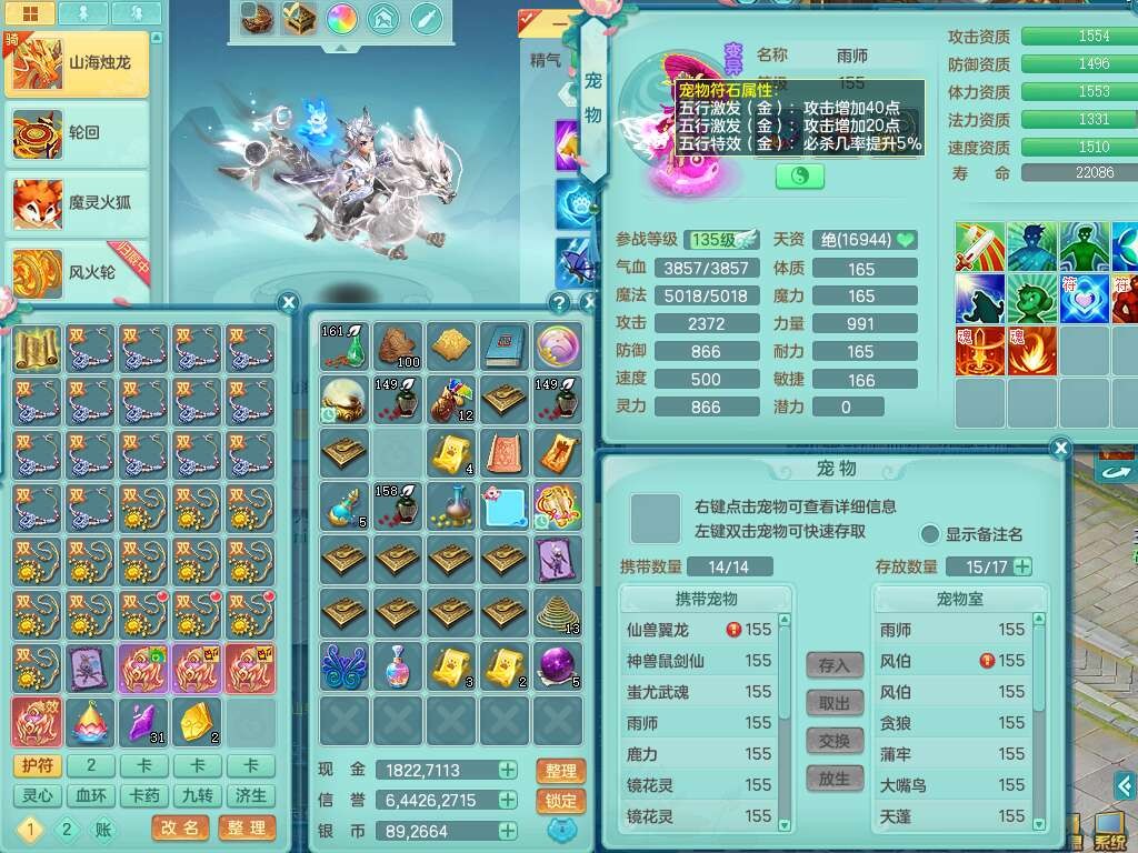 K22435任剑逍遥159男万兽,精灵歌,1龙没内,1内胆神,1只觉醒,2只六技能镜花灵,1只六技能龙姬,923狂暴单加55武器,崩山单加51衣服,愤怒单加56腰带,4.5基础鼎,综合6只满果子,仓库31神兽内胆碎片,山海烛龙坐骑。