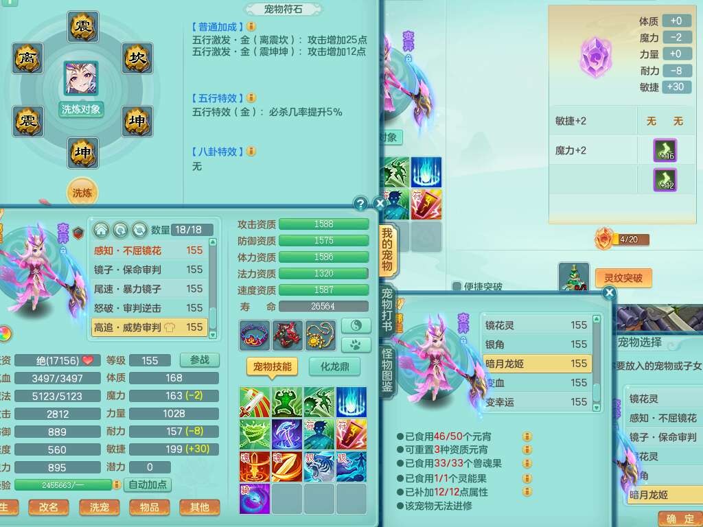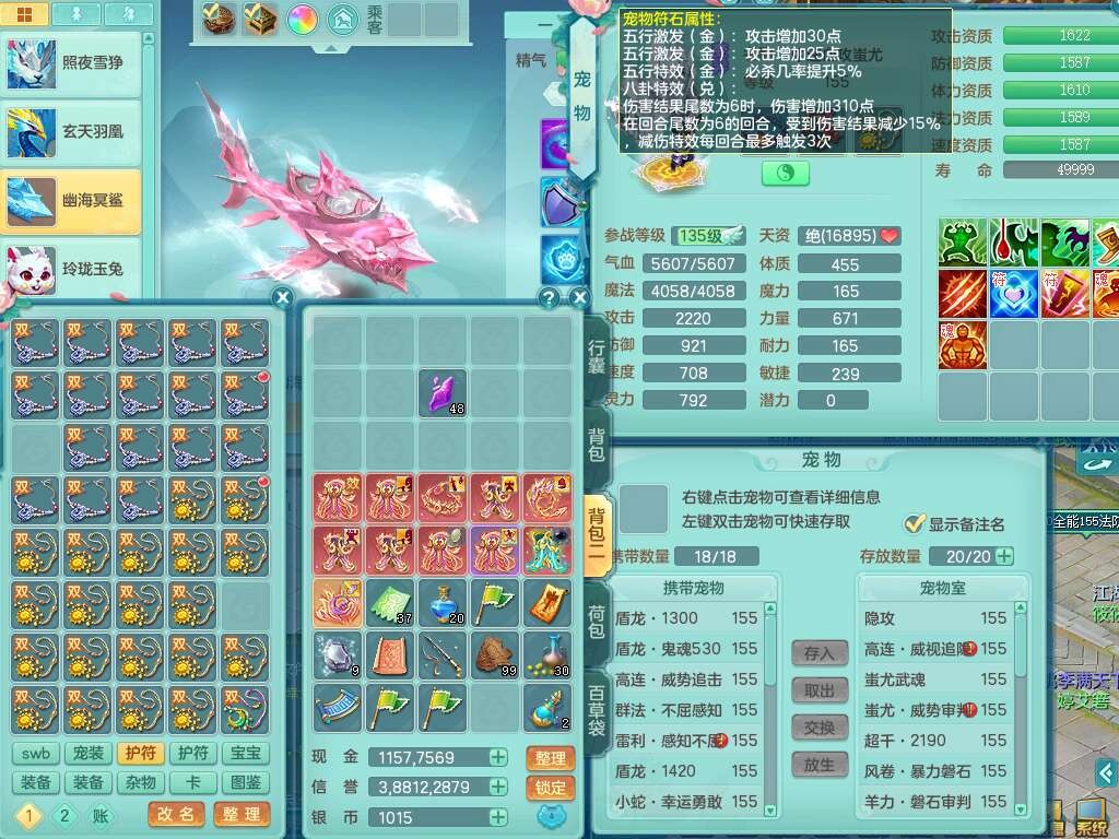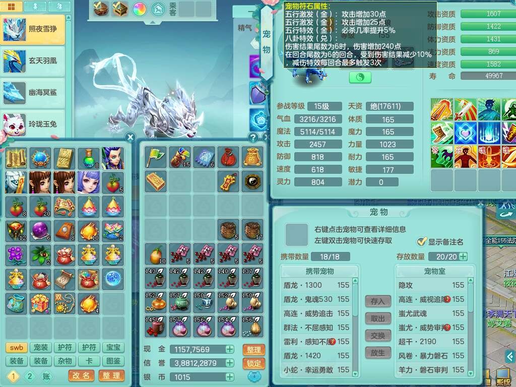 J22436今年勇159女普陀,精灵舞,6内胆龙,准4内胆神(1蛇2马,1神兽龙马+48神兽内胆碎片),3破镜,【9只觉醒,3系潜龙】,1宠皮,2特殊(怒破,灵傀),4只六技能镜花灵,2只六技能龙姬,3只多技能炼妖,愤怒四海腰带,六特,有回春群体守备武器,格挡单加51衣服,物理双破甲,破甲头,破甲五雷单加55鞋子,919易成长野兽单加53武器,崩山衣服、神佑项链全单加,6.0基础鼎+70攻+280血,15个永久格子,10个纯六字,4个五字,25只满果子,仓库还有33个果子,经验修炼成就在榜,永久称谓,4个孩子,7只坐骑,神驹马上发财+火焰之力,带112天月卡。
