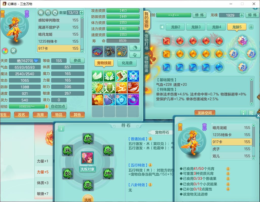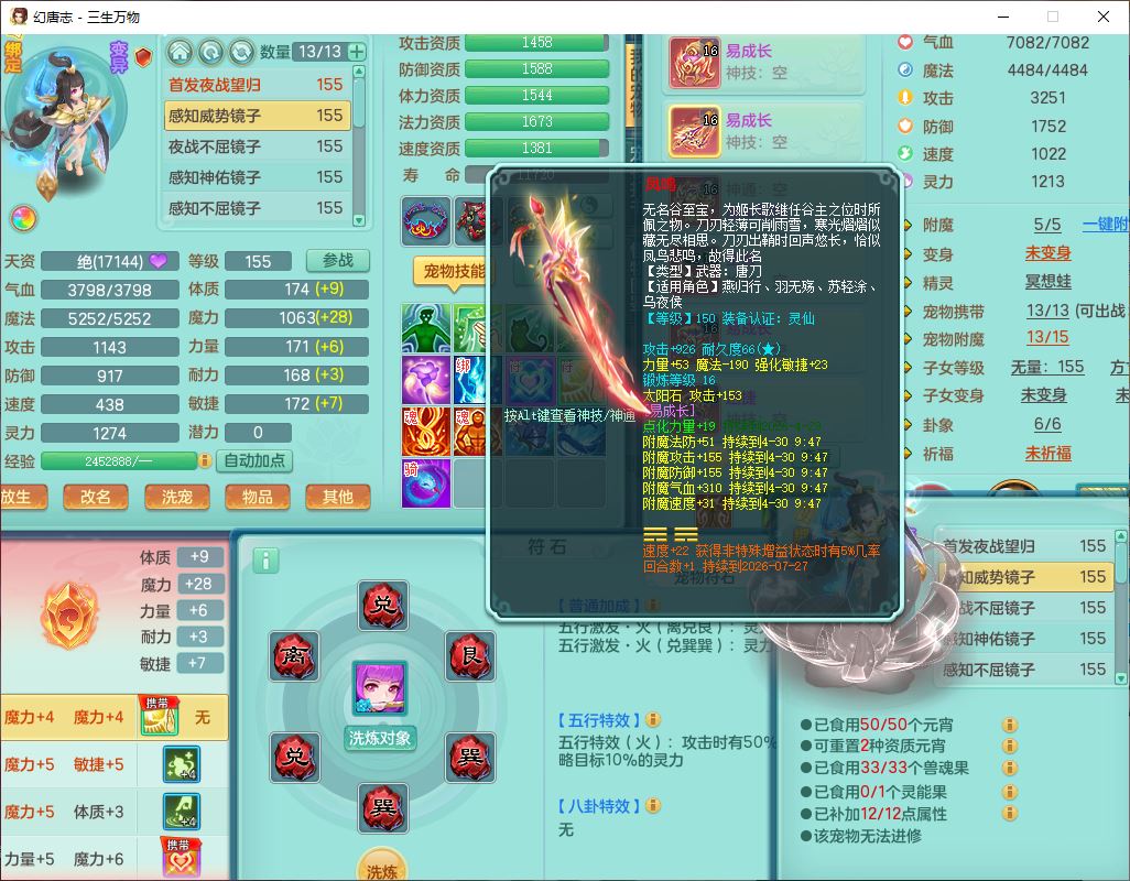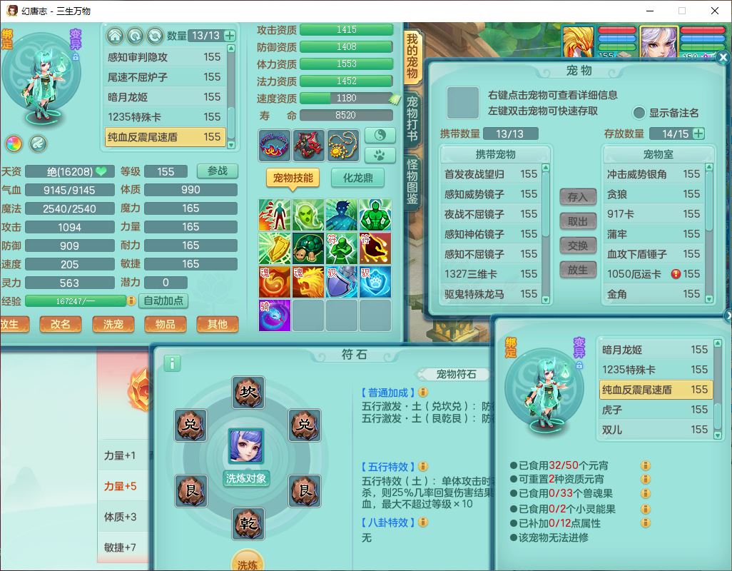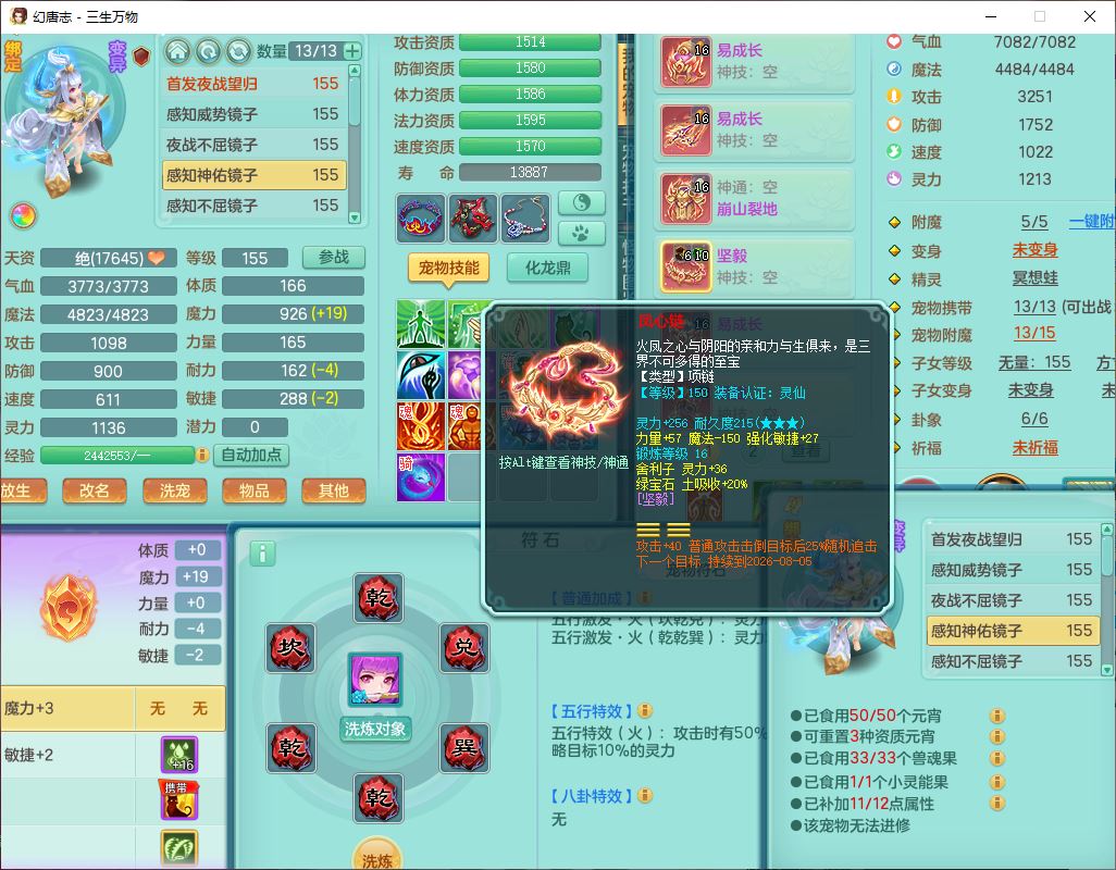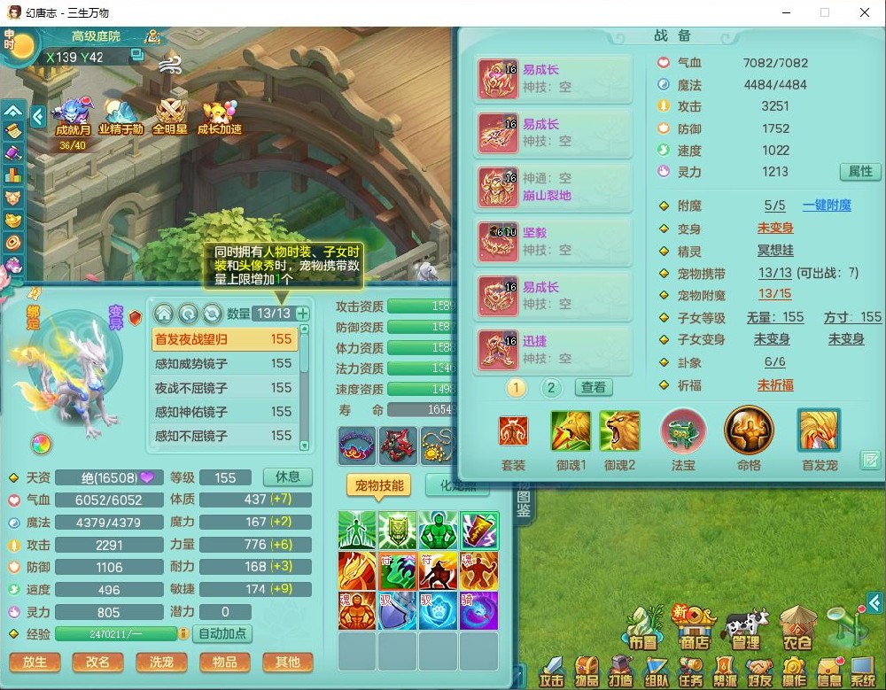 ss10494三生万物159男万兽【马到成功+火焰之力】精灵舞,1内(带祥云)1望归4镜花2龙姬1金炉,7觉醒3四字综合7只满果子,装备齐全,926单加Y武器,崩山衣服,坚毅项链,迅捷鞋子,一套双法缭法系装备,击退罗汉武器,法缭衣服,法缭蓄力鞋子,鼎4.5,庭院155,20个内丹碎片,1双人飞行坐骑