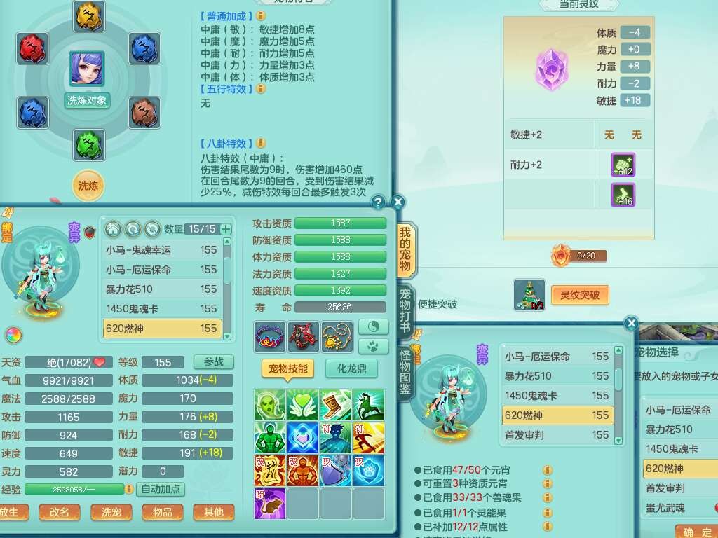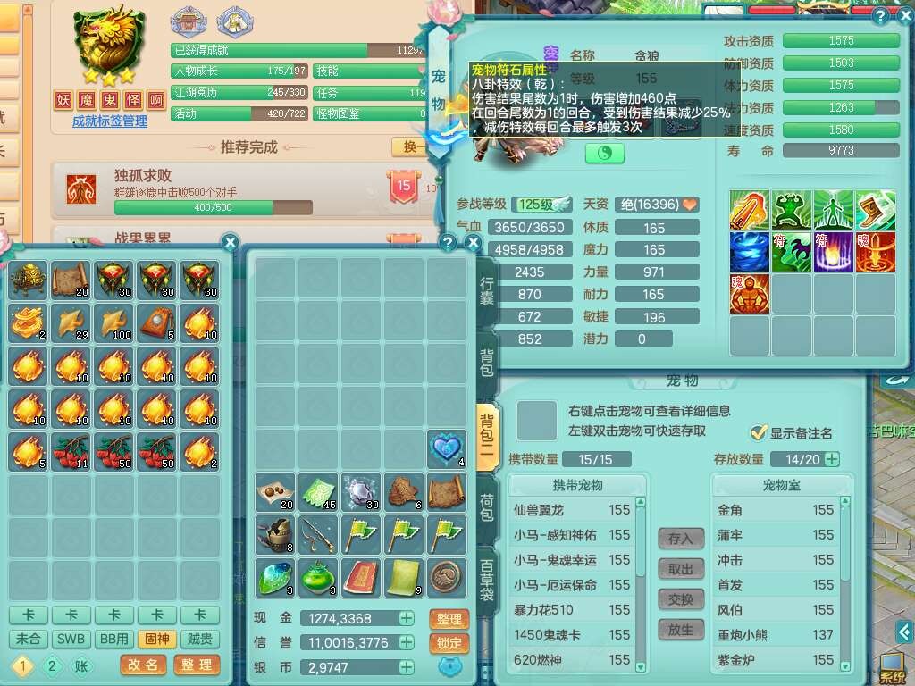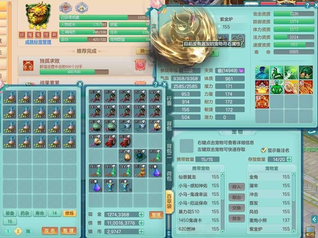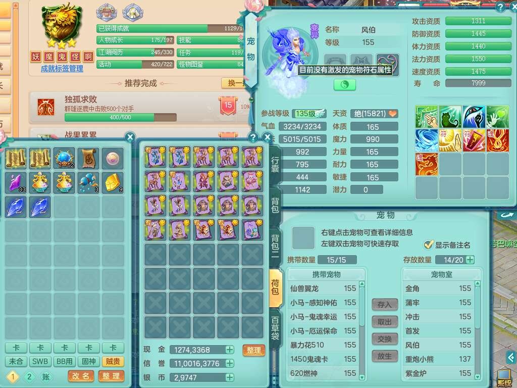 p22430浪淘沙159男普陀,精灵歌,1龙没内,1内胆神马,3破镜,2神兽马+33个神兽内丹碎片,6觉醒,1特殊(善恶),1只六技能镜花灵,愤怒玉清腰带,易成长魔音摄心单加鞋子,六特,12红,5.5基础鼎,4个纯六字,7只满果子,带160天月卡。