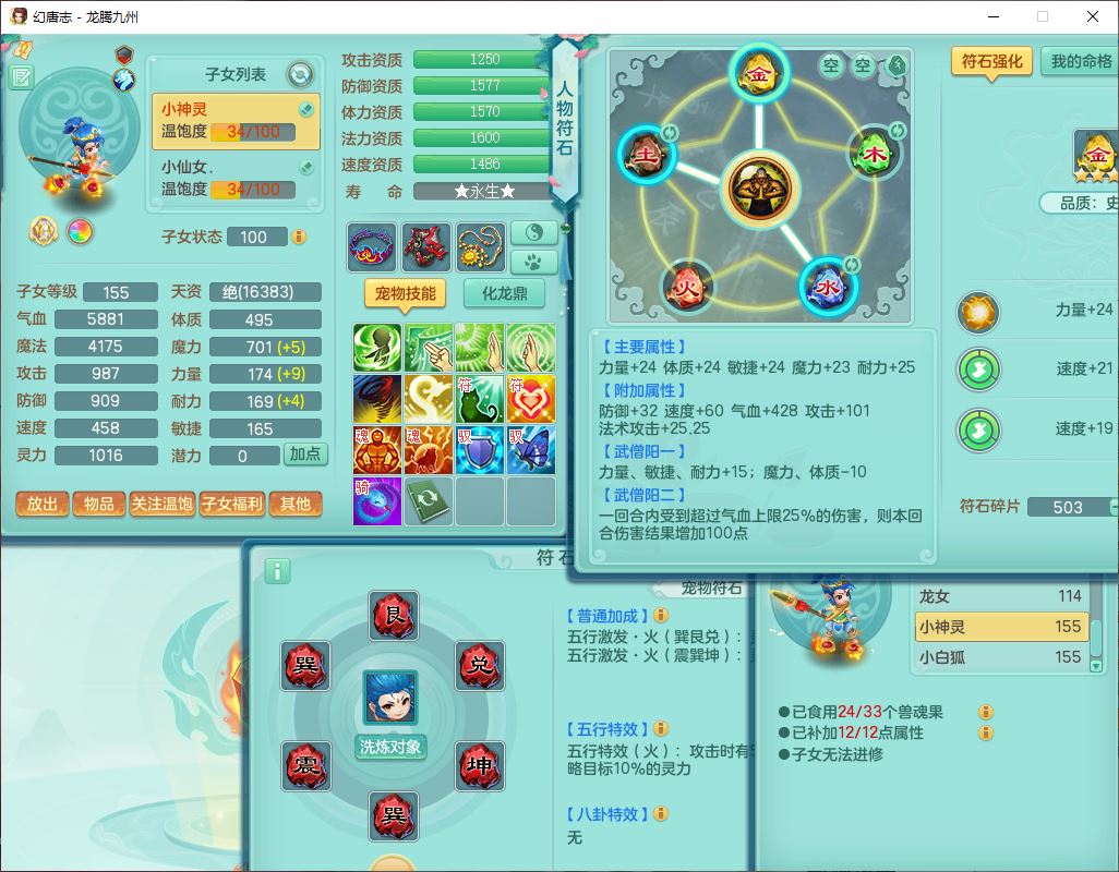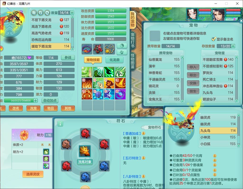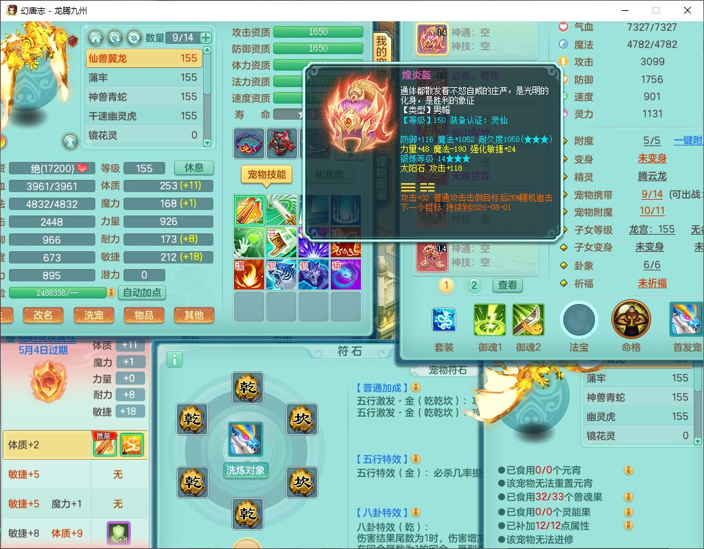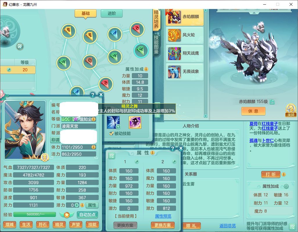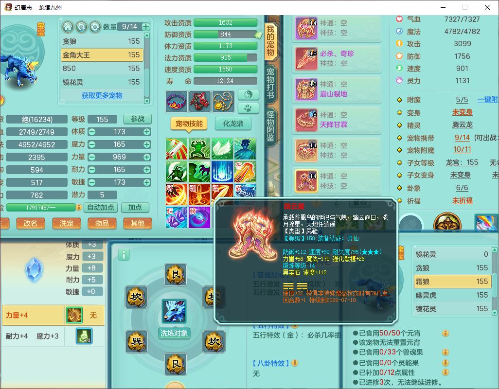71495WH龙腾九州150男天宫精灵舞,1龙1青蛇(无内)1镜花,装备齐全,必杀武器,崩山衣服,蛟龙五件套,2孩子(龙宫+无名),11个仙兽灵,29个内丹碎片,1双人坐骑