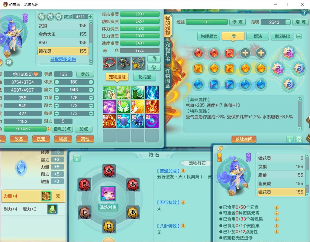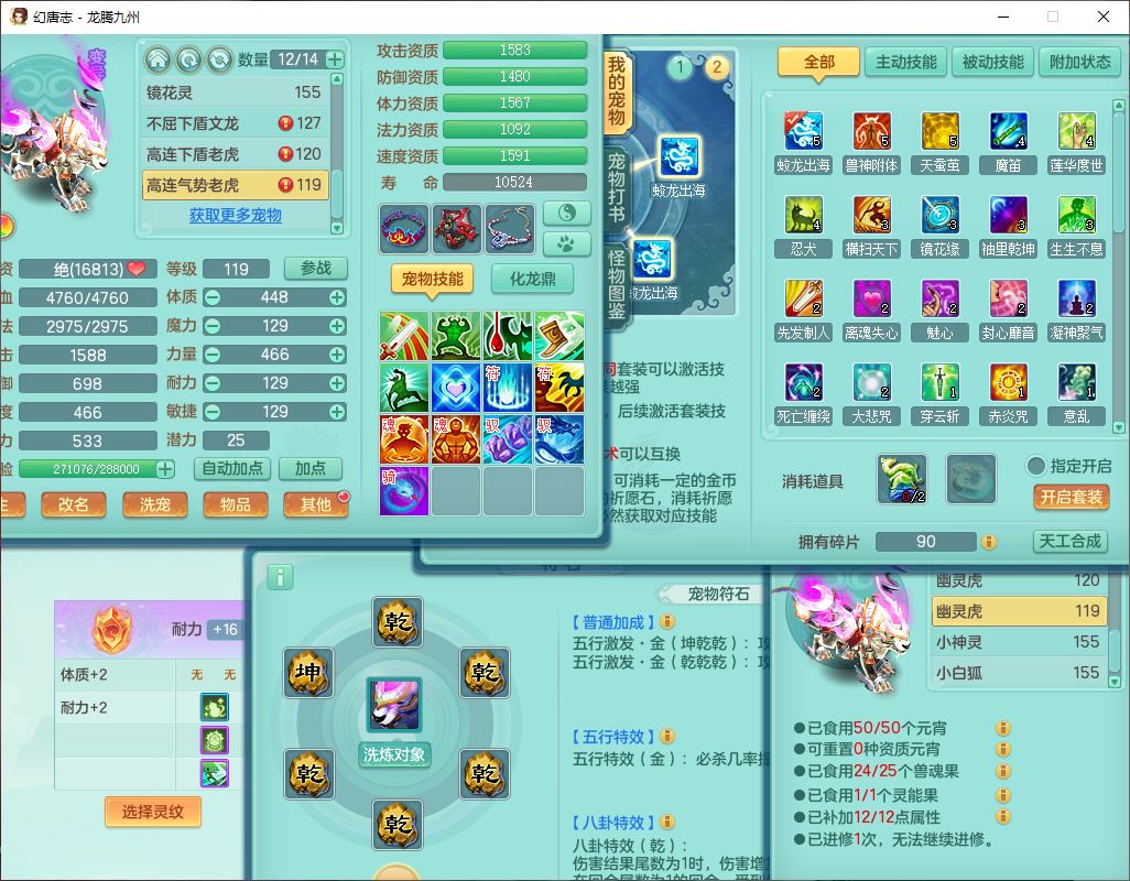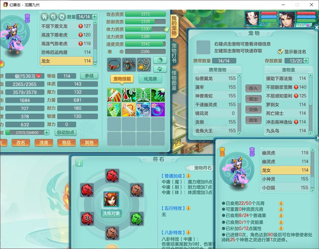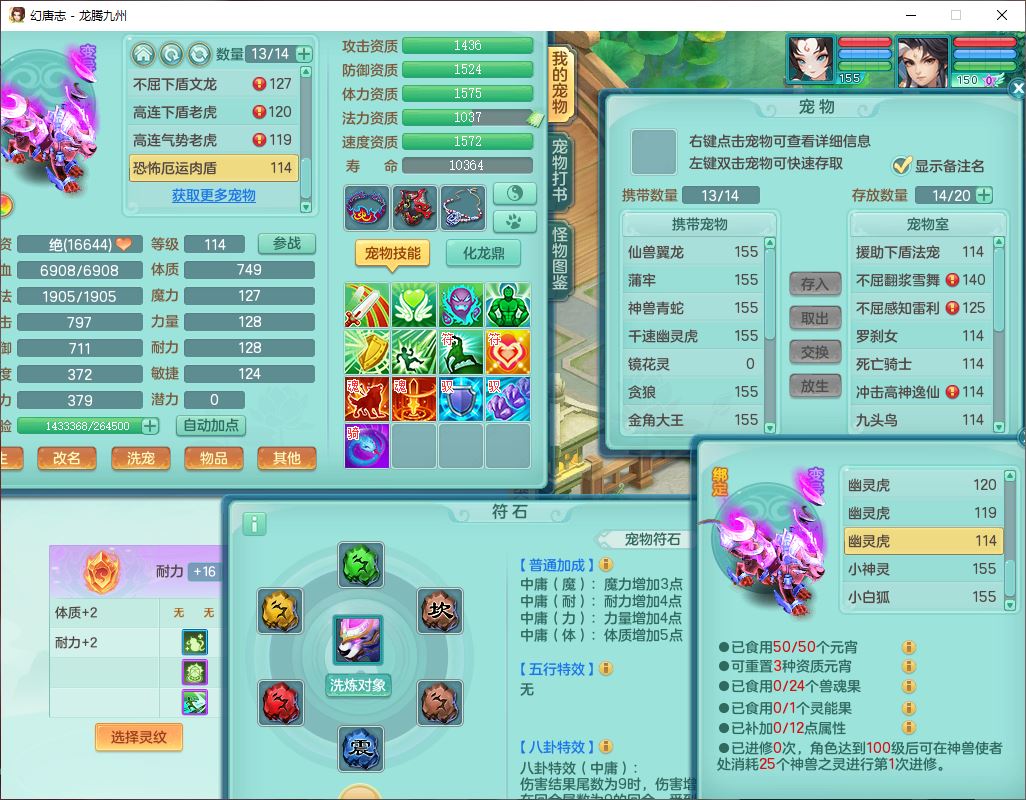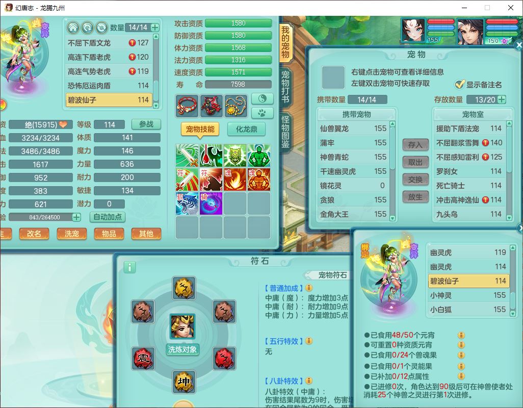 71495WH龙腾九州150男天宫精灵舞,1龙1青蛇(无内)1镜花,装备齐全,必杀武器,崩山衣服,蛟龙五件套,2孩子(龙宫+无名),11个仙兽灵,29个内丹碎片,1双人坐骑