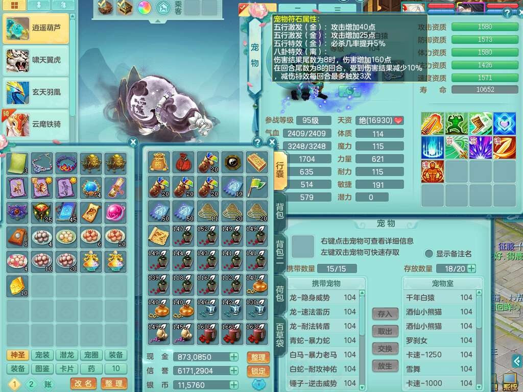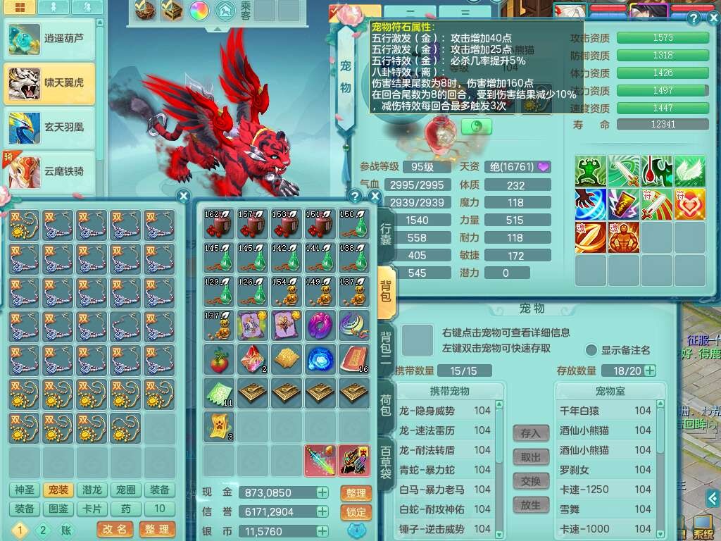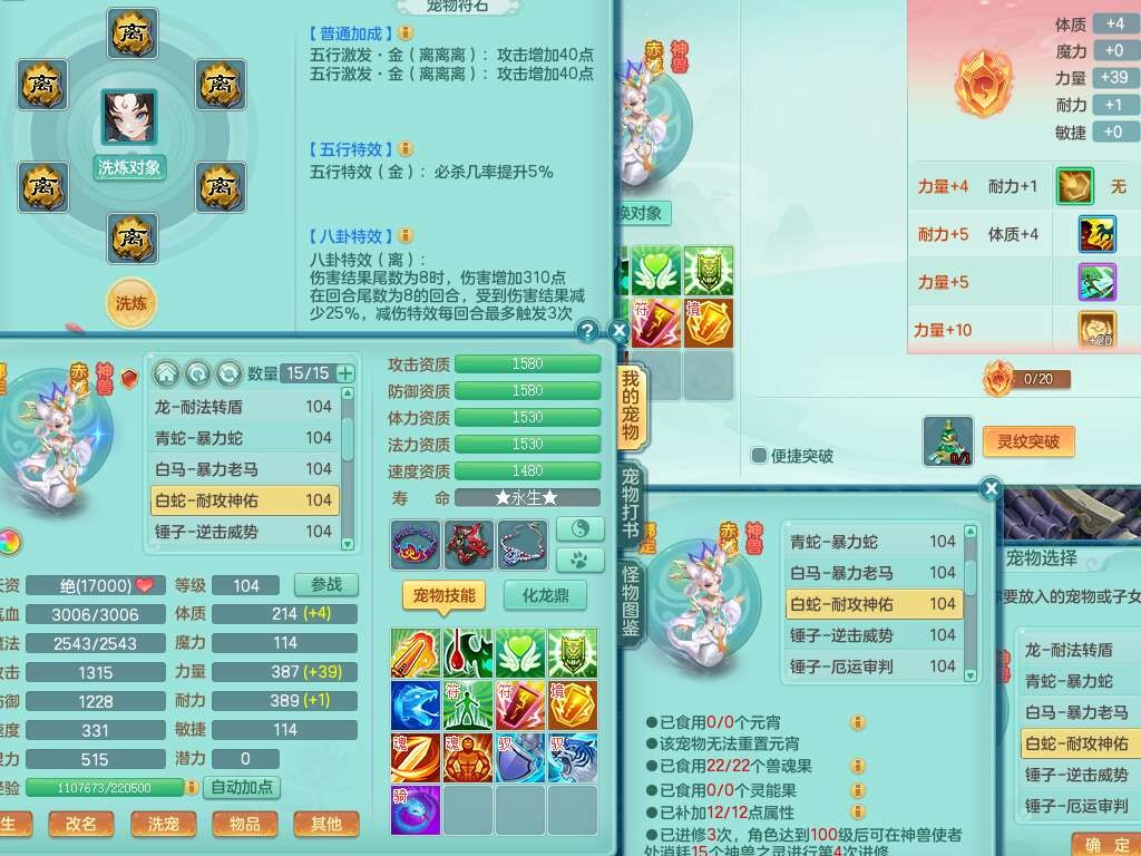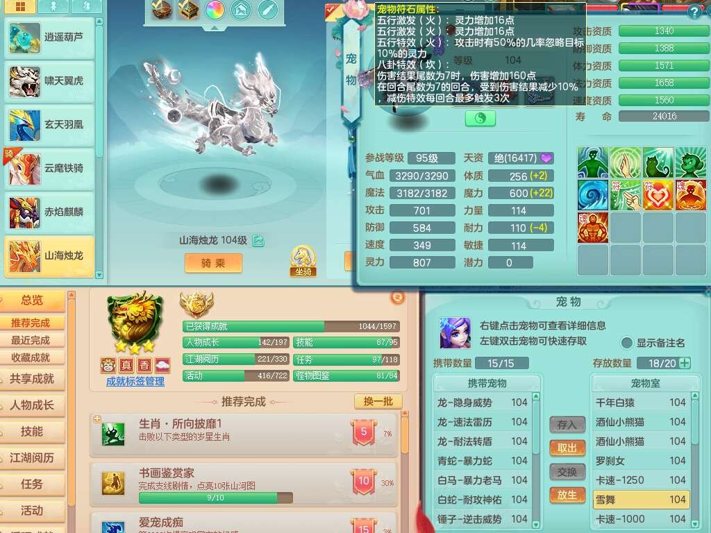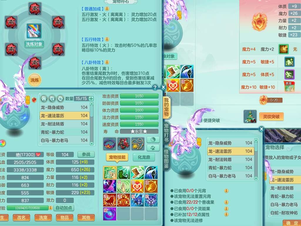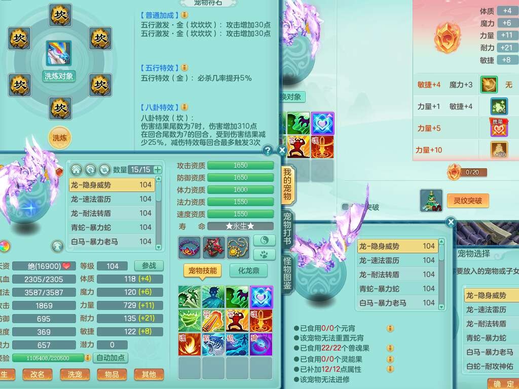S22457风华绝代99男无名谷,3龙5内胆神(2蛇1马),2破镜,【15觉醒,已潜龙】,8宠皮,易成长唤魂诀单加34头,易成长野兽单加35武器,崩山衣服,神佑单加链子,愤怒破血腰带,迅捷易成长单加34鞋子,有554必杀单加32武器,法系装备有152易成长单加33链子,五雷单加32头,法缭群体守护单加32衣服,仓库装备超多,3.0基础鼎+42攻+168血,11个纯六字,1个五字,23只满果子,宠排在榜,11只坐骑,129天月卡。带1个158奶粉