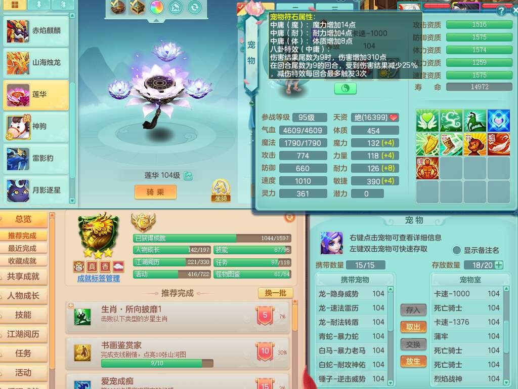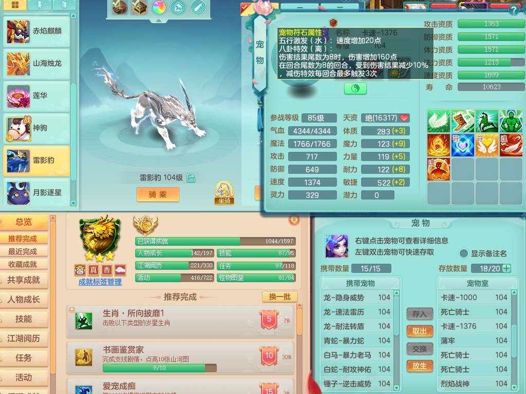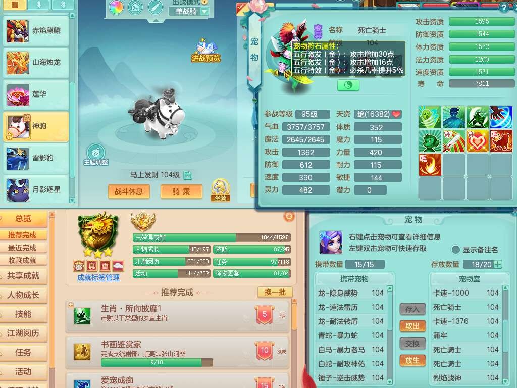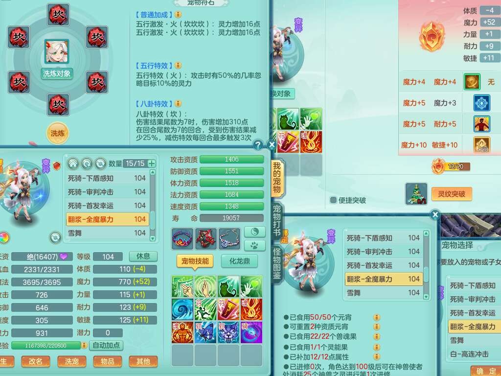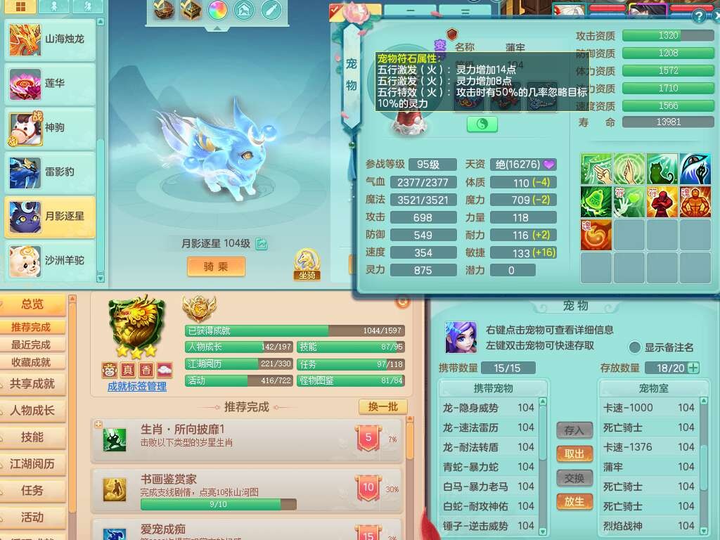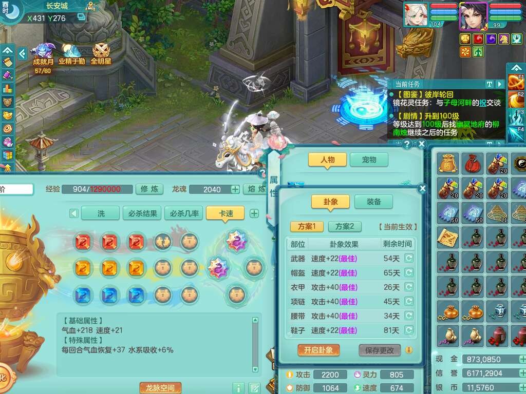 S22457风华绝代99男无名谷,3龙5内胆神(2蛇1马),2破镜,【15觉醒,已潜龙】,8宠皮,易成长唤魂诀单加34头,易成长野兽单加35武器,崩山衣服,神佑单加链子,愤怒破血腰带,迅捷易成长单加34鞋子,有554必杀单加32武器,法系装备有152易成长单加33链子,五雷单加32头,法缭群体守护单加32衣服,仓库装备超多,3.0基础鼎+42攻+168血,11个纯六字,1个五字,23只满果子,宠排在榜,11只坐骑,129天月卡。带1个158奶粉