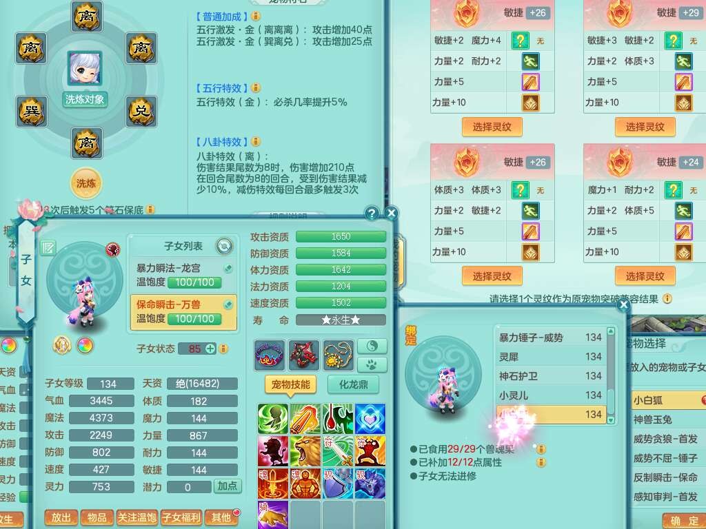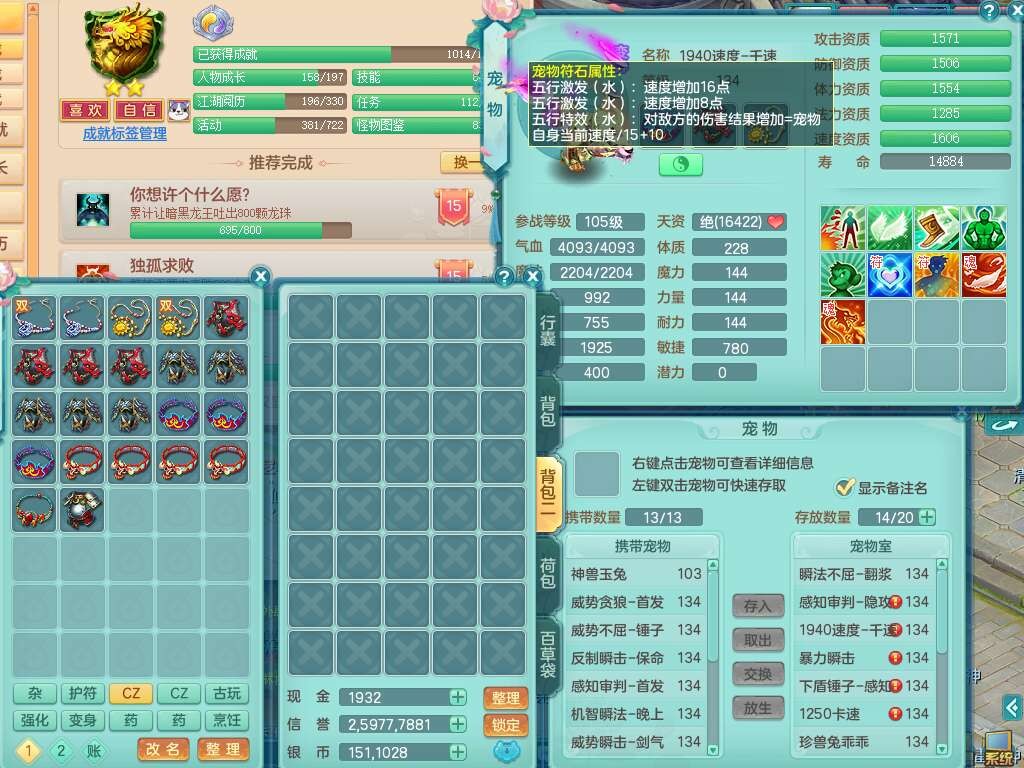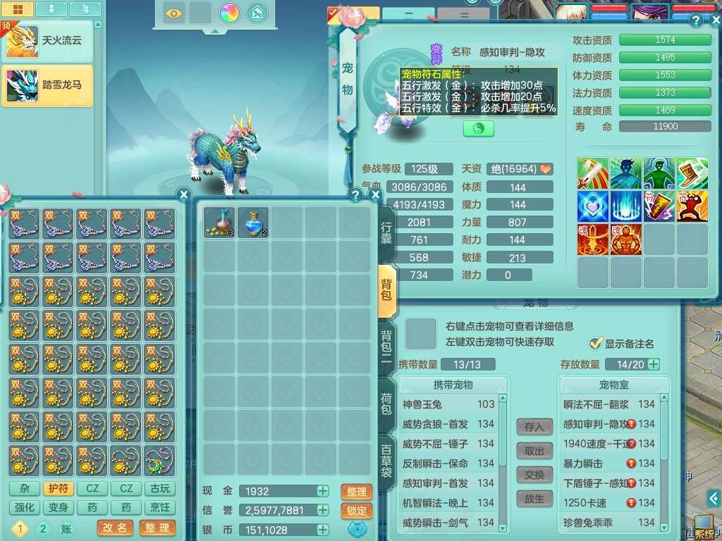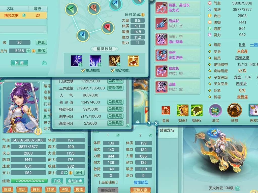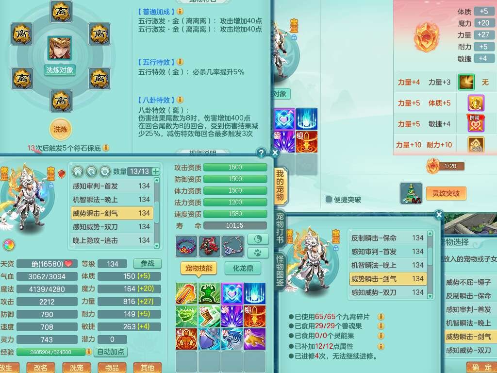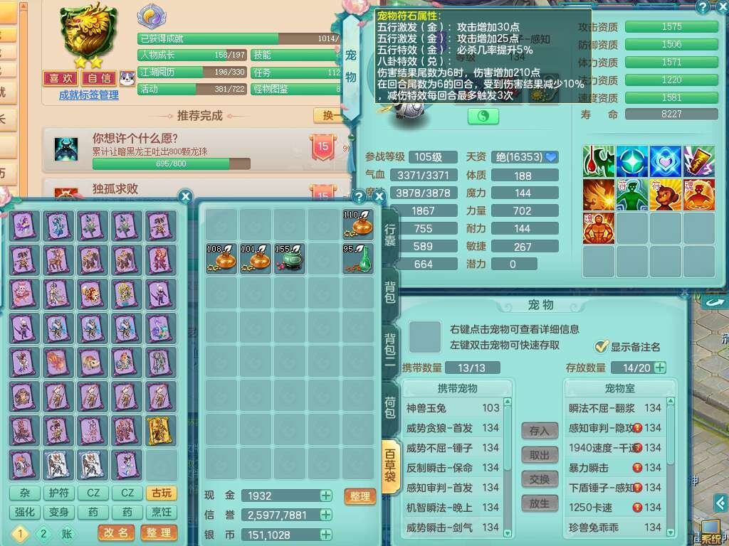 J22454天下无双129女万兽,精灵歌,1内胆神,8觉醒,1只九技能炼妖,三红精准易成长破力式单加42头,729易成长武器,崩山衣服,神佑破血单加链子,易成长单加43腰带,迅捷单加45鞋子,3.5基础鼎,4个纯六字,9只满果子,双人坐骑,带151w神武币。