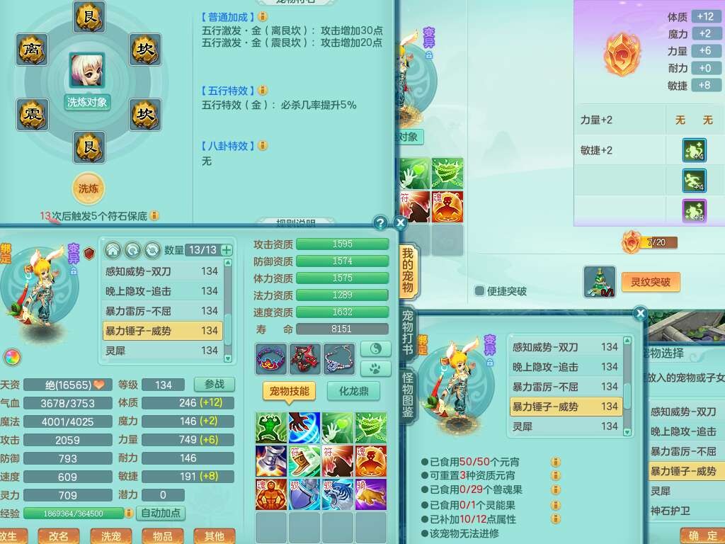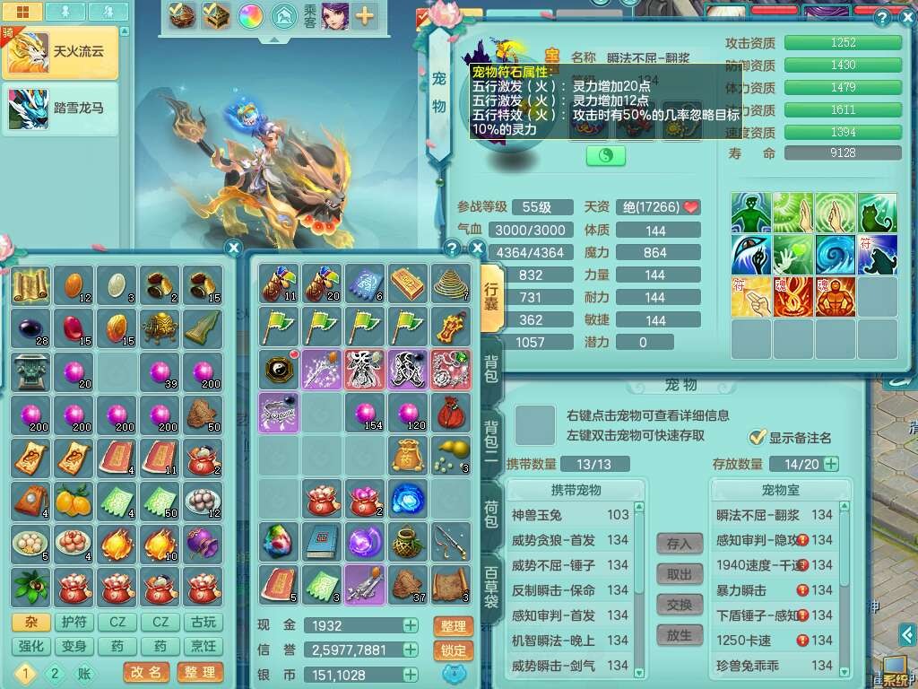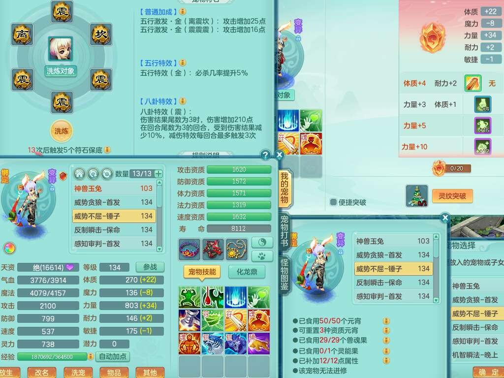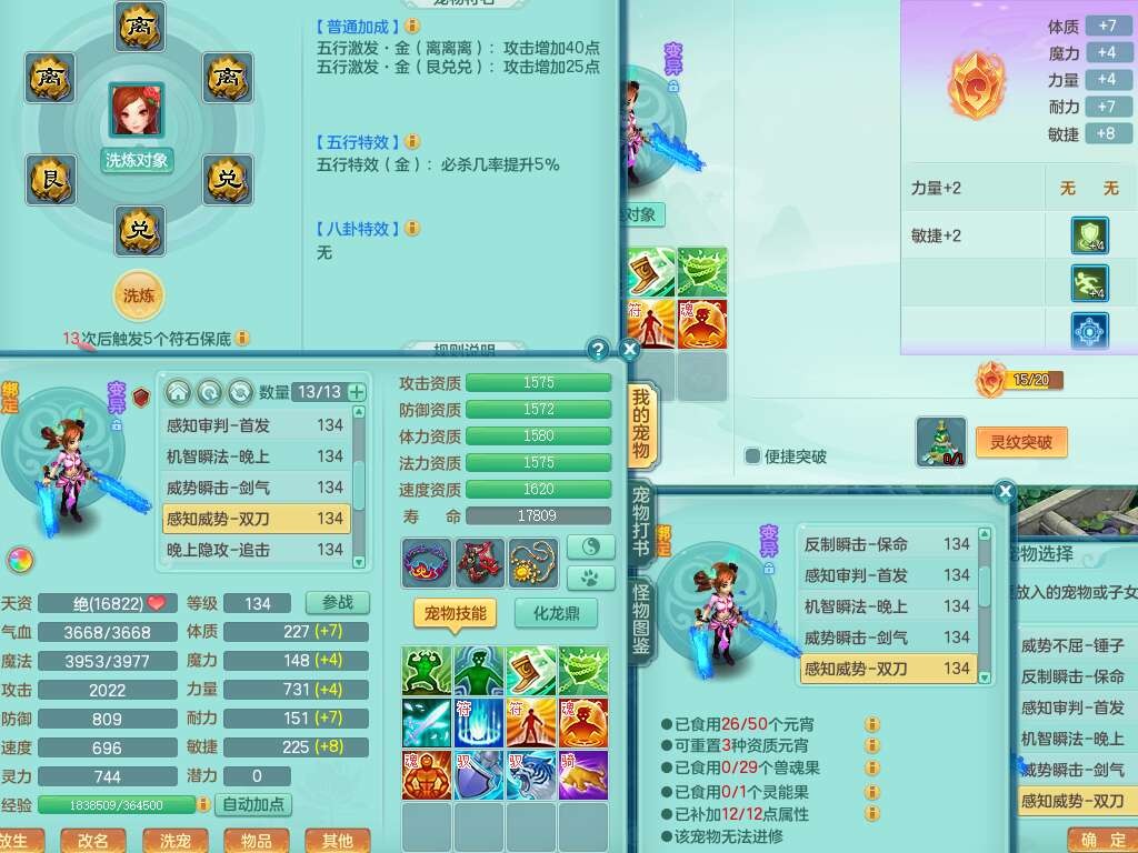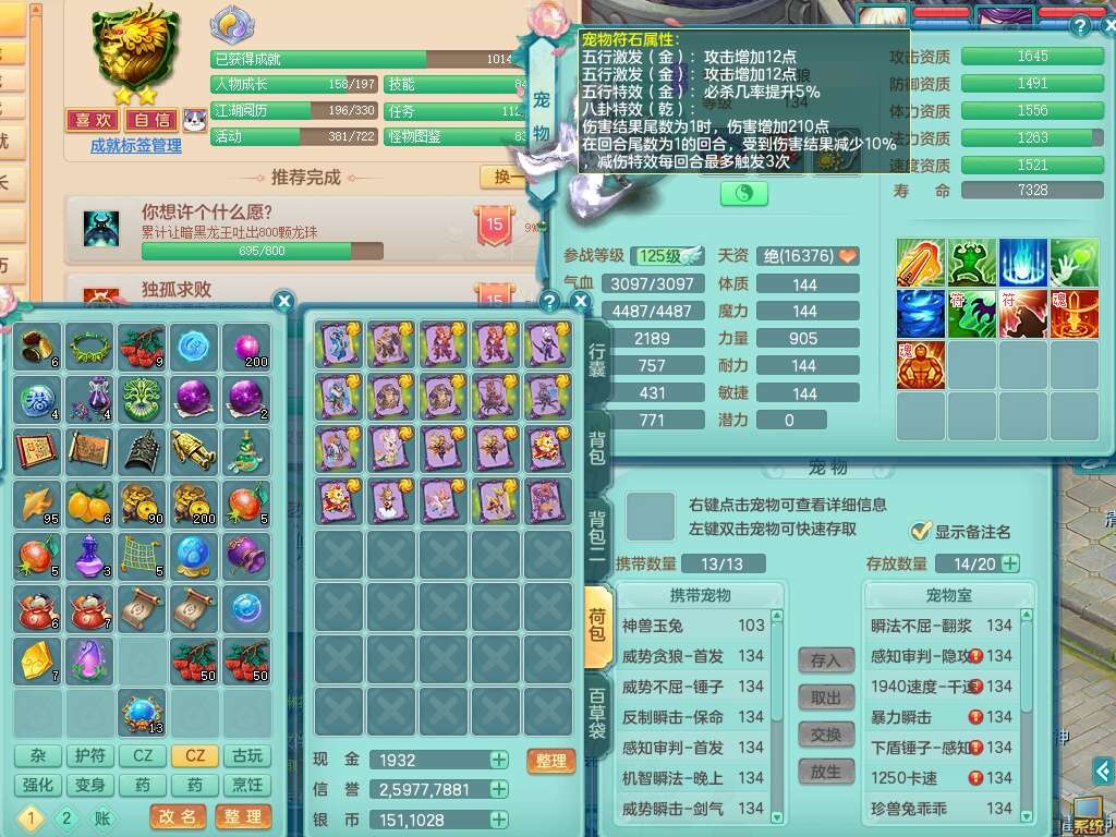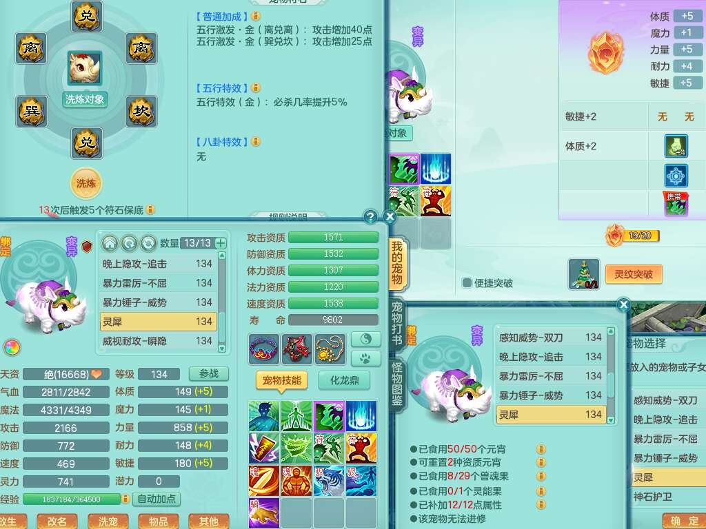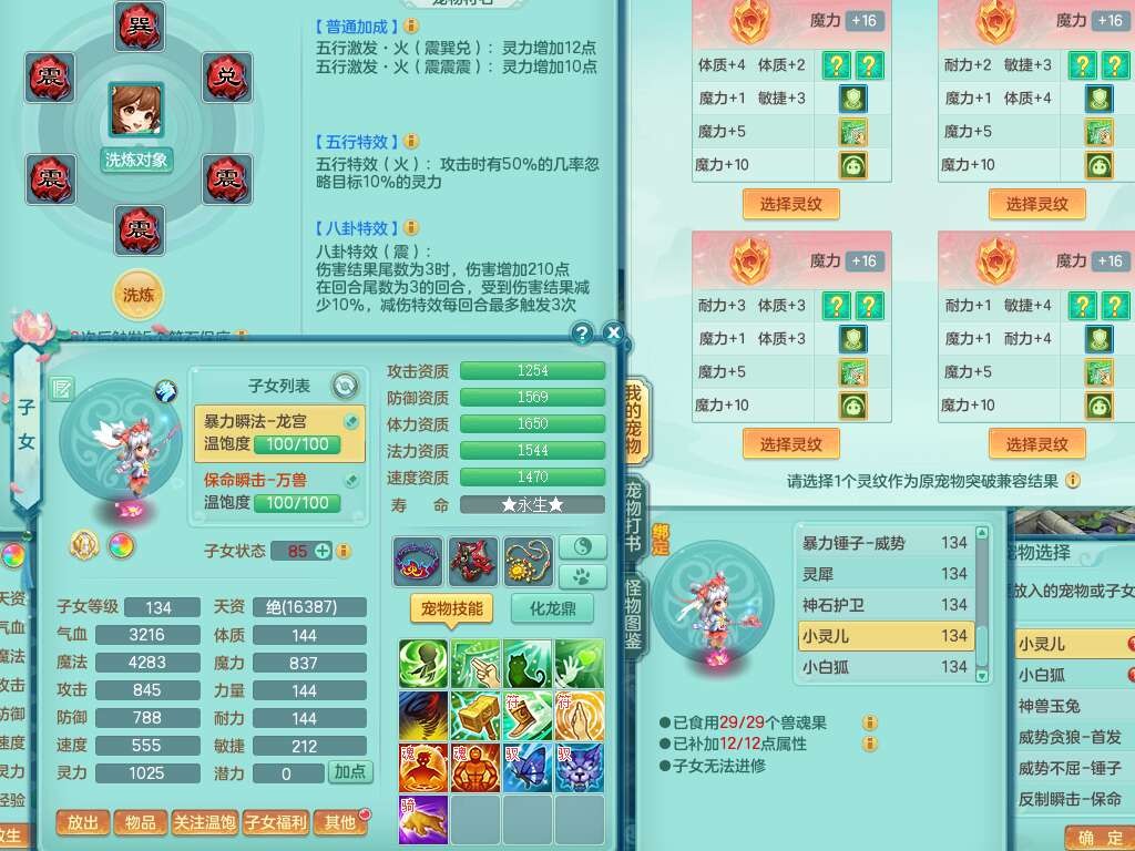 J22454天下无双129女万兽,精灵歌,1内胆神,8觉醒,1只九技能炼妖,三红精准易成长破力式单加42头,729易成长武器,崩山衣服,神佑破血单加链子,易成长单加43腰带,迅捷单加45鞋子,3.5基础鼎,4个纯六字,9只满果子,双人坐骑,带151w神武币。