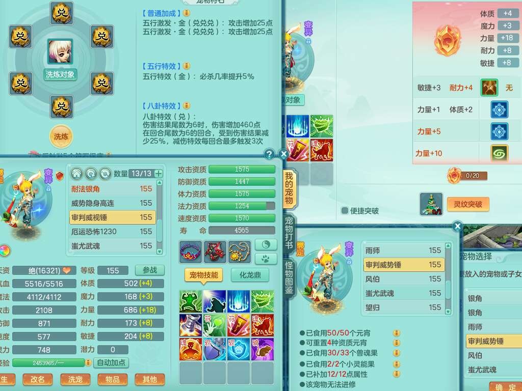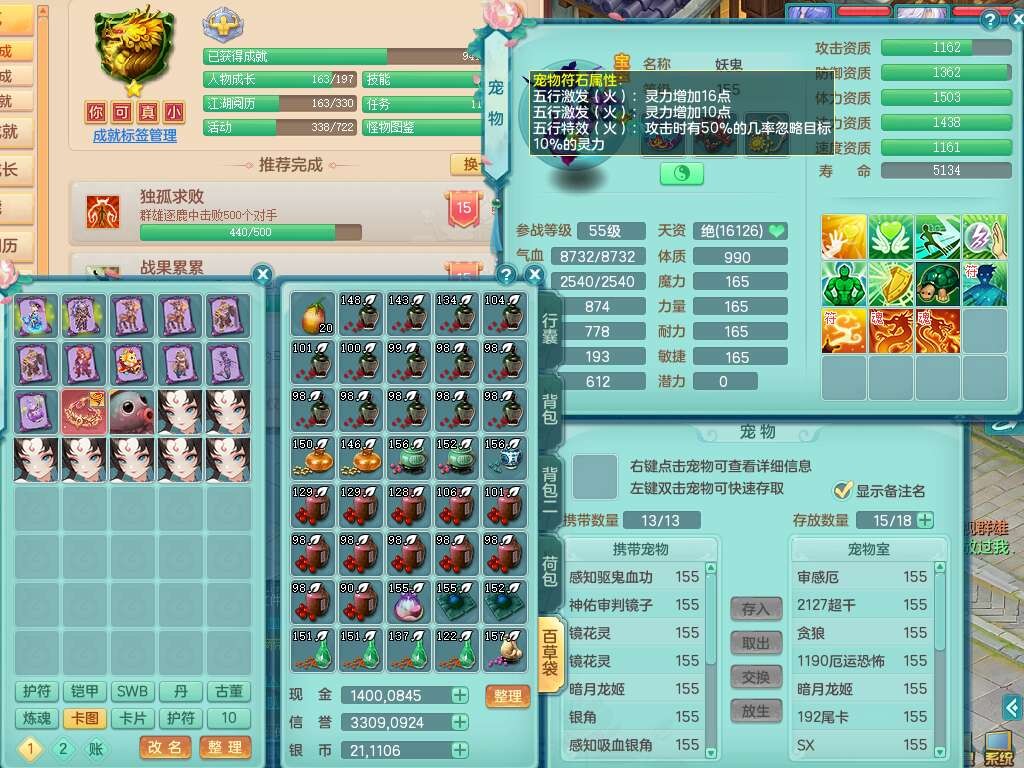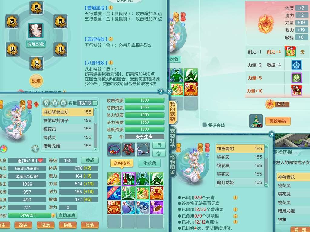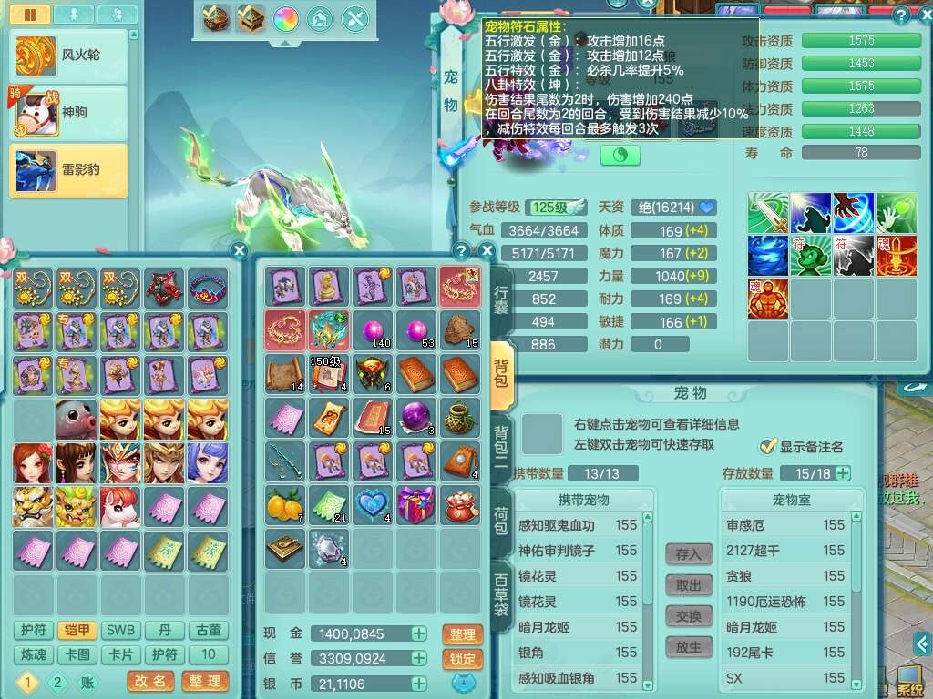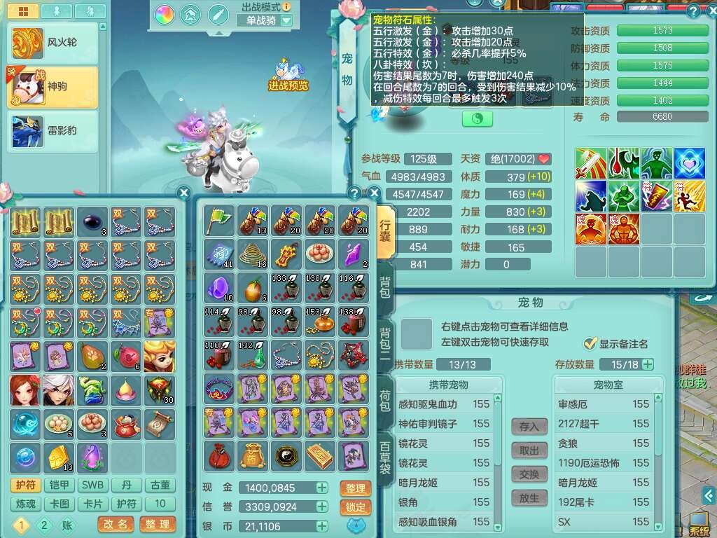 S22452三生万物159万兽,精灵舞,1内丹蛇,6觉醒,1宠皮,2只六技能镜花灵,2只六技能龙姬,1只九技能炼妖,三红匠心易成长崩山单加54头,932易成长罗汉武器,易成长疾速单加腰带,易成长单加57鞋子,5.0基础鼎,6个纯六字,2个五字,8只满果子,神驹马上发财,带2075金币,32个仙兽蛋,195天月卡。