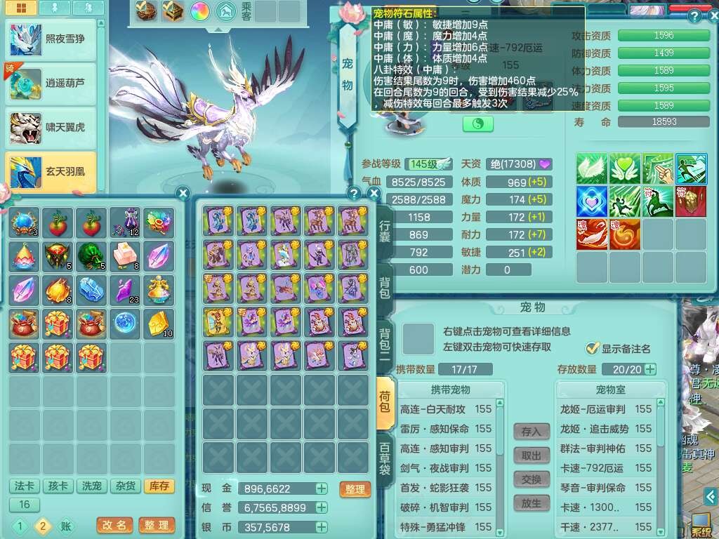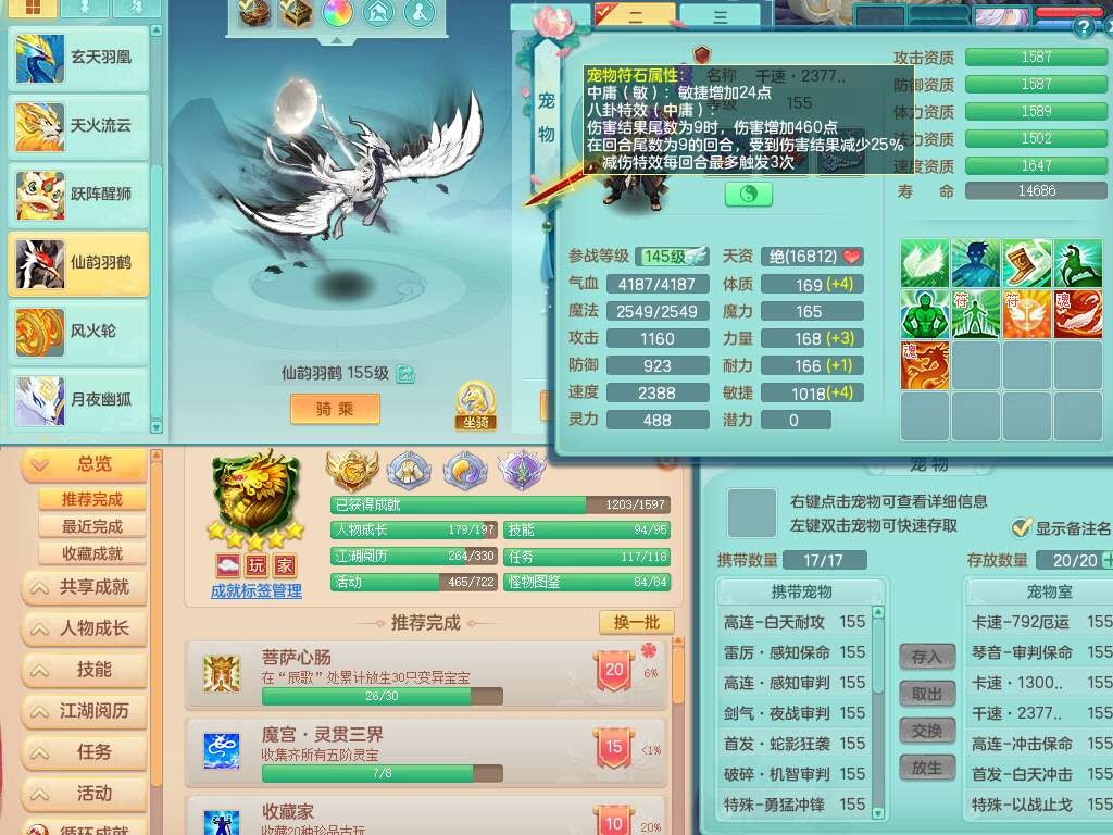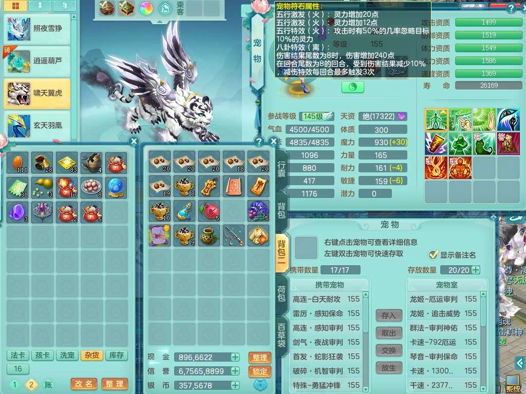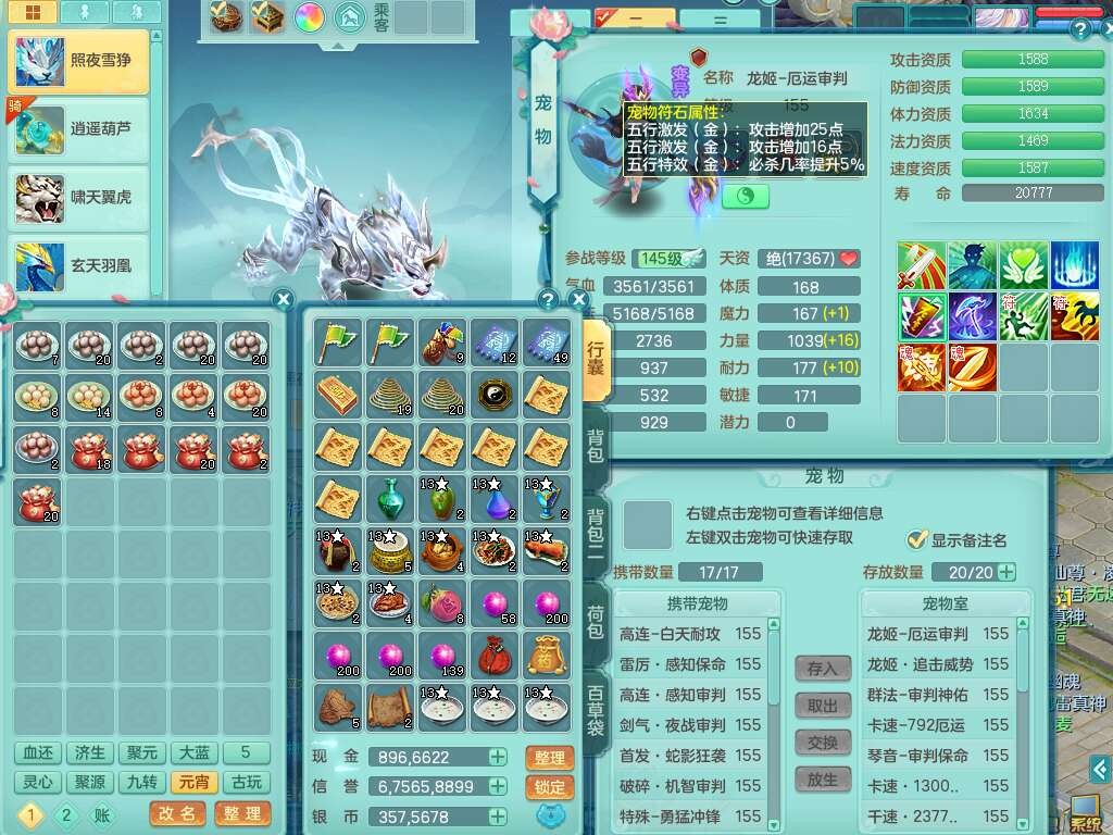 a22450任剑逍遥159男魔王,4龙3内胆神,5破镜,1神兽马+23个神兽内丹碎片,【17觉醒,已潜龙】,4位靓号不含4,8宠皮,5特殊(月光,勇猛,舍身,琴音,以战)3只六技能镜花灵,2只六技能龙姬,易成长单加53头,法爆单加56武器,易成长单加57衣服,266易成长单加56链子,五雷单加50鞋,5.5基础鼎+70攻+280血,15个永久格子,17个纯六字,2个五字,28只满果子,宠排在榜,经验修炼成就在榜,4个孩子,永久称谓,6只双人坐骑,带2180金币,357w神武币,141天月卡。➕159男无量,1神兽,1觉醒,1只六技能镜花灵,愤怒五特,4.5基础鼎,1个五字,1只满果子,双人坐骑,带168w神武币。➕151男鬼谷,1神兽。