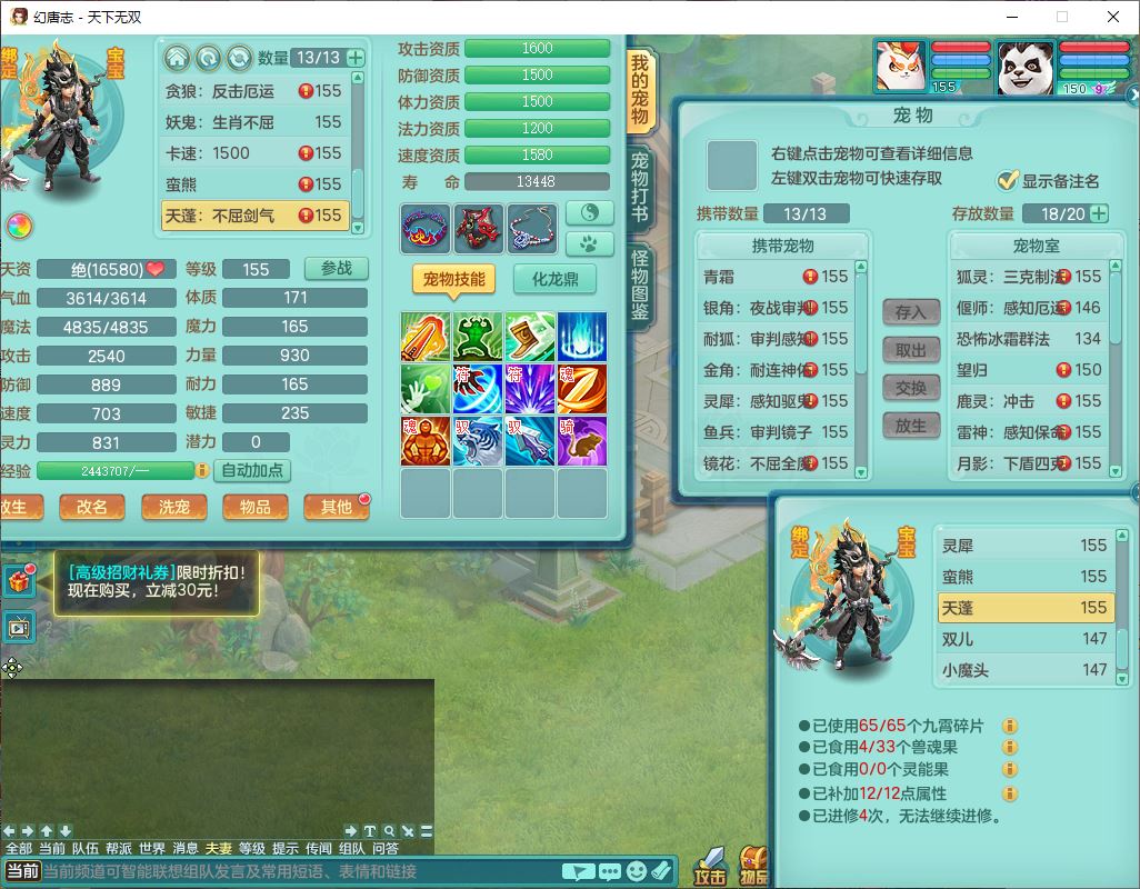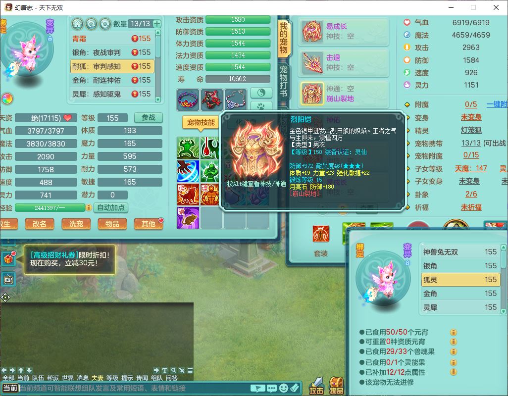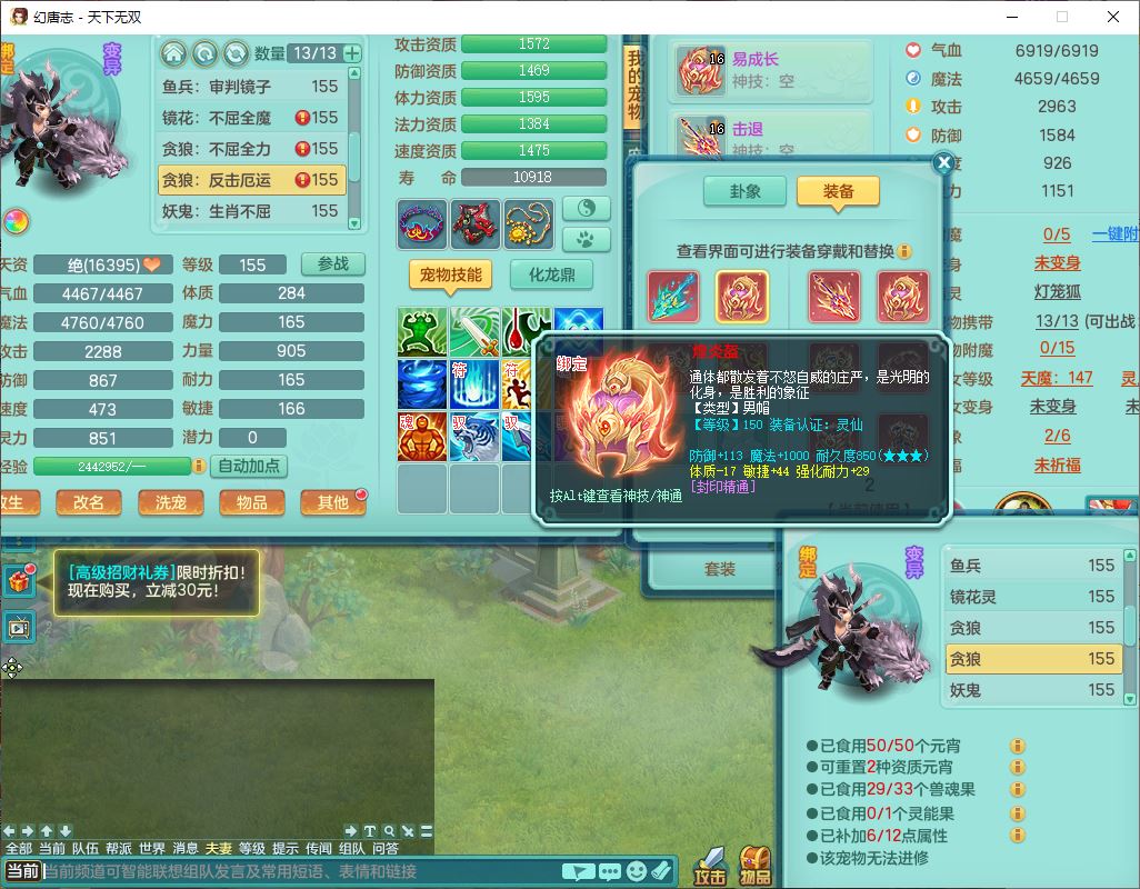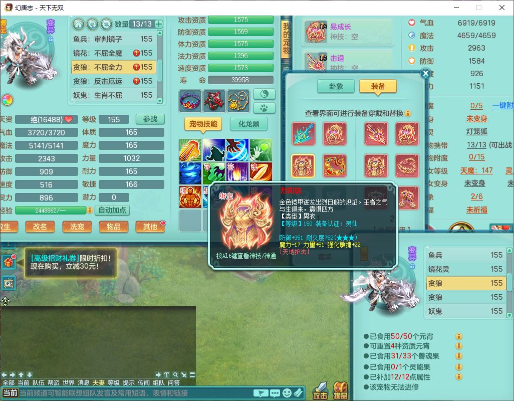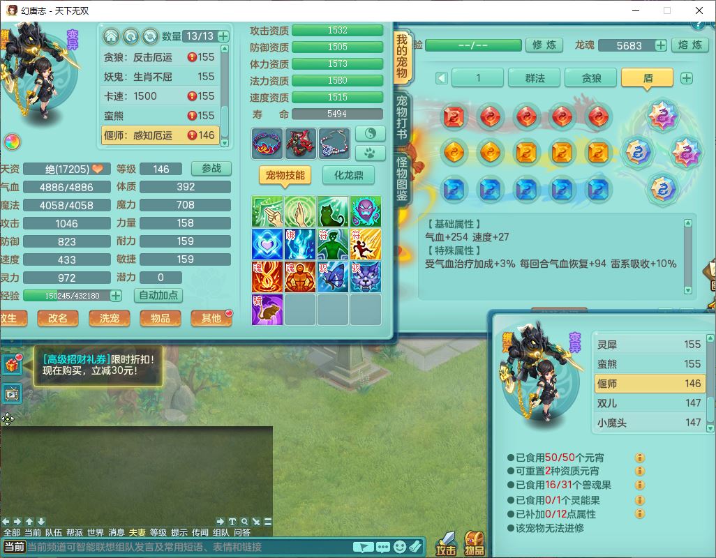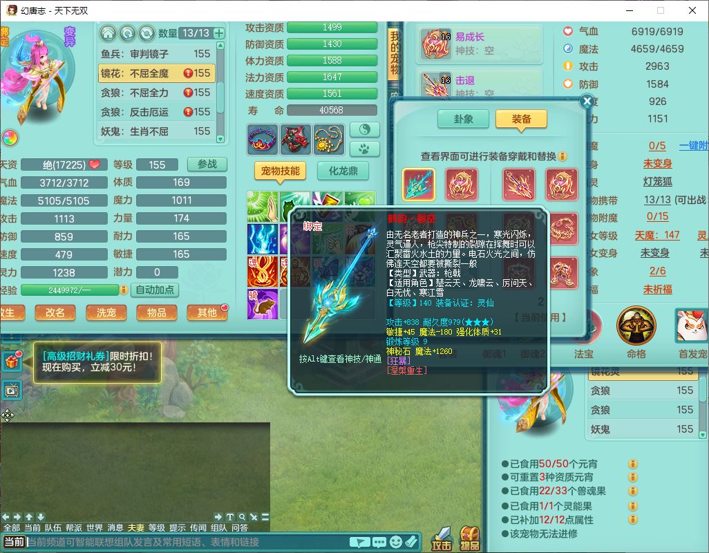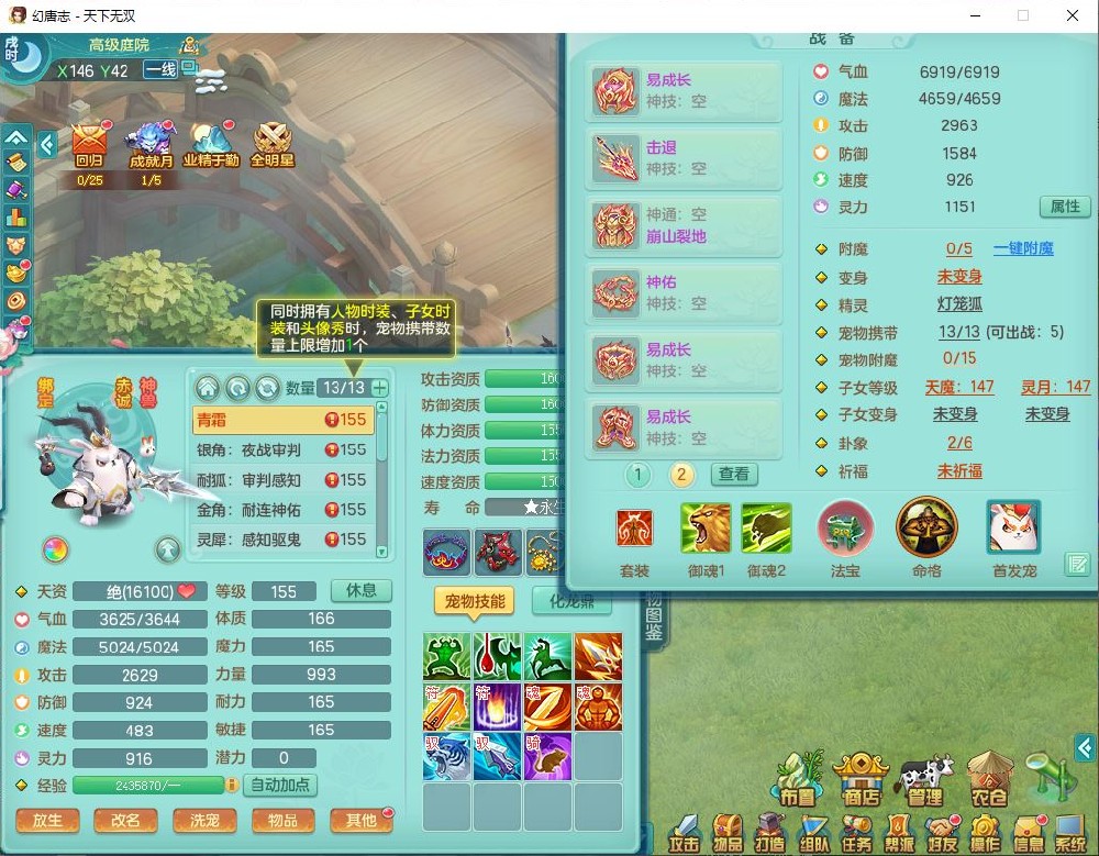 tx10528天下无双159男万兽精灵歌,1神兽(无内)1六技能镜花鱼兵1镜花,宝宝种类齐全,综合6只满果子,装备齐全,击退武器,崩山衣服,神佑项链,狂暴慈航武器,封印精通帽子,鼎5.5,2套符石,250多w神武币,33个内丹碎片,1霜鹿坐骑