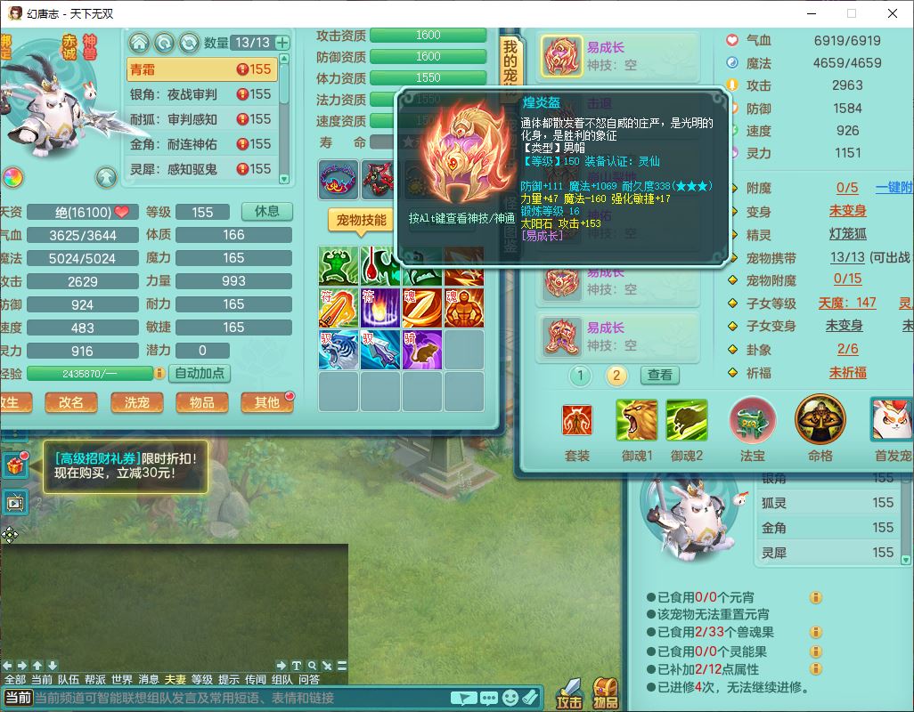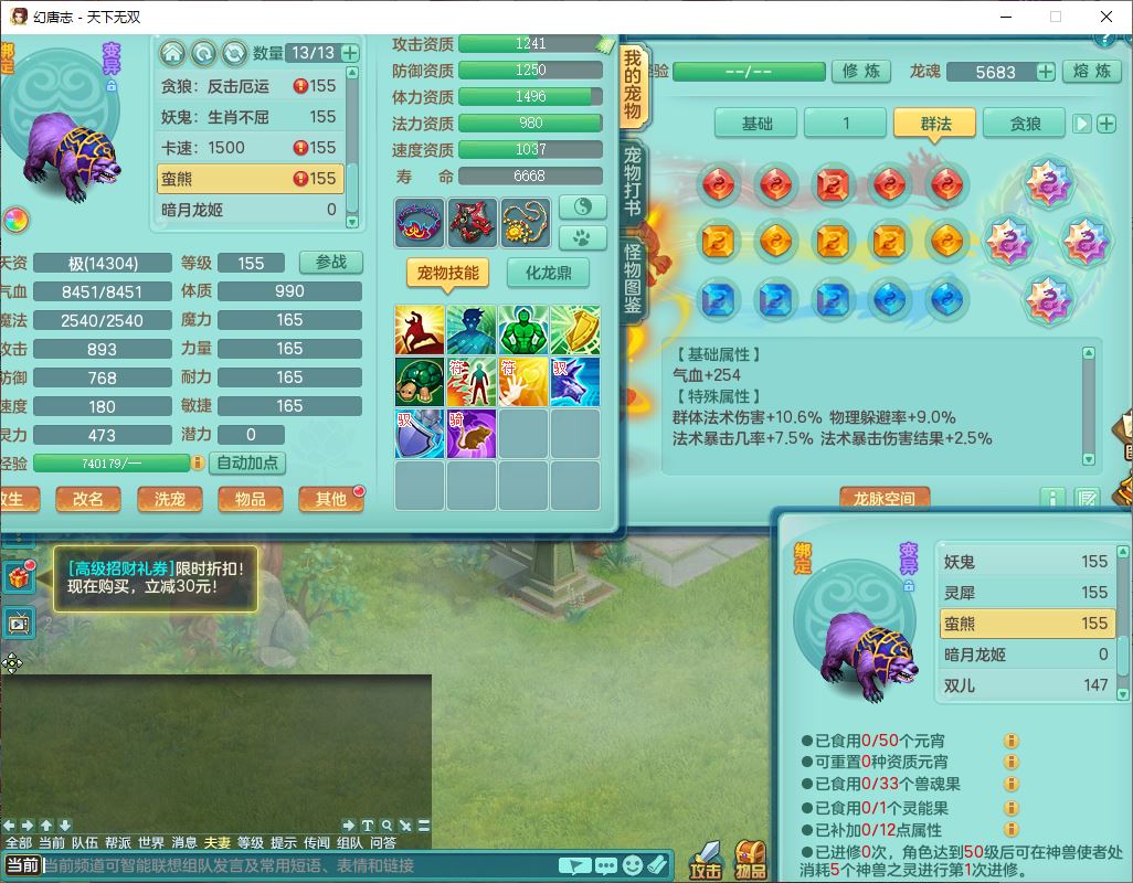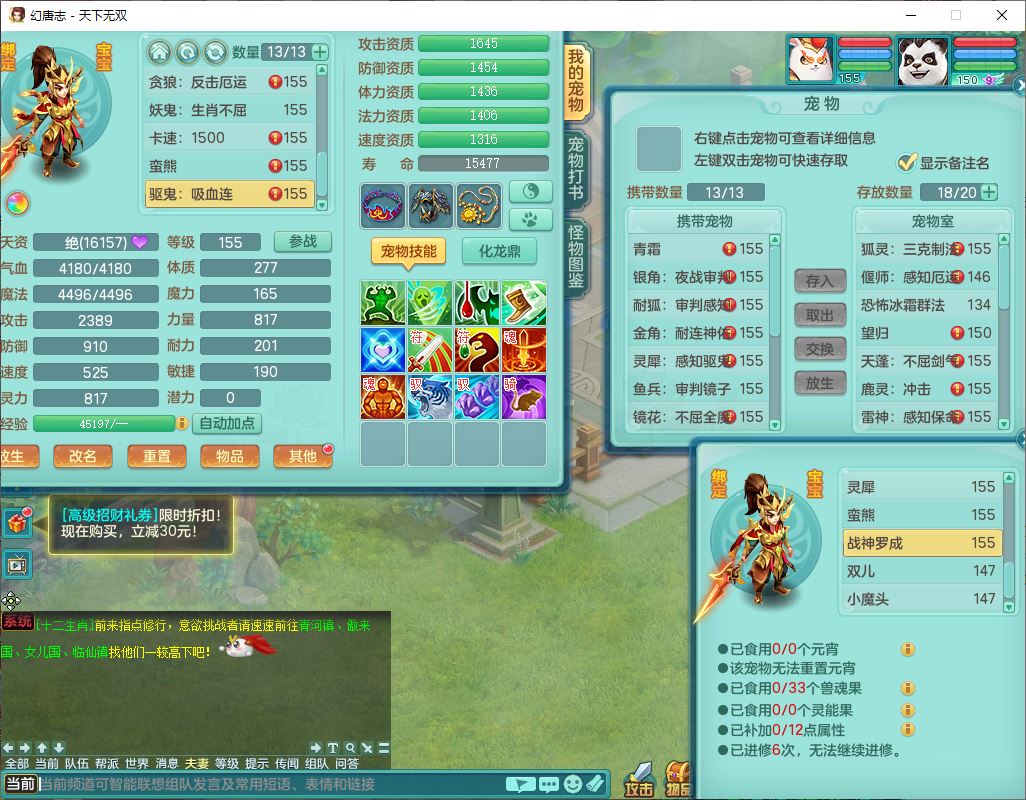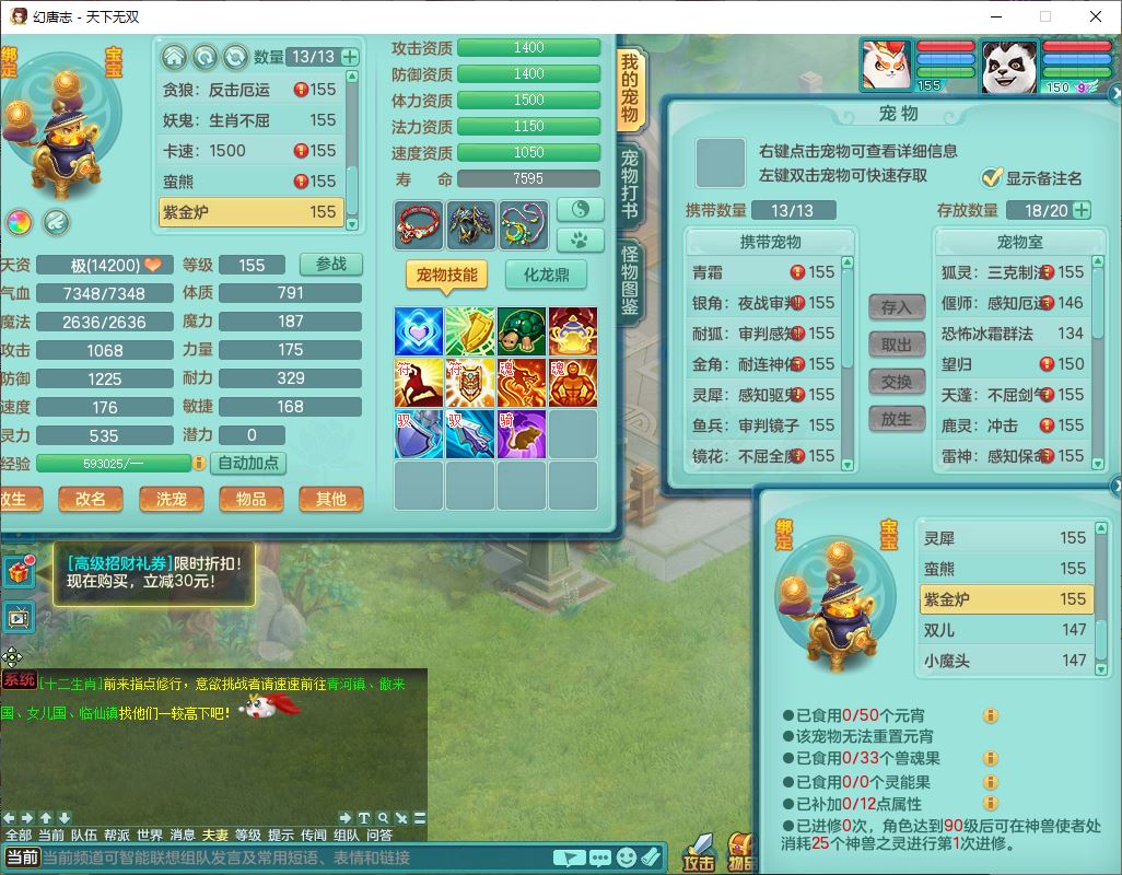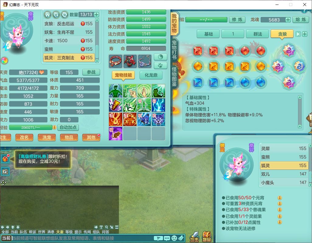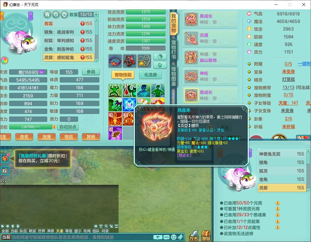 tx10528天下无双159男万兽精灵歌,1神兽(无内)1六技能镜花鱼兵1镜花,宝宝种类齐全,综合6只满果子,装备齐全,击退武器,崩山衣服,神佑项链,狂暴慈航武器,封印精通帽子,鼎5.5,2套符石,250多w神武币,33个内丹碎片,1霜鹿坐骑