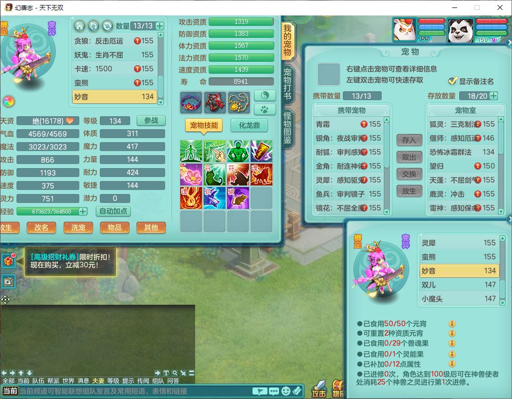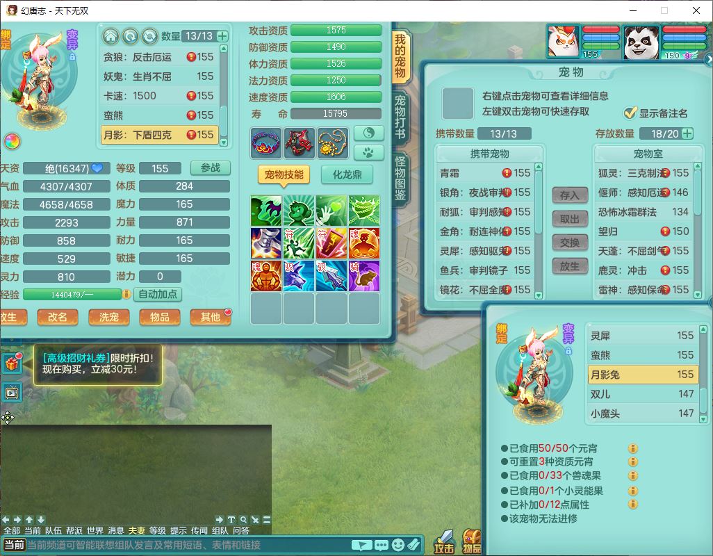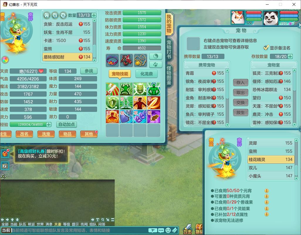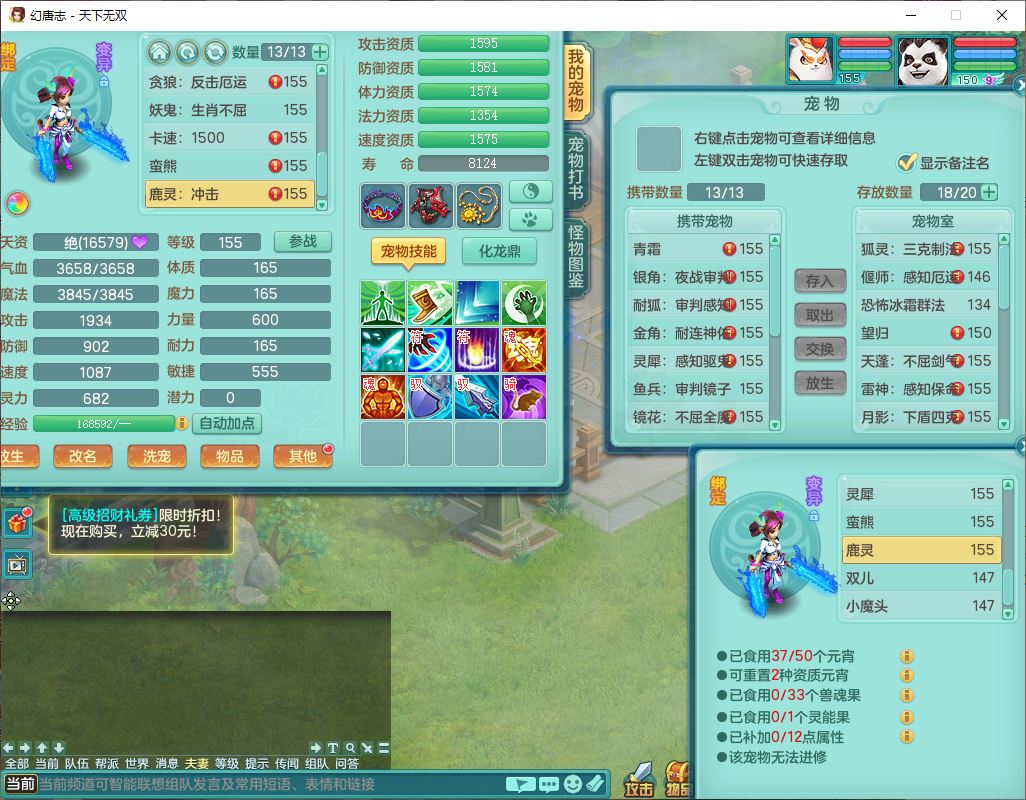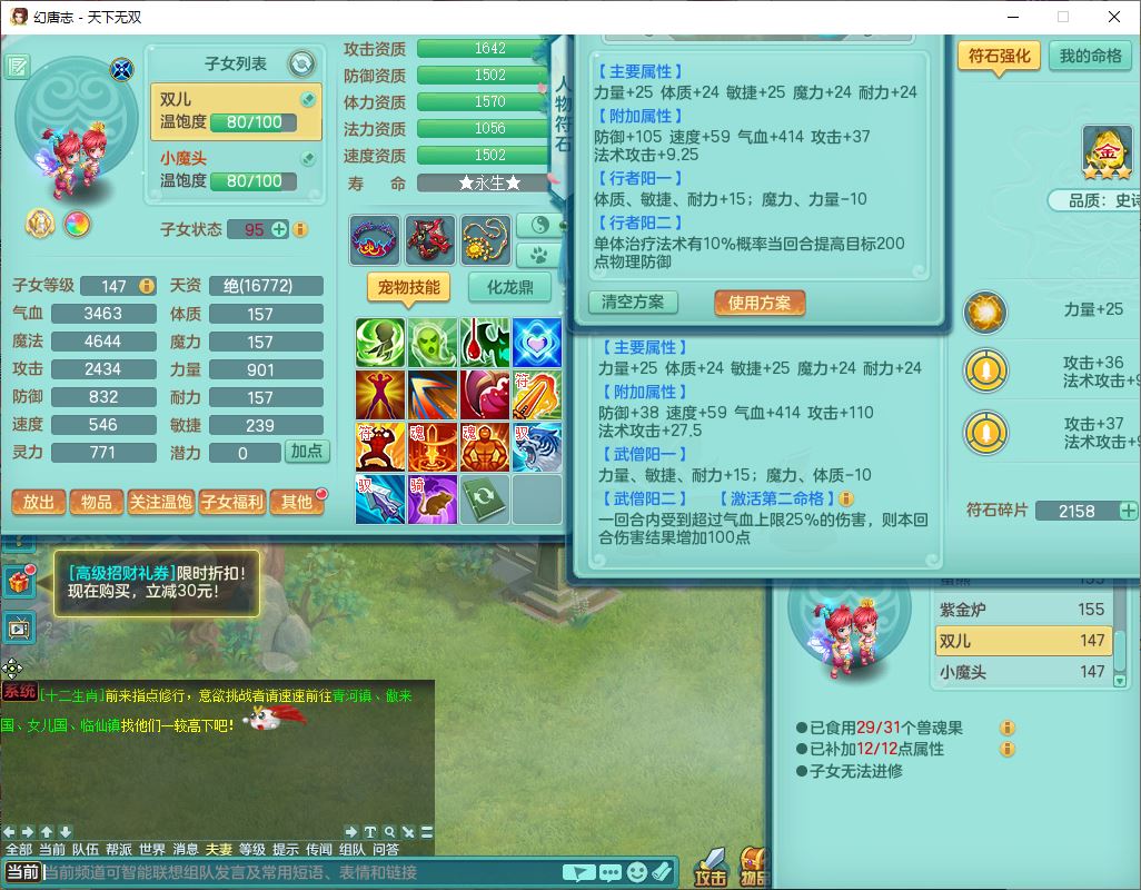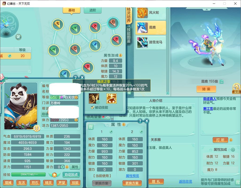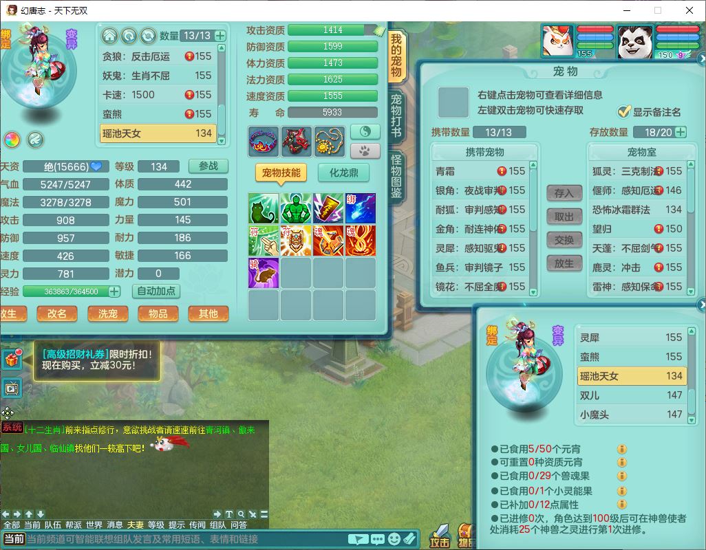 tx10528天下无双159男万兽精灵歌,1神兽(无内)1六技能镜花鱼兵1镜花,宝宝种类齐全,综合6只满果子,装备齐全,击退武器,崩山衣服,神佑项链,狂暴慈航武器,封印精通帽子,鼎5.5,2套符石,250多w神武币,33个内丹碎片,1霜鹿坐骑